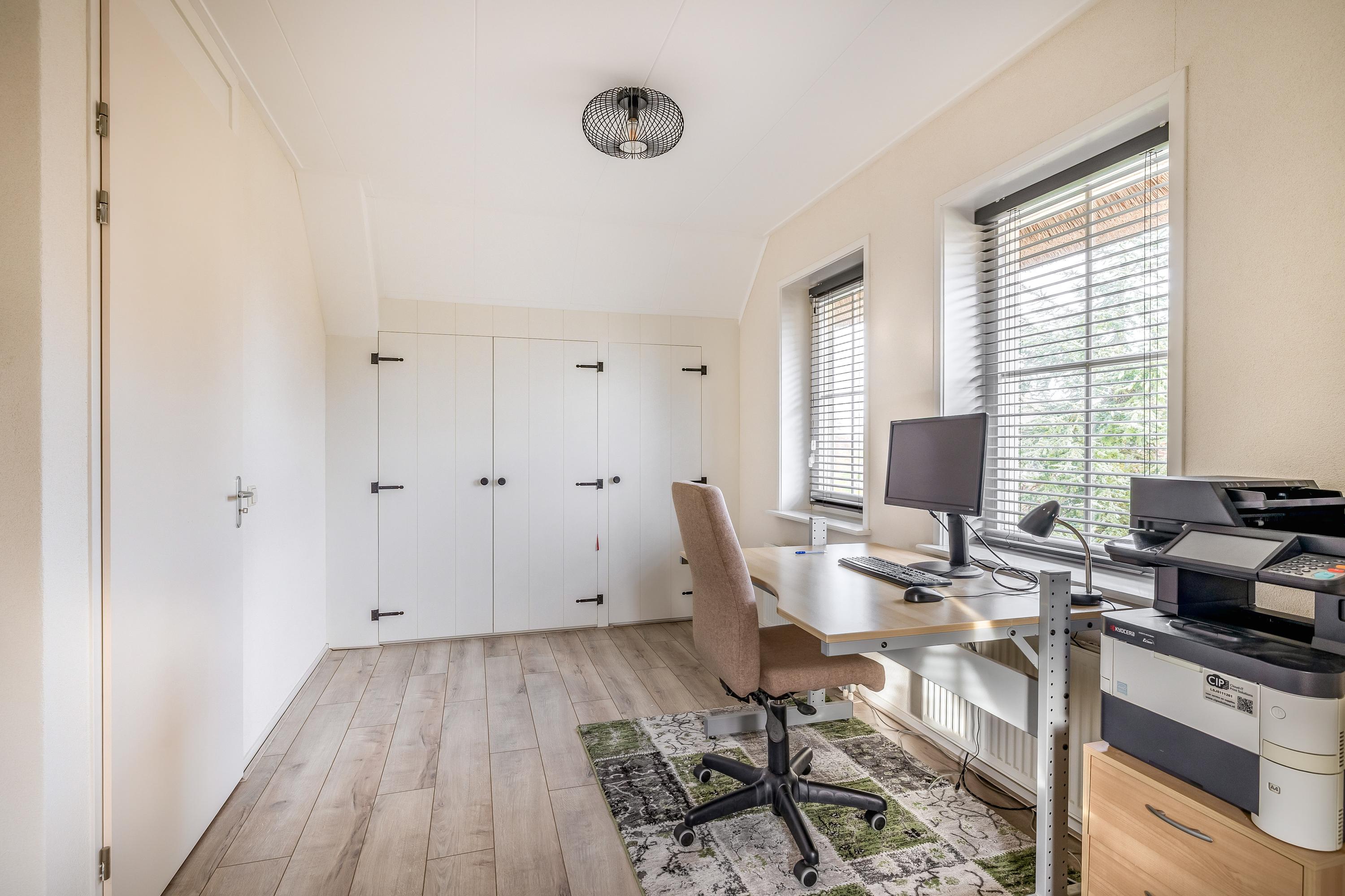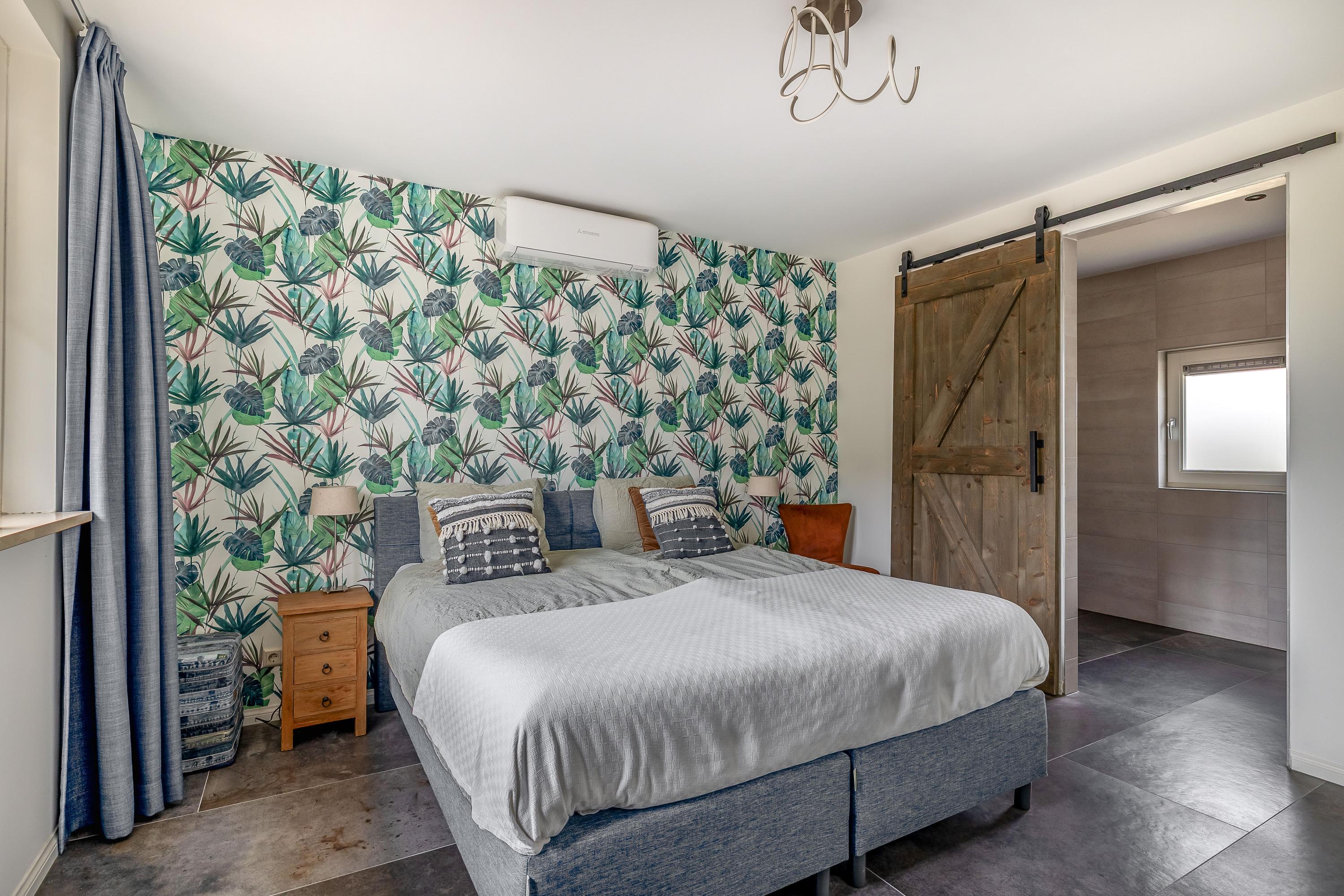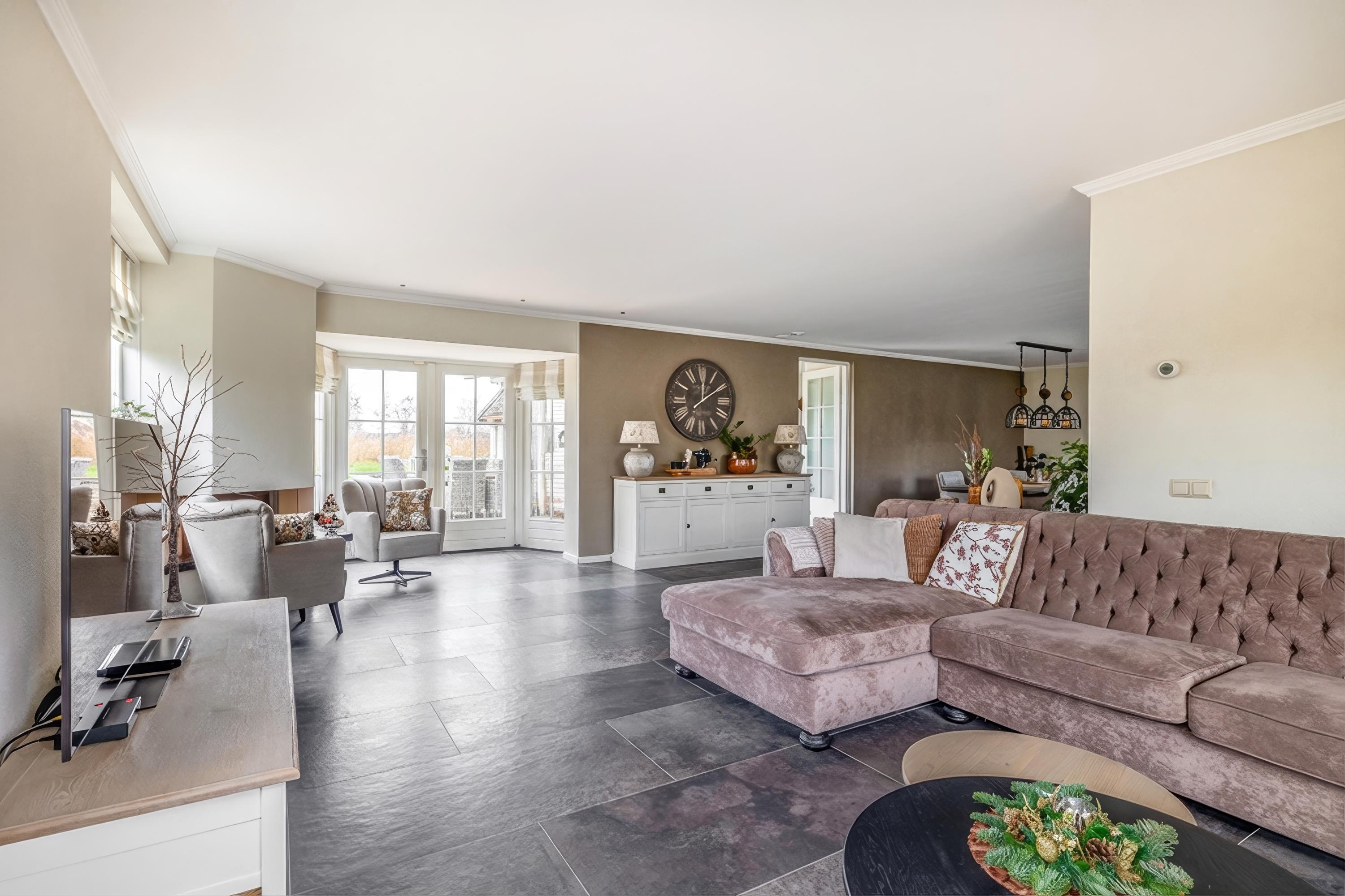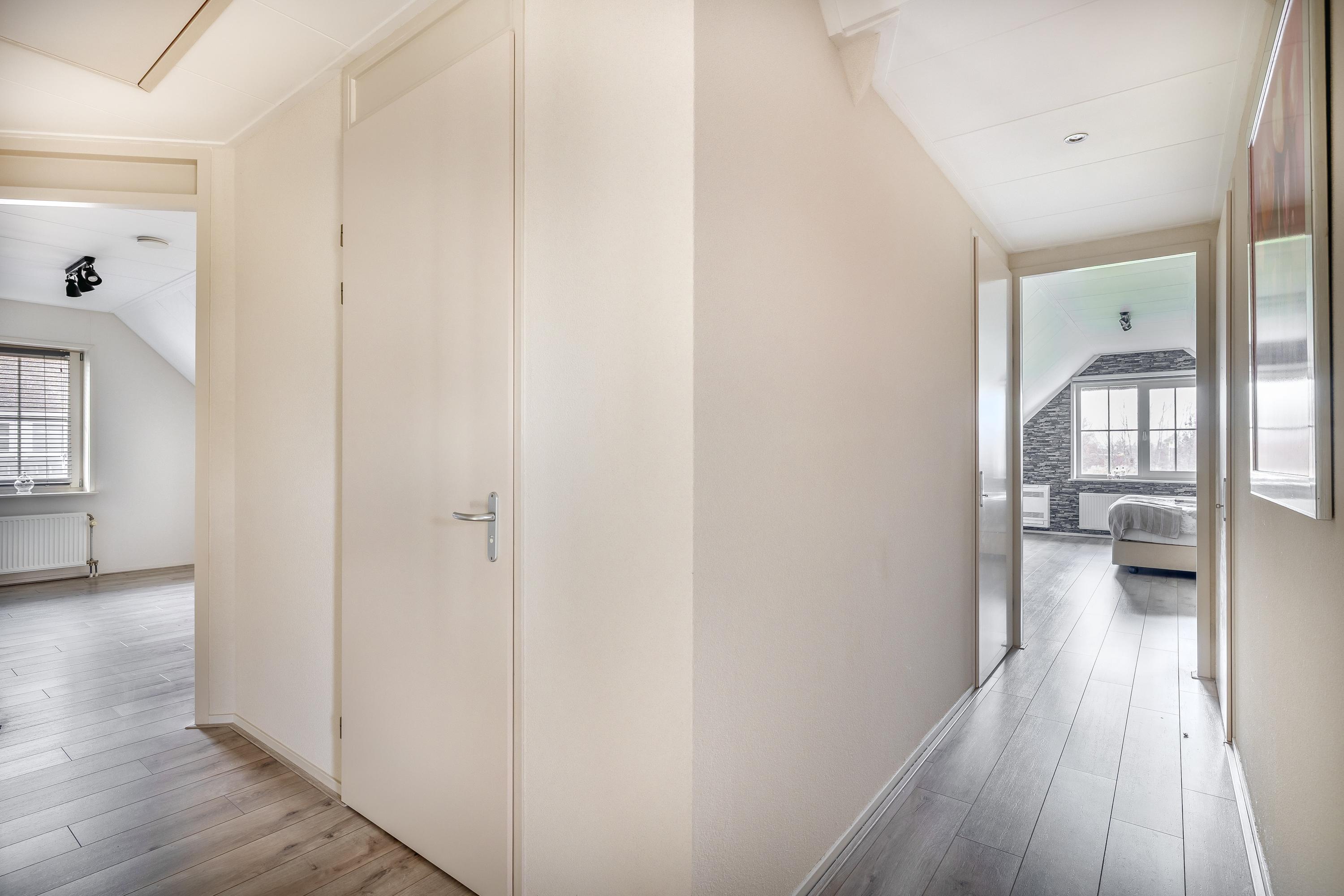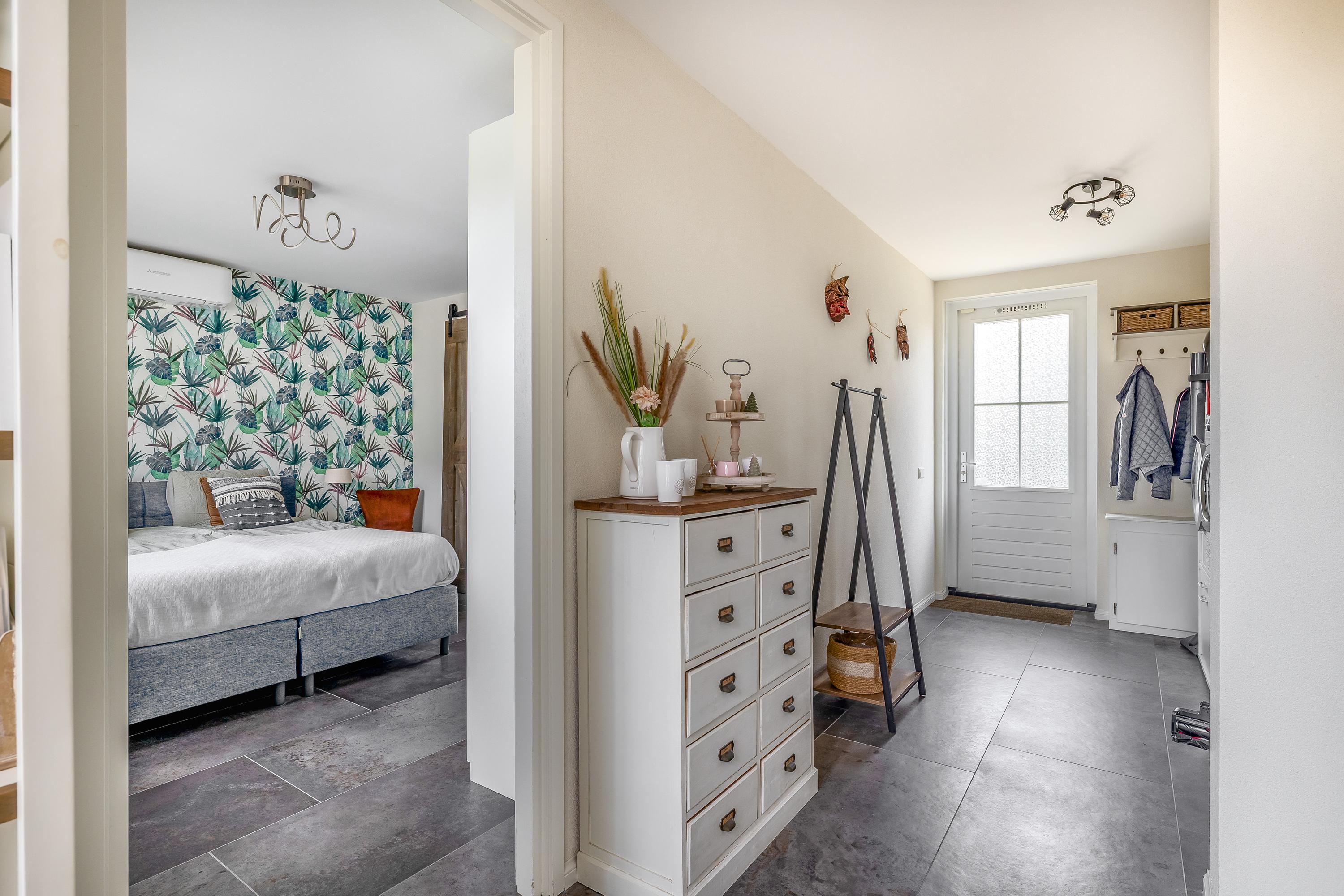 Through the stylish entrance you enter a spacious hallway with a renovated floating toilet and washbasin. Double doors lead to the very generous living area, which was completely renovated in 2022. The living space consists of a luxury open-plan kitchen, dining area and sitting area with bay window and French doors opening onto the terrace. The modern kitchen is fully equipped: an induction hob with Bora extraction, two identical combination ovens, a large refrigerator and freezer, dishwasher, Quooker and a composite worktop. In the utility room you will find connections for a washing machine and dryer, as well as a door to the outside. Thanks to the large windows and the bay window with French doors, daylight floods in abundantly. The atmospheric gas fireplace and recessed spotlights complete the picture. Also on the ground floor is a spacious bedroom with custom-made wardrobes and a luxury en-suite bathroom (2022) with walk-in shower, floating toilet, washbasin unit and designer radiator. This makes single-level living possible without sacrificing comfort.
