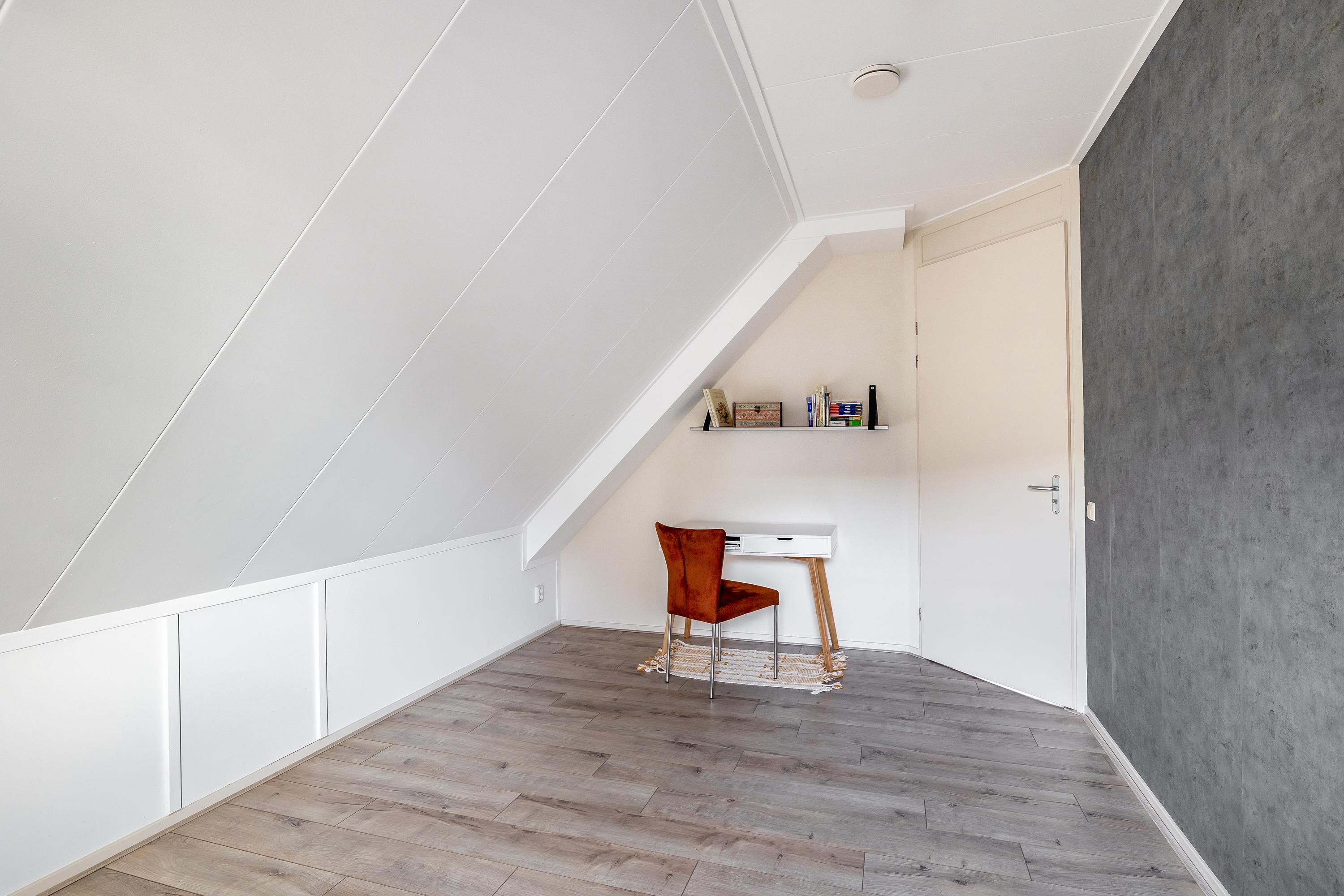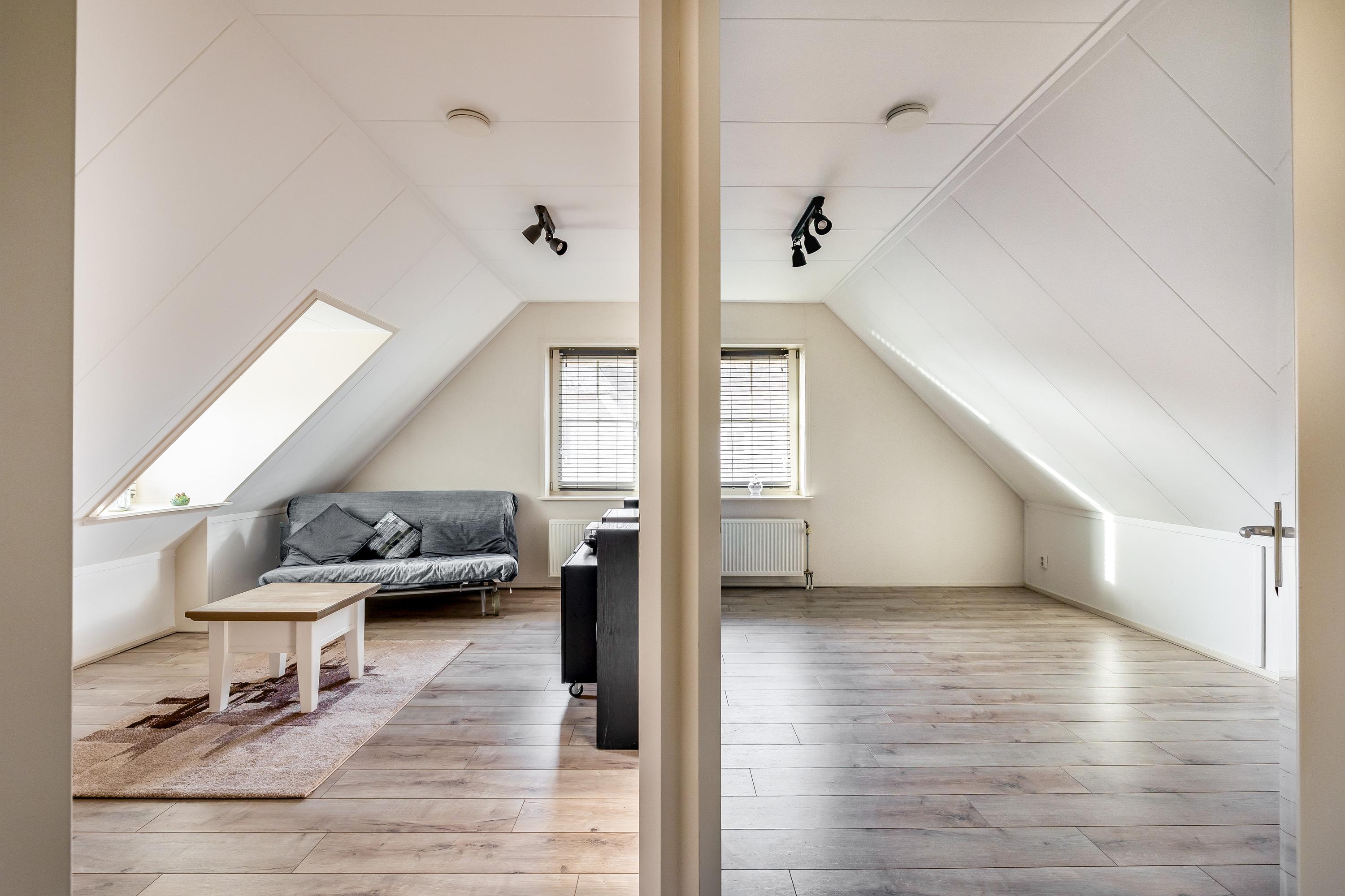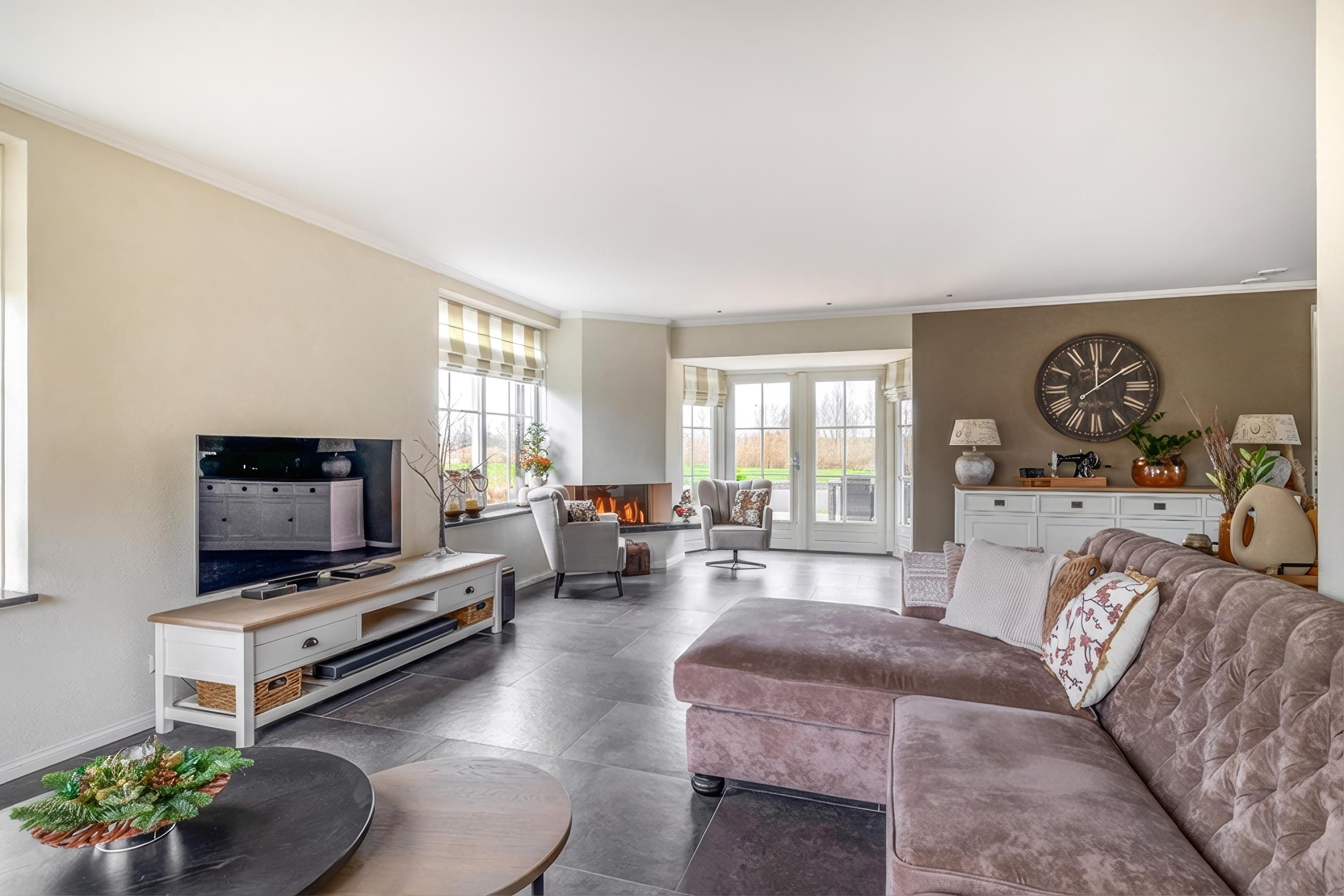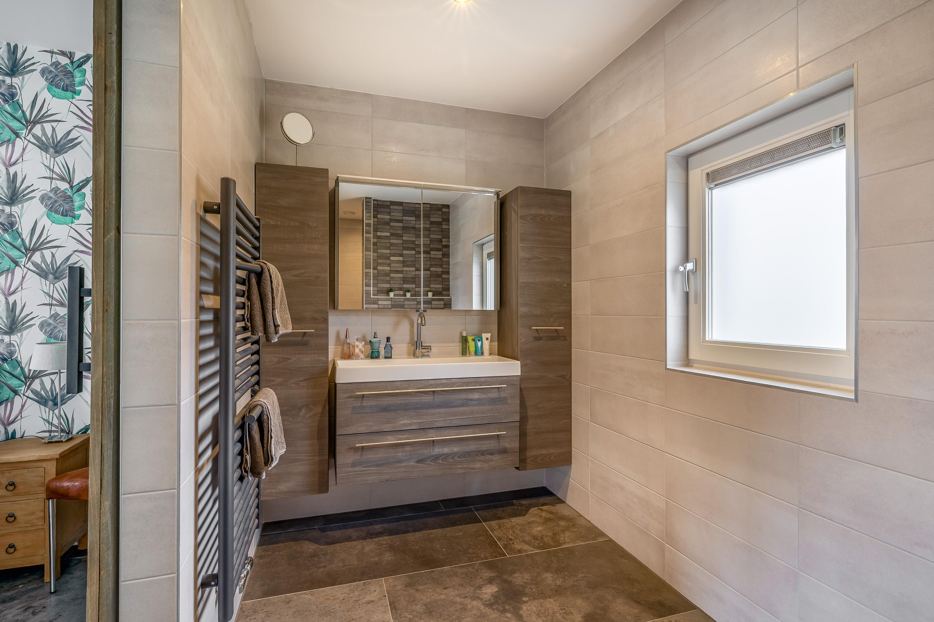 Through the stylish entrance you enter a spacious hallway with a renovated floating toilet and washbasin. Double doors lead to the very generous living area, which was completely renovated in 2022. The living space consists of a luxury open-plan kitchen, dining area and sitting area with bay window and French doors opening onto the terrace. The modern kitchen is fully equipped: an induction hob with Bora extraction, two identical combination ovens, a large refrigerator and freezer, dishwasher, Quooker and a composite worktop. In the utility room you will find connections for a washing machine and dryer, as well as a door to the outside. Thanks to the large windows and the bay window with French doors, daylight floods in abundantly. The atmospheric gas fireplace and recessed spotlights complete the picture. Also on the ground floor is a spacious bedroom with custom-made wardrobes and a luxury en-suite bathroom (2022) with walk-in shower, floating toilet, washbasin unit and designer radiator. This makes single-level living possible without sacrificing comfort.
