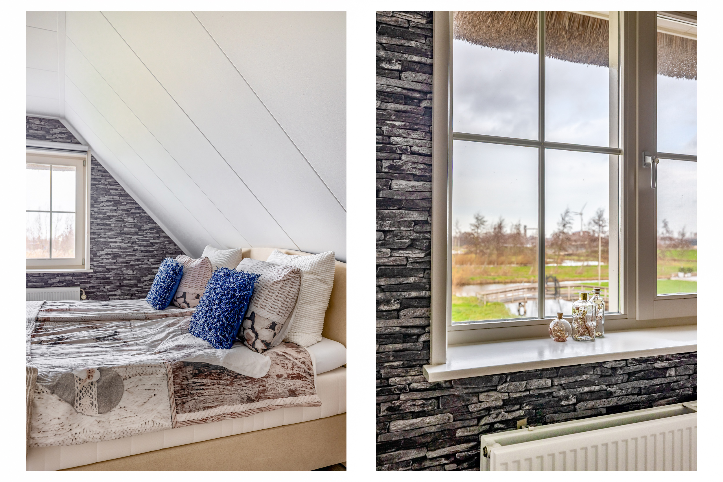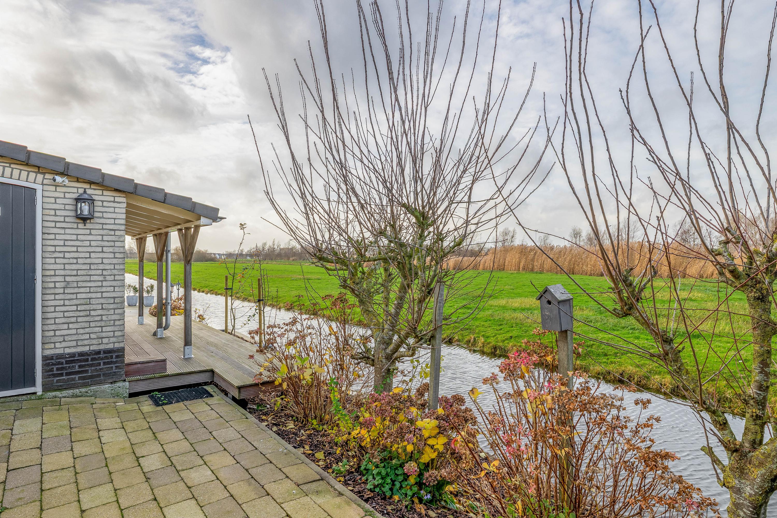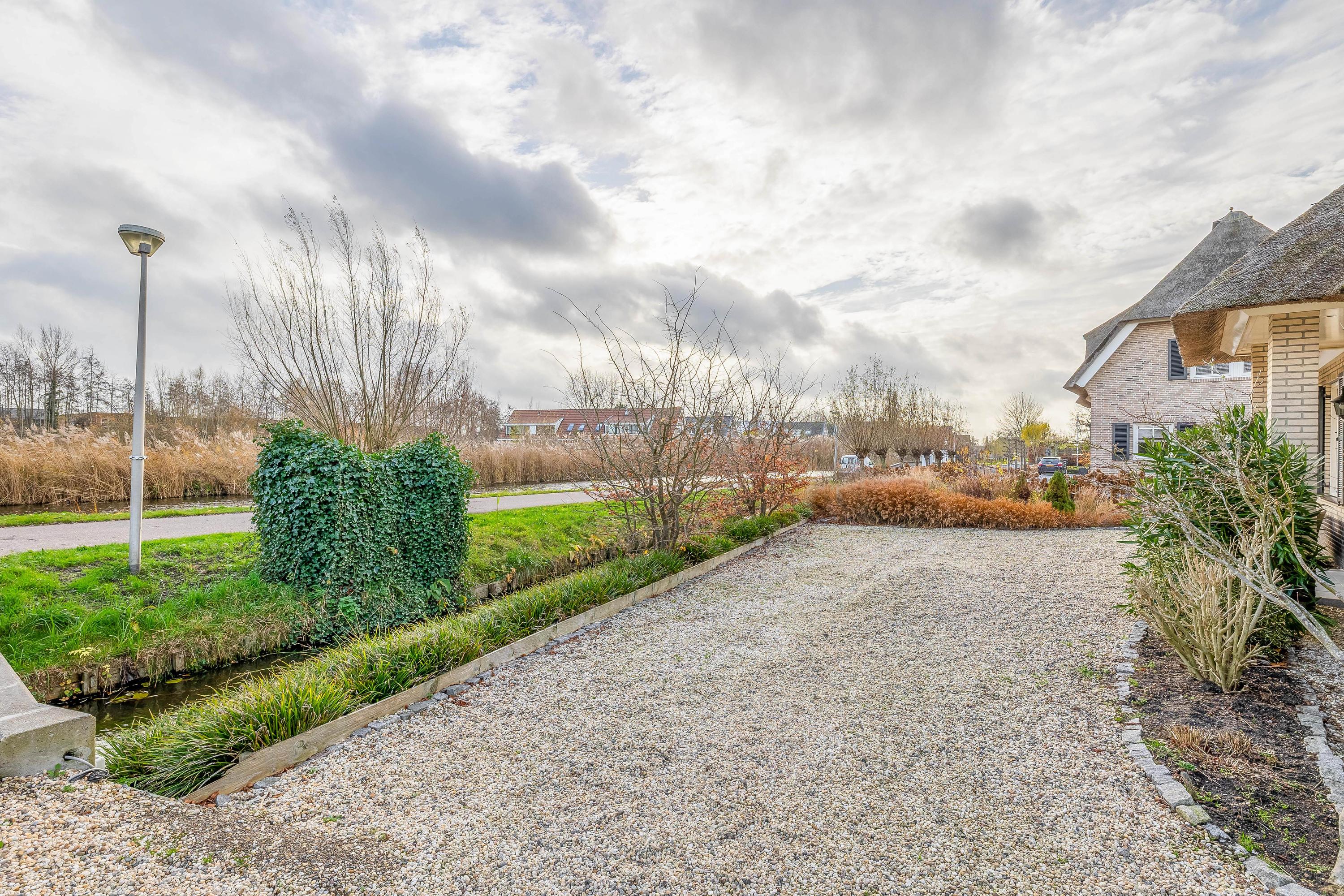 The garden has been attractively and carefully landscaped. At the rear there is a large piled terrace, ideal for a dining table or lounge set. In 2024, a new wooden deck was installed directly by the water, where you can enjoy complete privacy and stunning views over the surrounding countryside. At the front there is a bridge over the water leading to the driveway with space for multiple cars. The practical storage shed is ideal for bicycles or a motorcycle and is accessible from both the garden and the parking area. At the front of the house there is a charging point for an electric car.