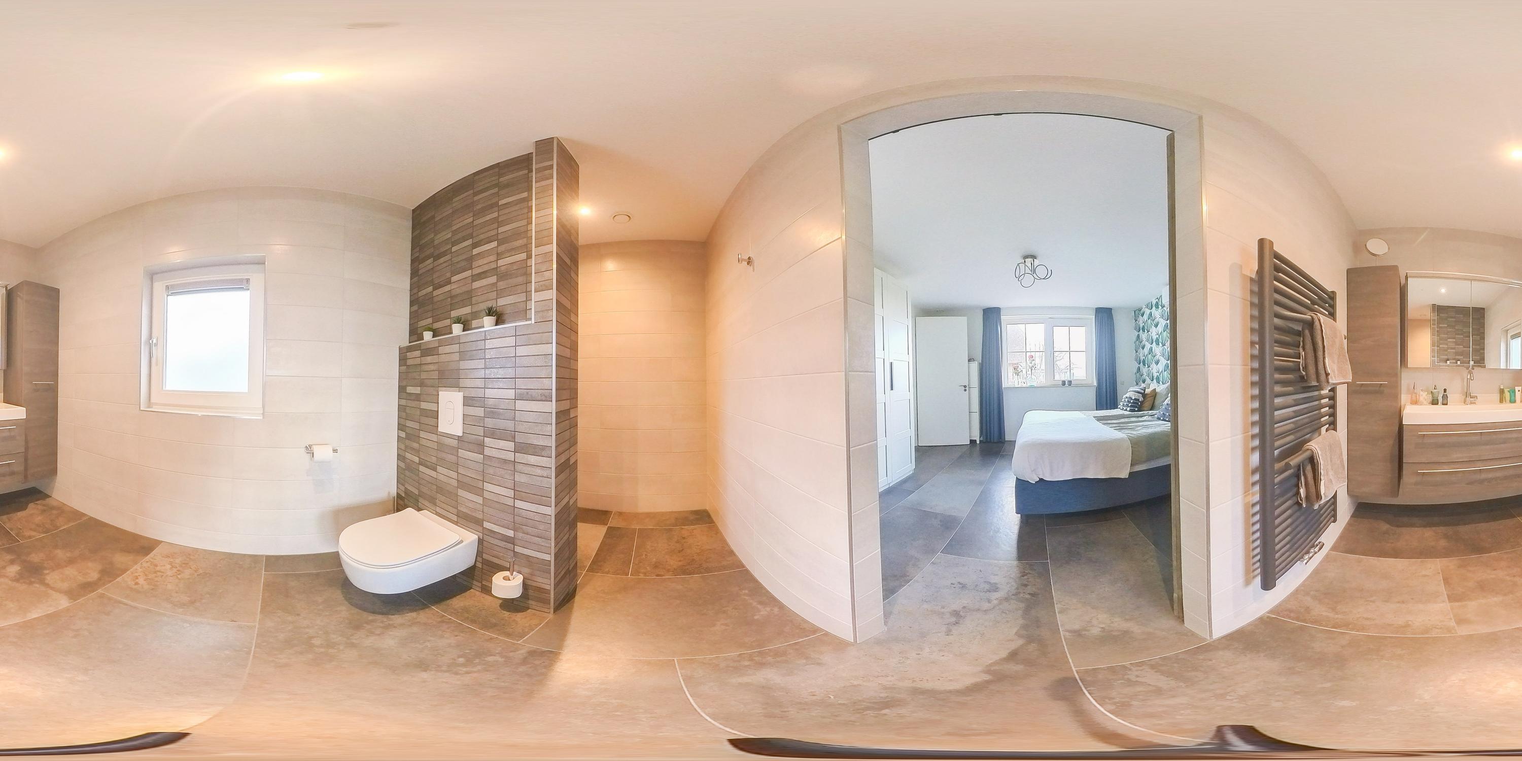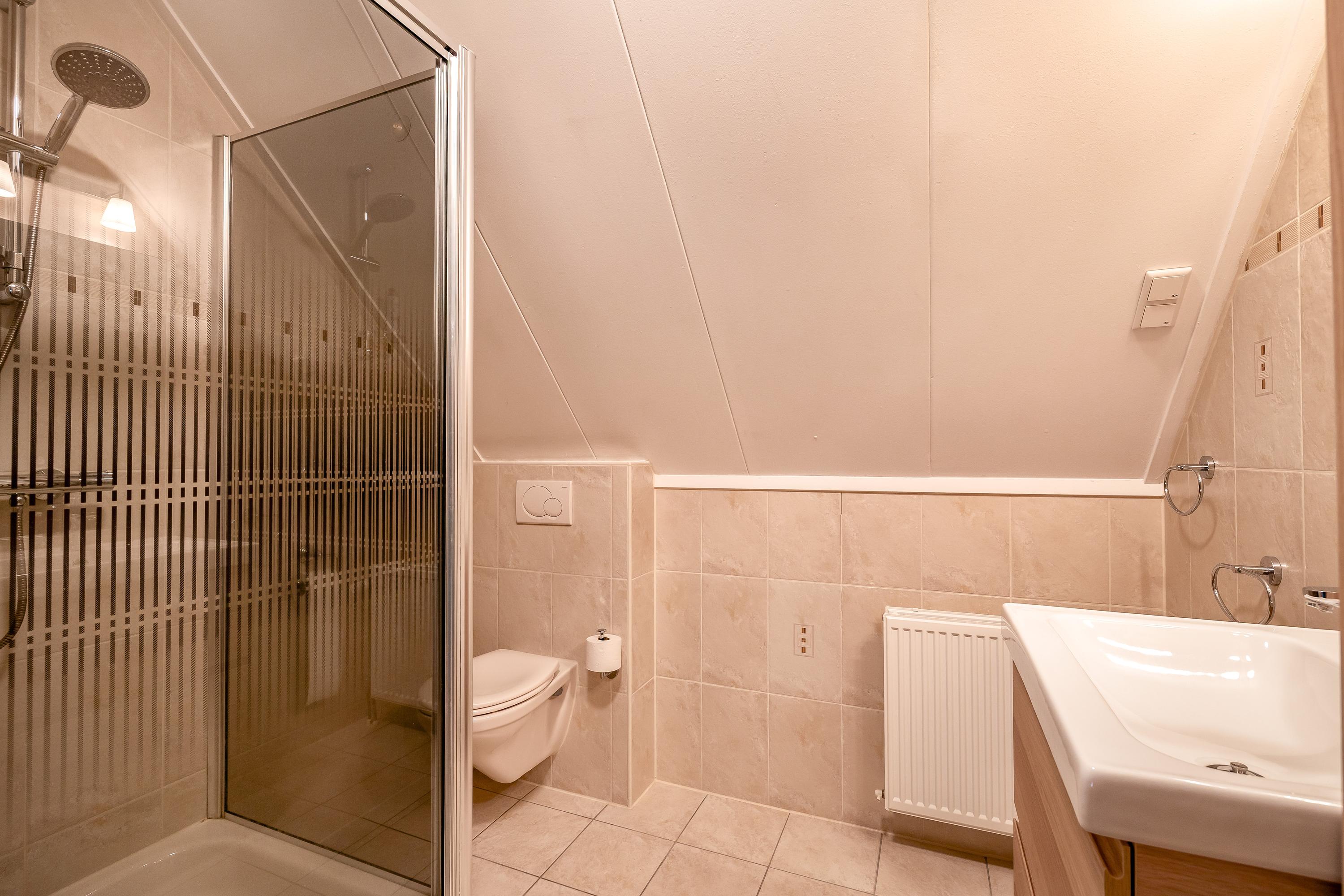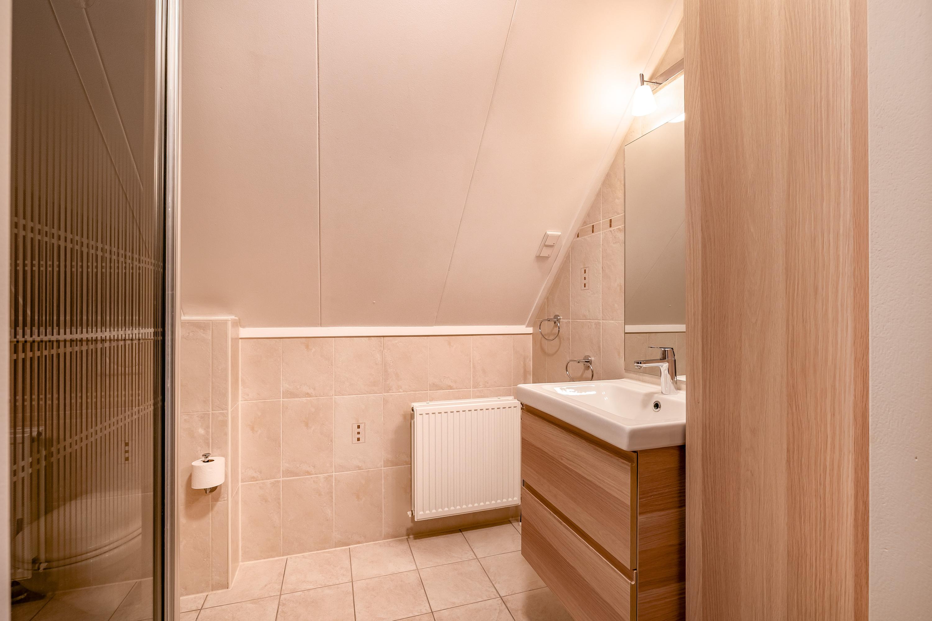 The first floor features four well-proportioned bedrooms, two of which have dormer windows. One bedroom has a walk-in closet, another is equipped with air conditioning and built-in wardrobes. The entire floor was fitted with new laminate flooring in 2018 and professionally painted. Everything has been taken care of here as well: a second bathroom with shower, washbasin and floating toilet, and a separate cupboard housing the central heating system and heat recovery unit (WTW). The second floor is accessible via a loft ladder and offers a practical storage attic.