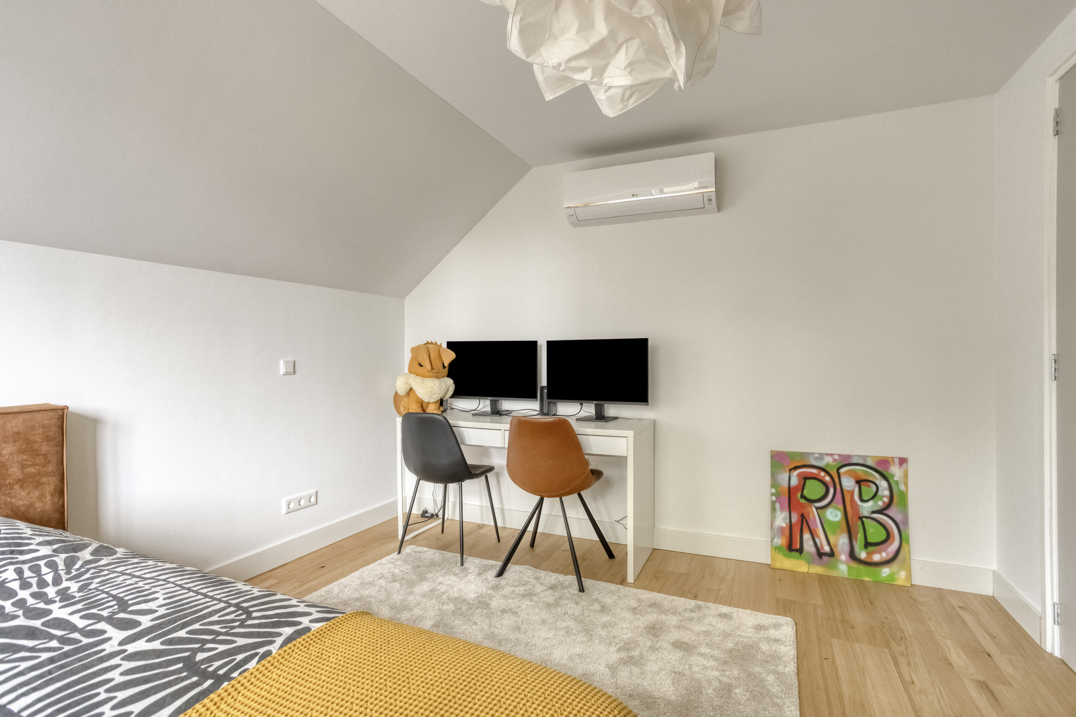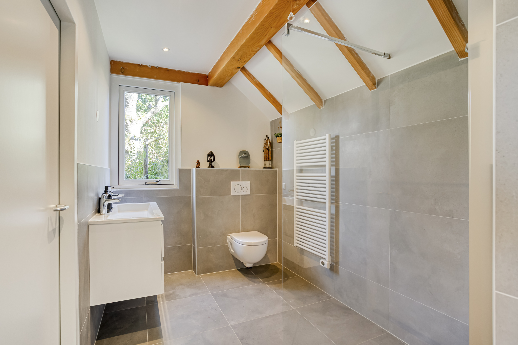 Bright and inviting, with French doors leading to the garden and a cozy wood-burning stove for winter nights. High ceilings and original exposed beams complete the picture. Part of the garage has been integrated into the living area, creating even more space! Planning an extension? The foundation is already in place.
