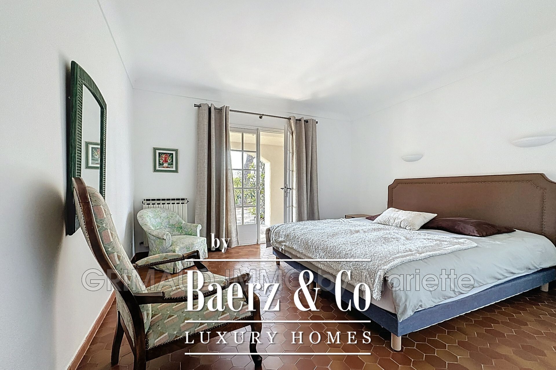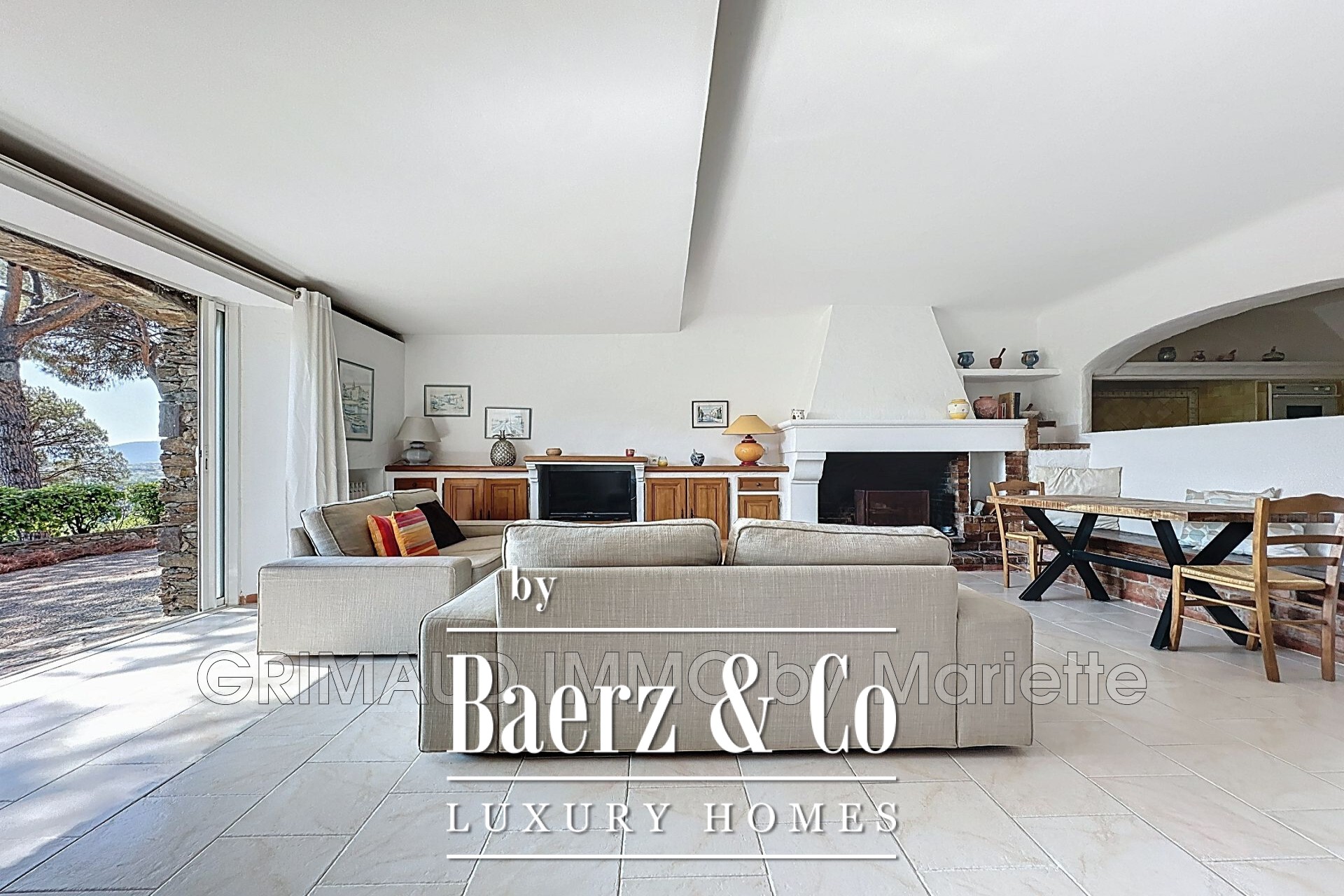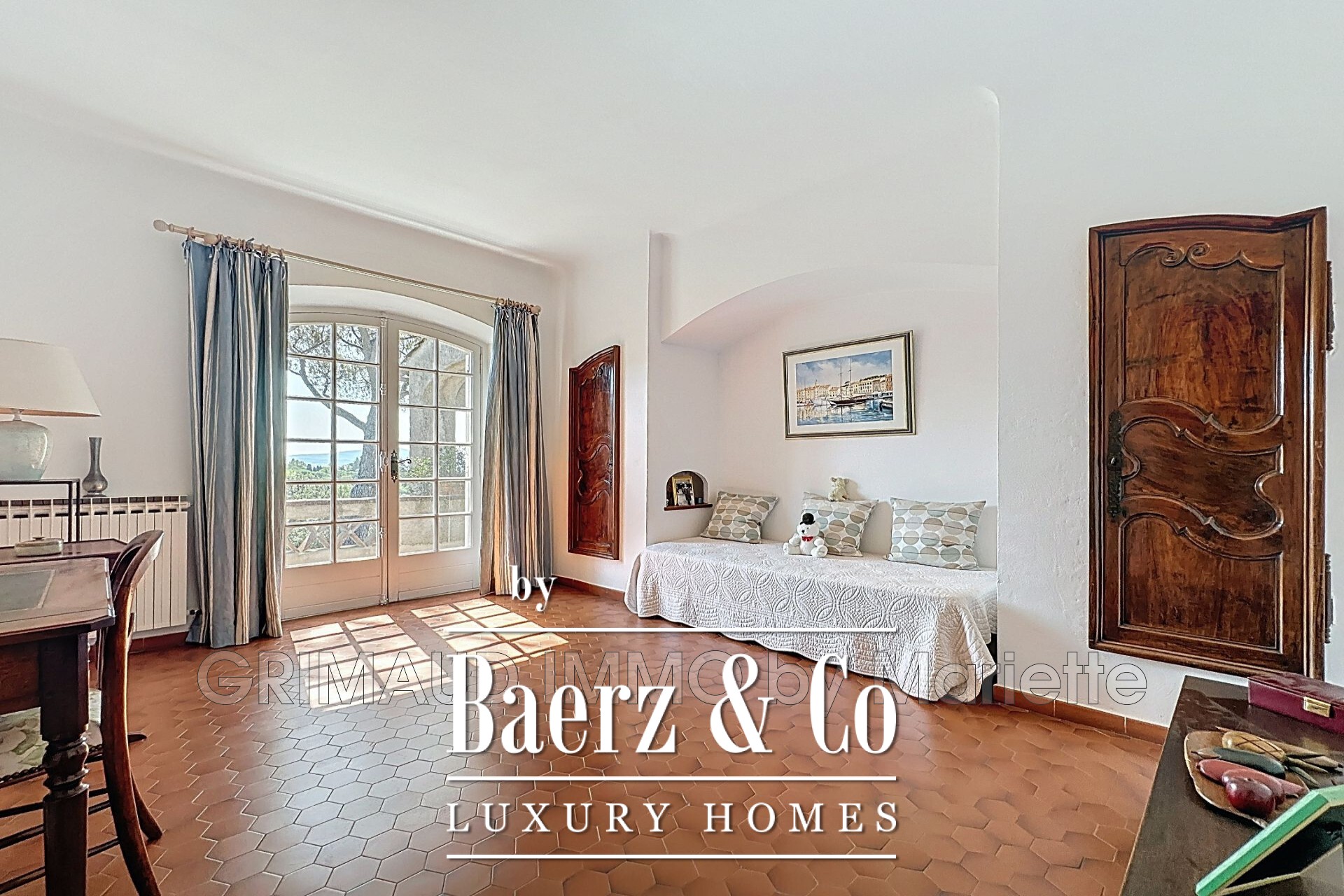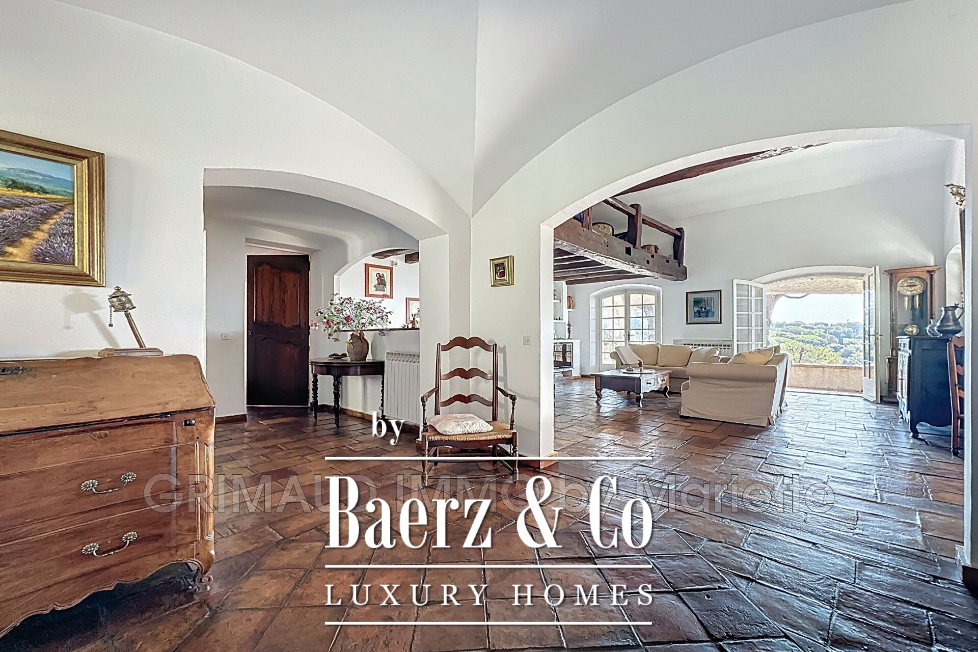 In a peaceful and green setting, this charming villa with a Provençal style is situated on a large plot of 4,086 m² with a garage, offering a panoramic view of the village of Grimaud and the surrounding hills. Divided into two separate living spaces, it comfortably accommodates family and guests or can be used to create an independent living area. The main part, located on the upper floor, includes an entrance with guest toilets, a spacious bright living room with a fireplace, a dining room extended by a fully equipped kitchen, a pantry, two bedrooms