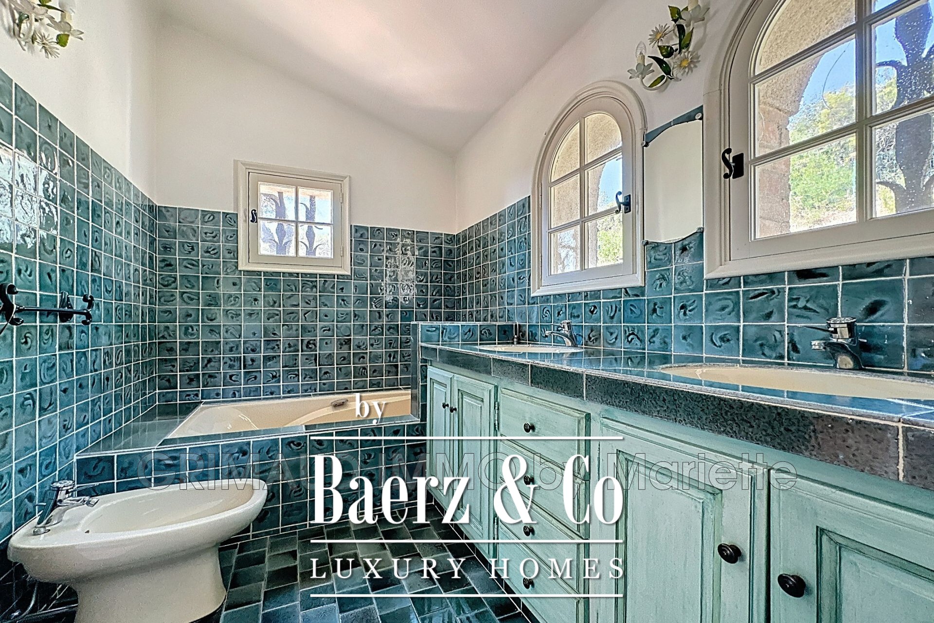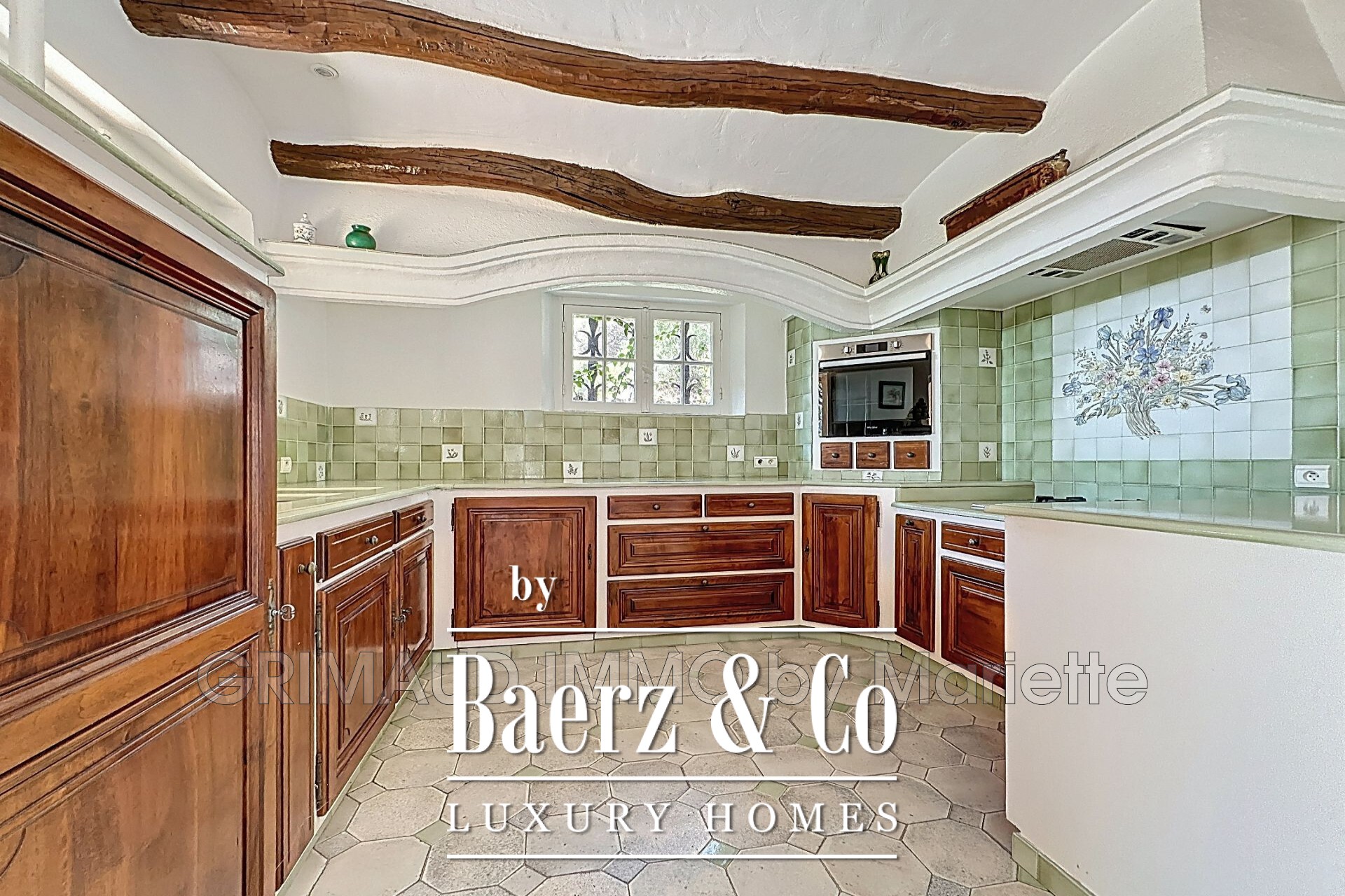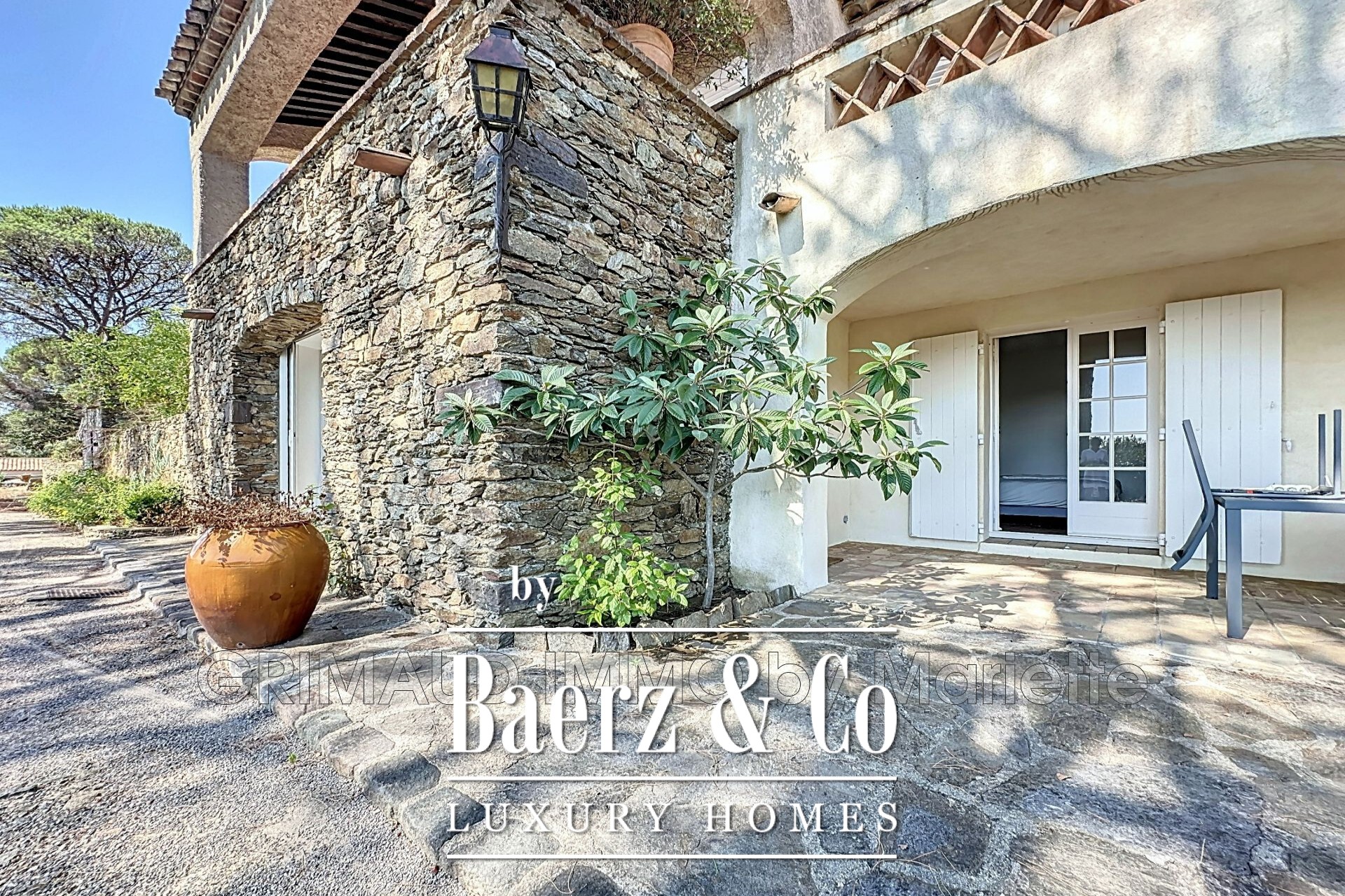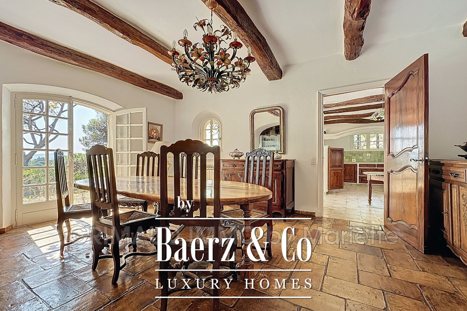 In a peaceful and green setting, this charming villa with a Provençal style is situated on a large plot of 4,086 m² with a garage, offering a panoramic view of the village of Grimaud and the surrounding hills. Divided into two separate living spaces, it comfortably accommodates family and guests or can be used to create an independent living area. The main part, located on the upper floor, includes an entrance with guest toilets, a spacious bright living room with a fireplace, a dining room extended by a fully equipped kitchen, a pantry, two bedrooms
