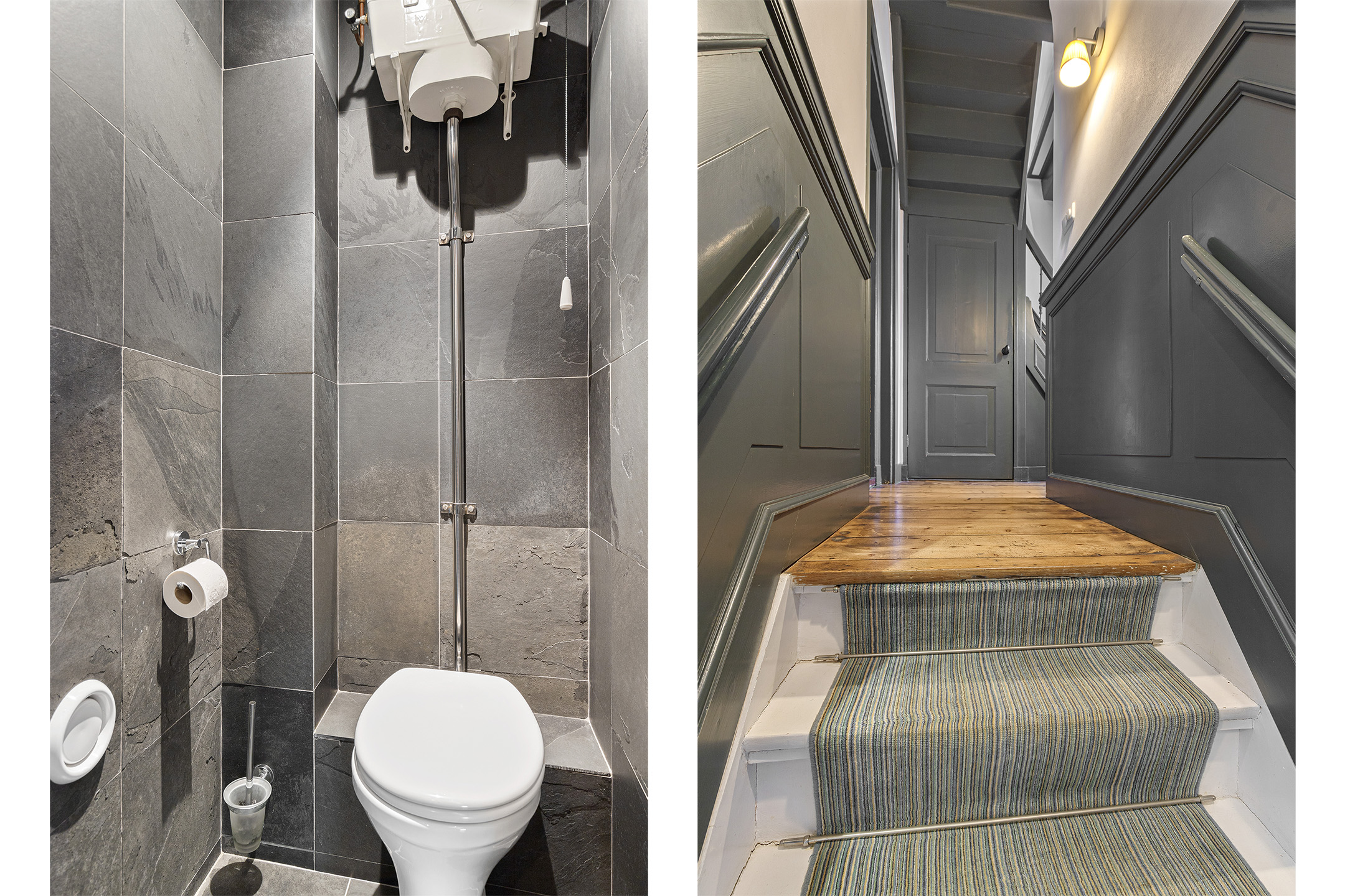 In addition to the en-suite on the bel étage, the third floor offers two large bedrooms and a luxurious bathroom. The newly finished roof with exposed beams adds both character and warmth. The souterrain provides extra living space with a cosy guest bedroom, an en-suite bathroom, and a walk-in closet – ideal for guests or an au pair.