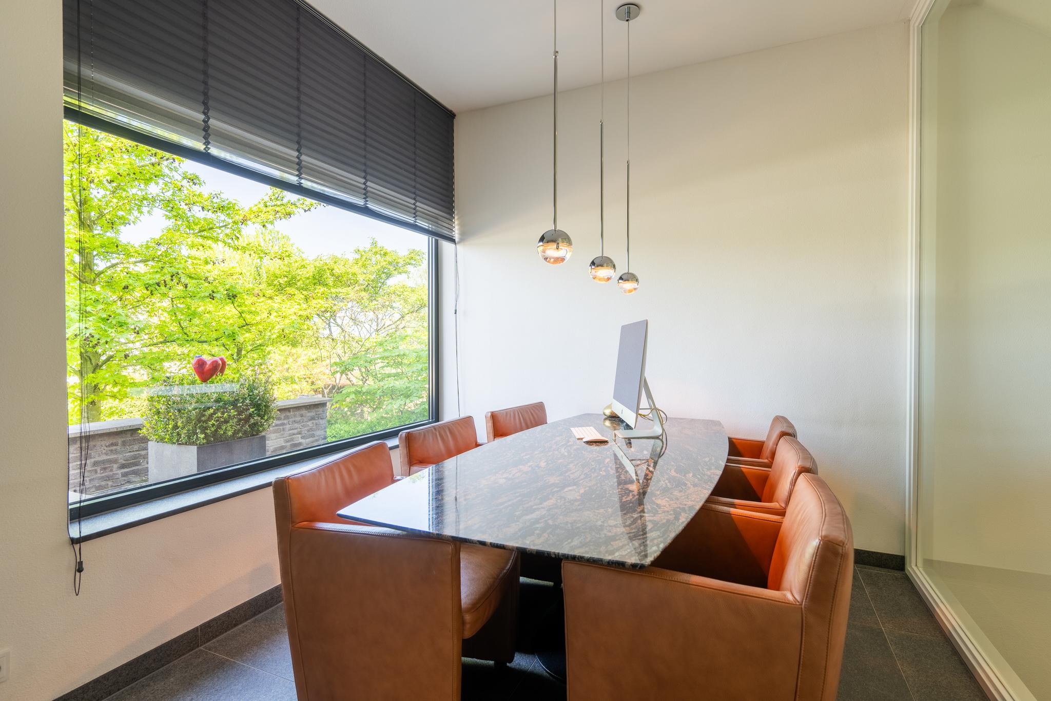 Via the spacious driveway, access is provided to the garage and covered entrance. The driveway is paved and offers space for parking multiple vehicles. Video intercom and mailbox. The entrance hall features built-in wardrobe cabinets, a utility meter cupboard, and access to the garage. Centrally located in the hall is a stately staircase leading to the living areas and the upper floor. The staircase is concrete with natural stone-finished steps. From the hall, the laundry room is accessible; it is equipped with a counter combination and connections for laundry machine. This room has a large glass sliding door, providing access to the patio and allowing ample daylight to enter. Adjacent is the studio space, which also offers access to the patio through a large glass door. The tranquility of the patio and the beautiful light make it a pleasant workspace. Behind this area is a spacious storage room. The garage accommodates multiple cars and has an extra-wide sectional door with an adjacent separate access door. Space for wine storage, a technical room with connections for the HR combi boiler (owned) and a reservoir for the central vacuum system. Storage space for waste/paper containers and an inverter for the solar panels.