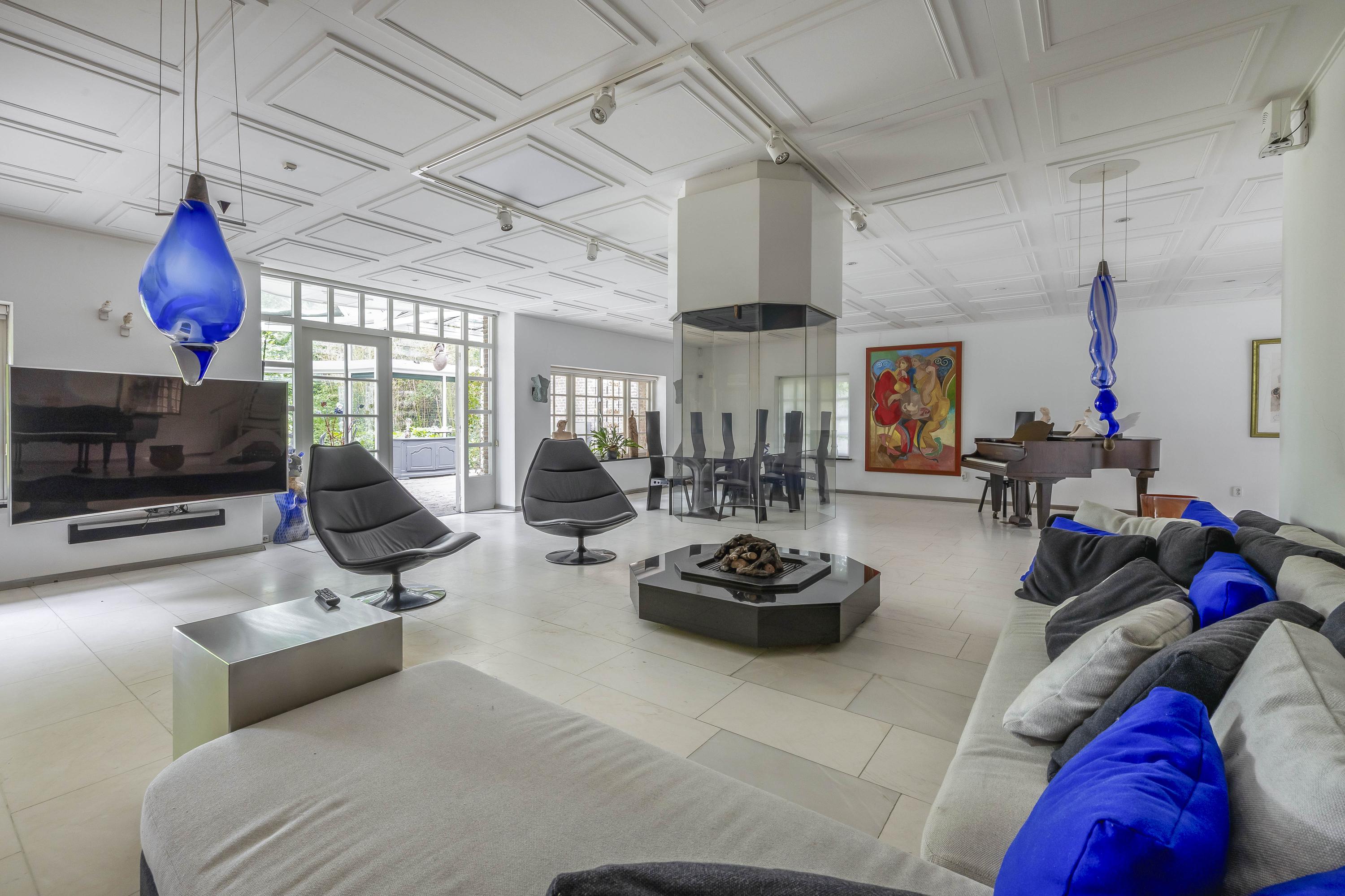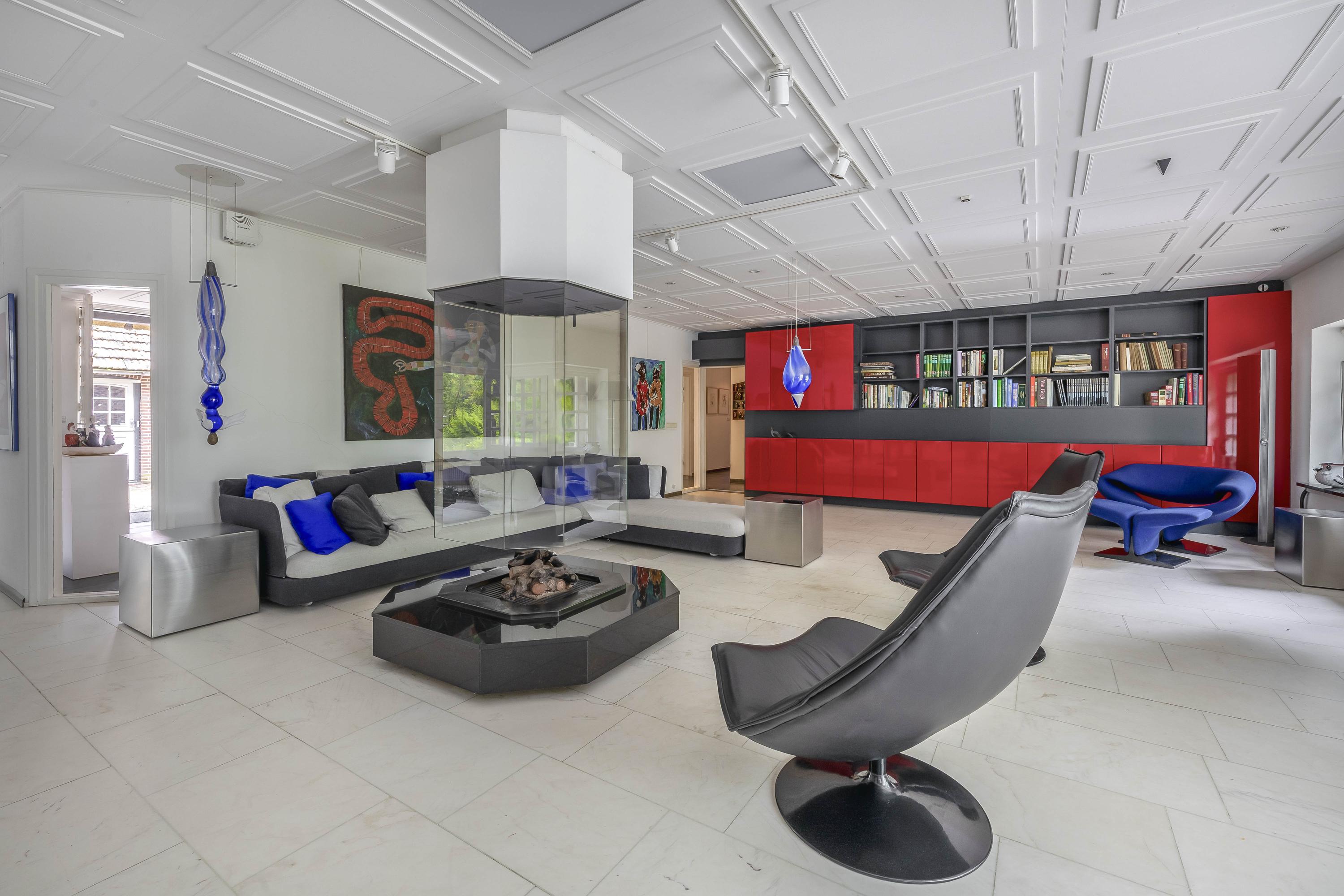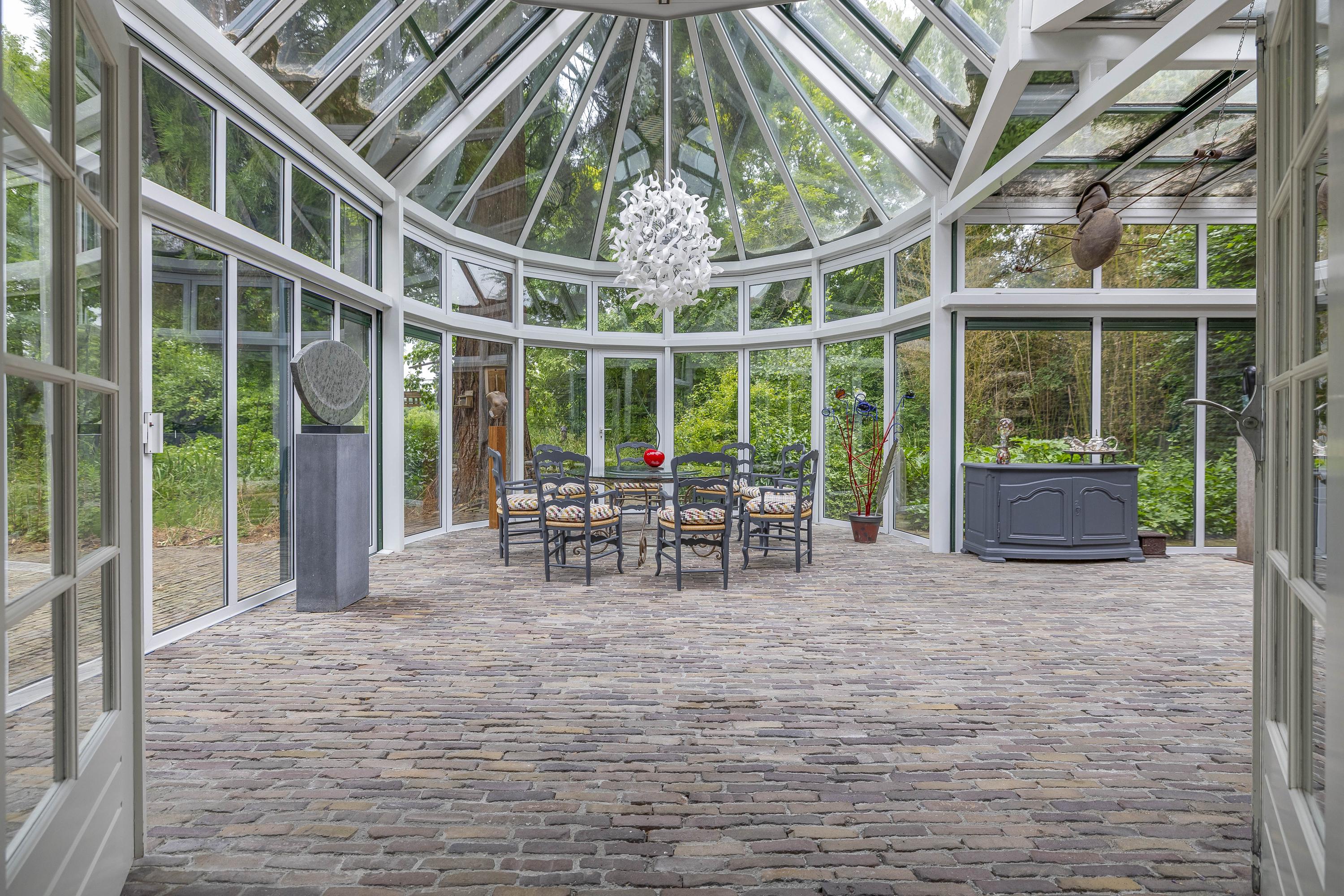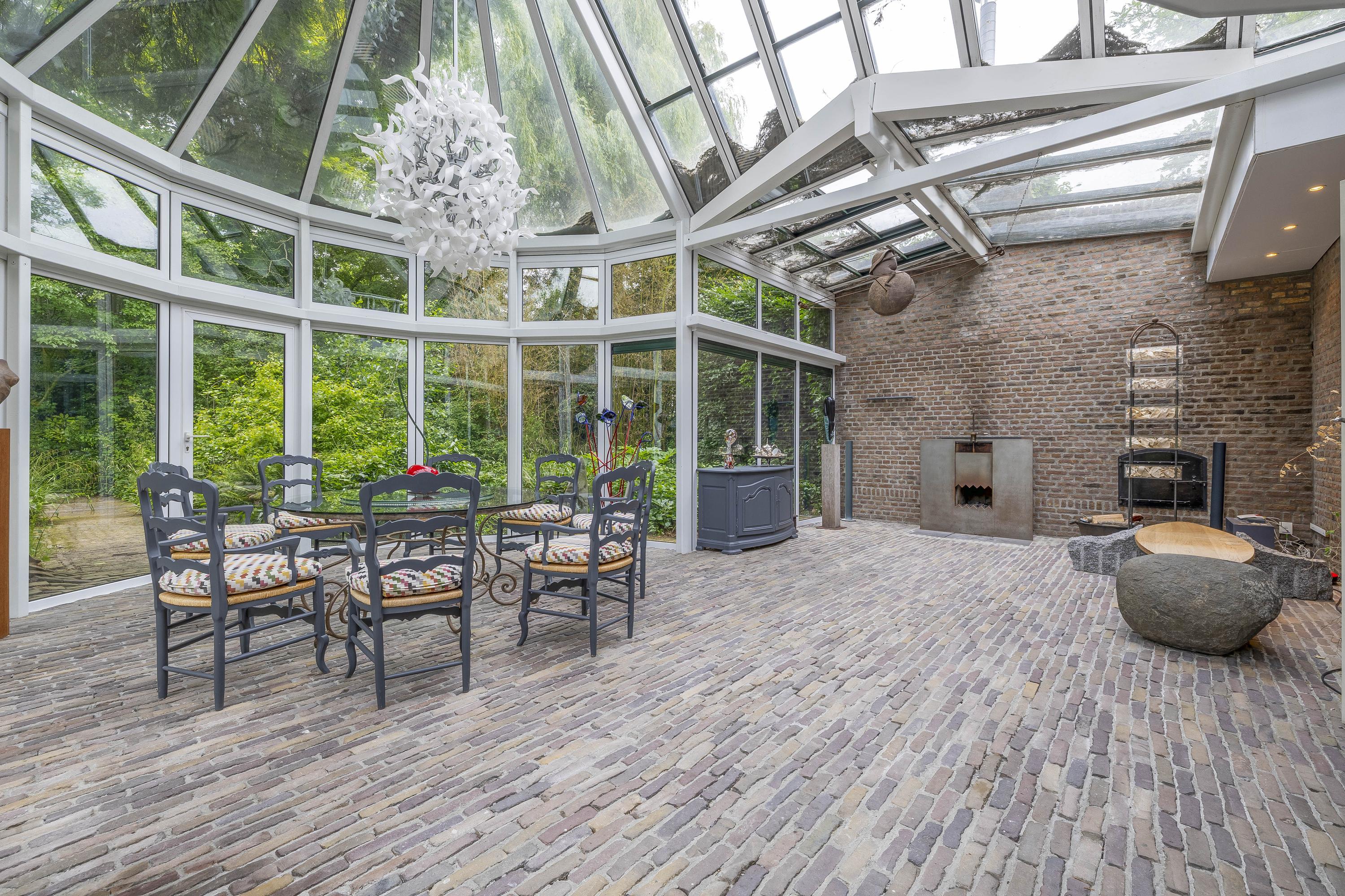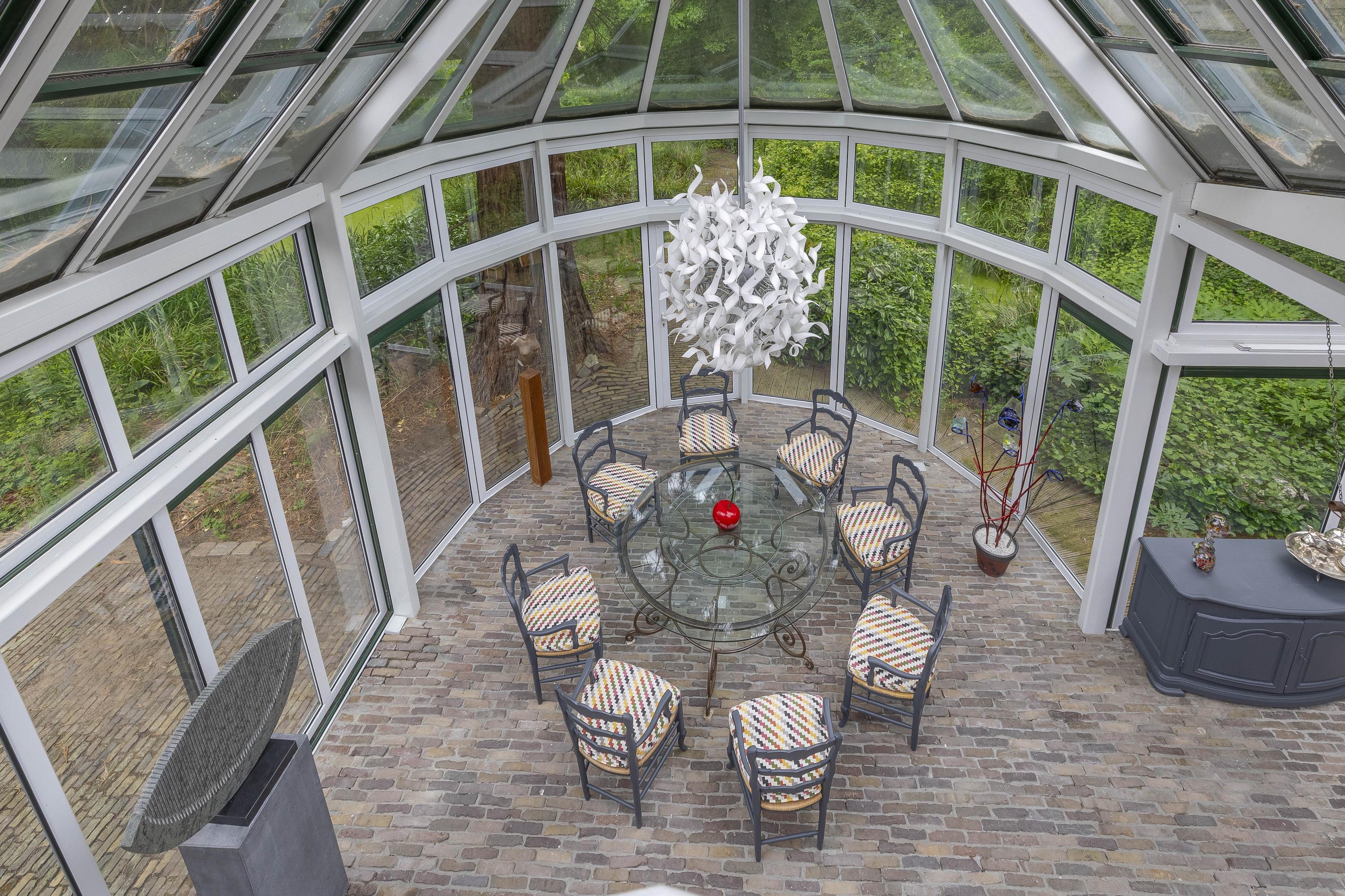 bathroom, bedroom and the second hall. The spacious living room is finished with a white marble floor, stucco walls and a stucco ceiling with recessed lighting. A Boley gas fireplace in the centre of the room provides extra atmosphere and warmth. Various windows ensure that the living room is a wonderfully light space. French doors provide access to the conservatory. The windows offer a beautiful view of the garden with its animals. The cosy conservatory brings the surrounding garden inside! There is a fantastic view of the surrounding