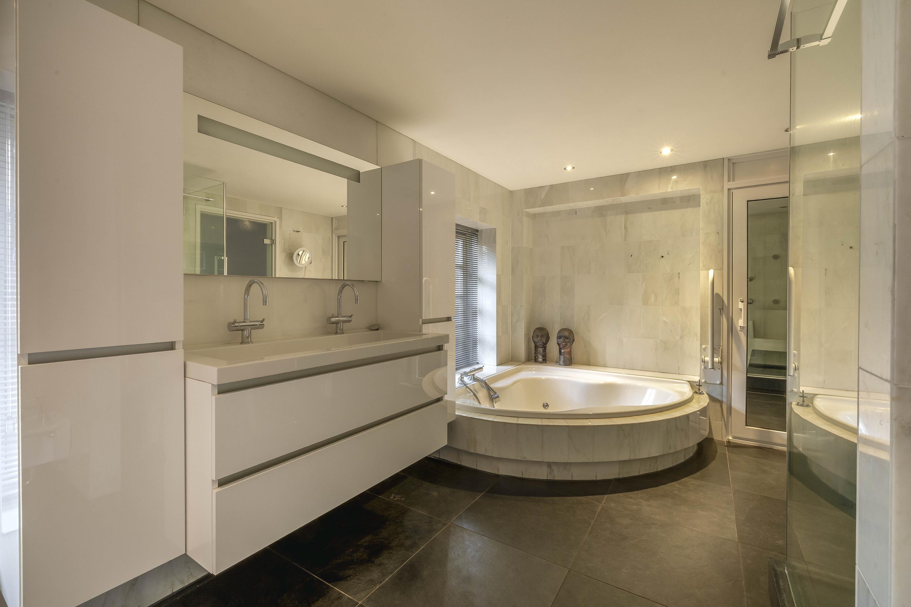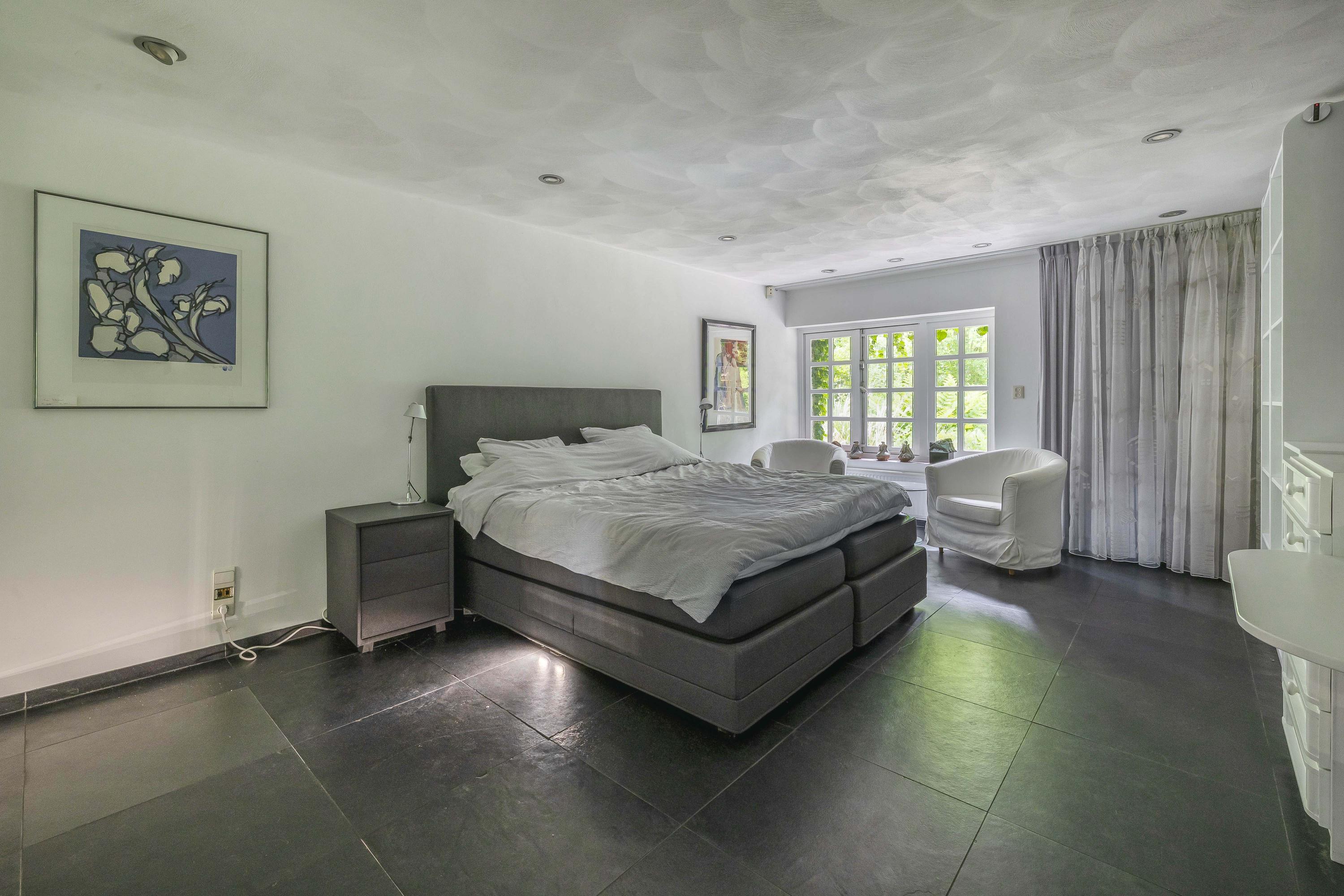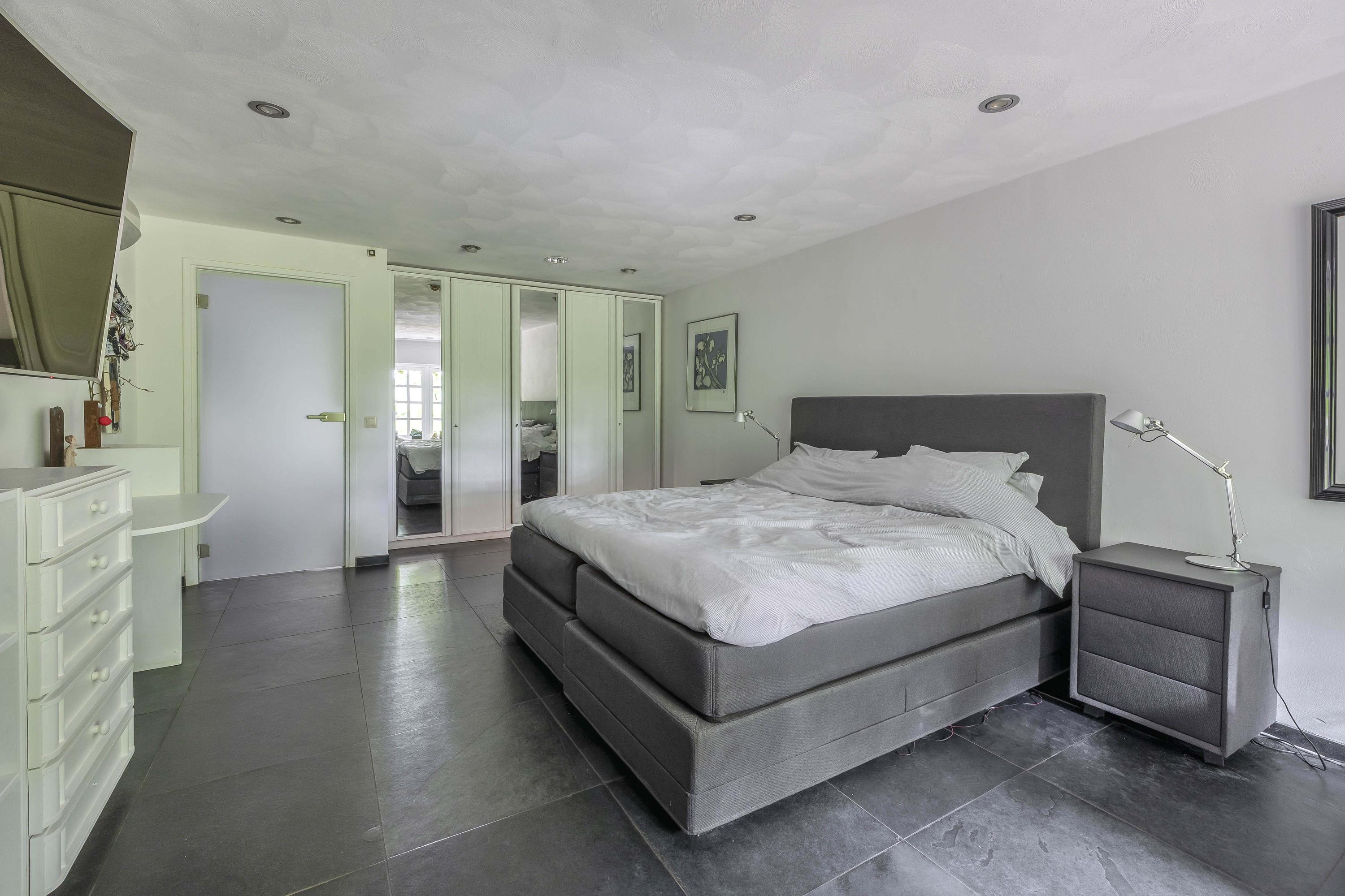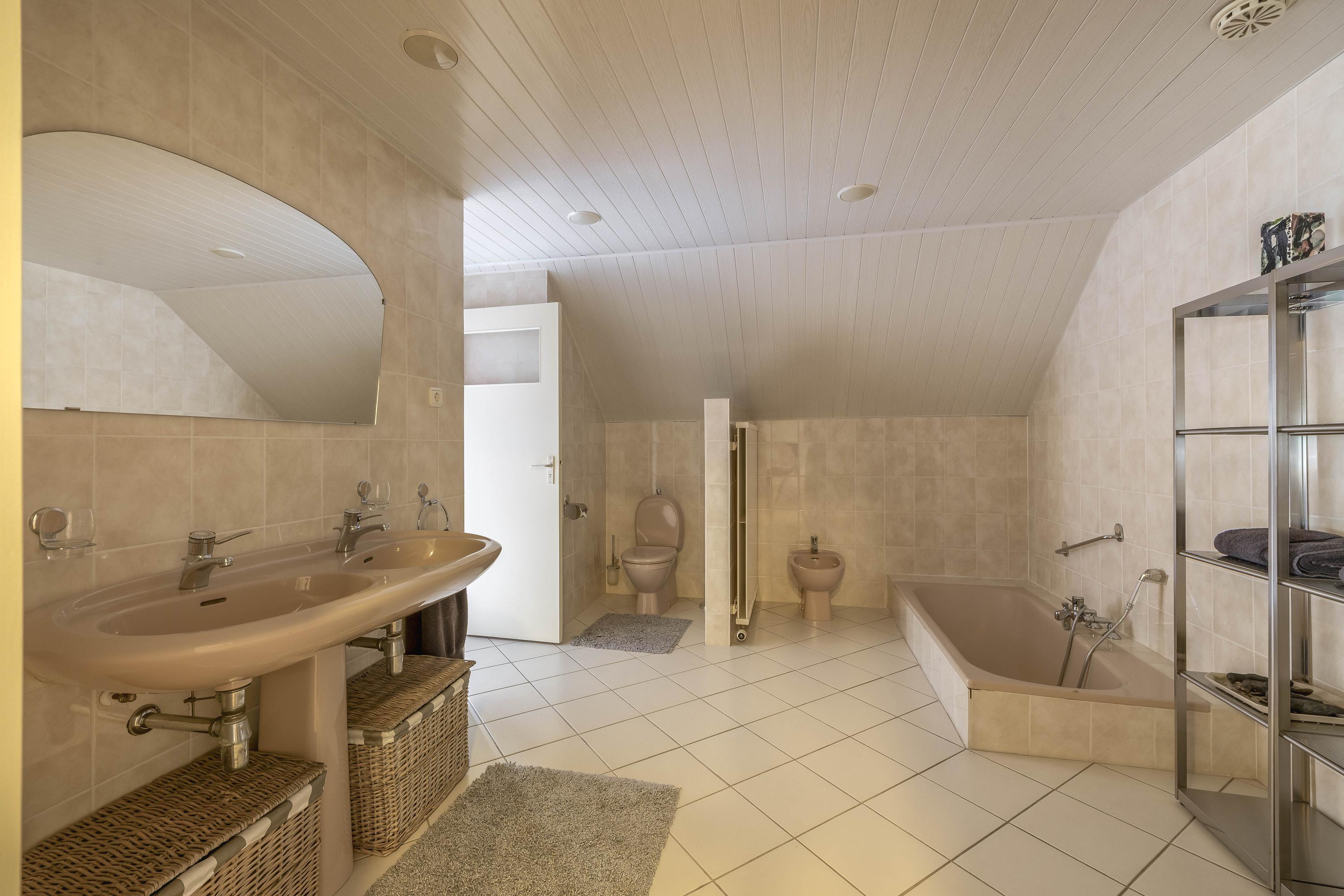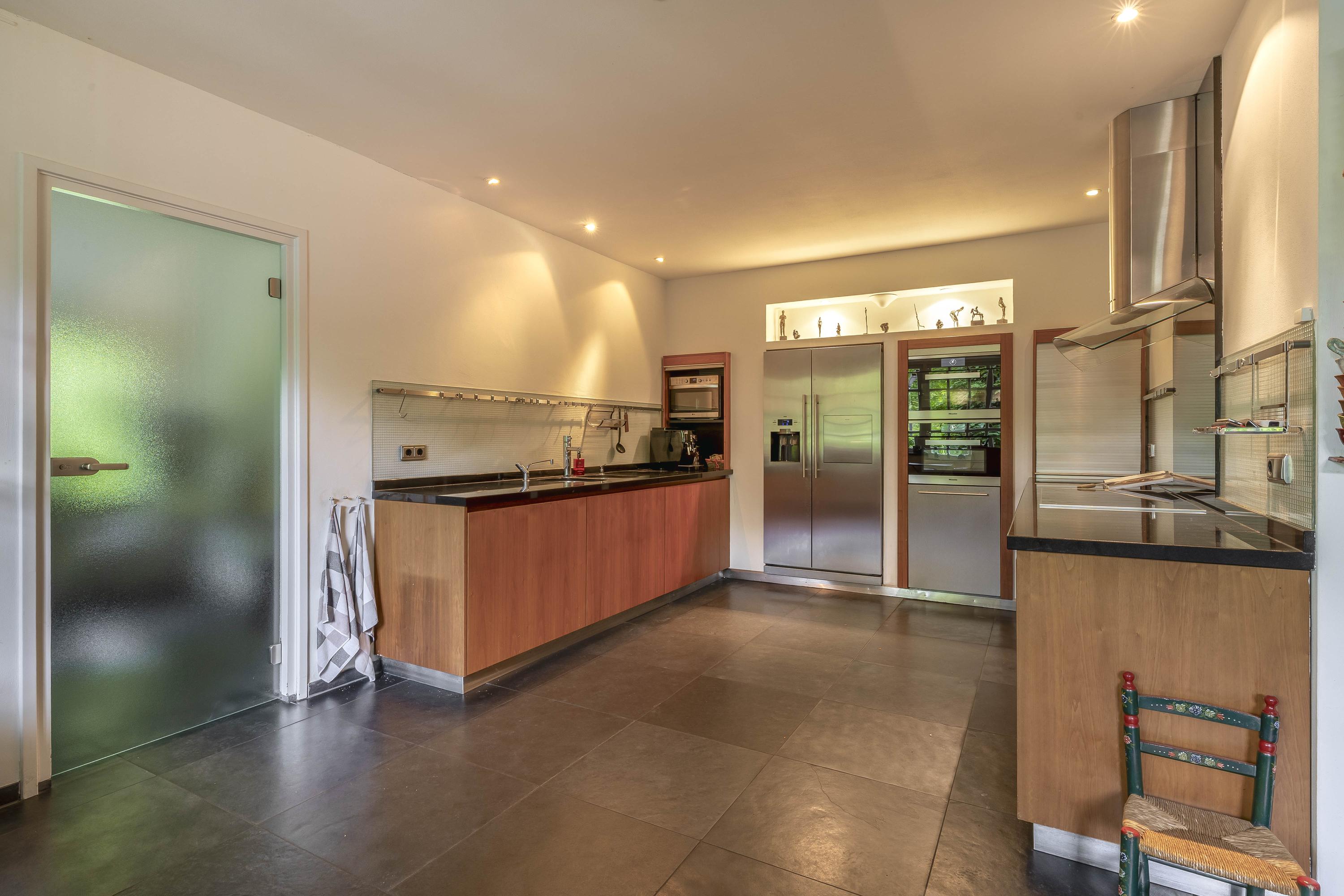 with a tiled floor. A wood-burning stove also provides extra atmosphere and warmth here. The spacious bedroom has a natural stone floor, stucco walls and a stucco ceiling with recessed lighting. A window provides natural light and ventilation. The room also has two built-in cupboards. The spacious bathroom is fully tiled with a stucco ceiling with recessed lighting. The bathroom is also equipped with a corner bath (whirlpool), shower, double wide washbasin with large vanity unit, bidet and separate toilet. The room also has two practical built-in cupboards. A second hall provides access to the kitchen, laundry room, two meter cupboards and a cellar cupboard. The spacious kitchen, a pleasant, light room with an adjoining dining area, is fitted with a double wall unit containing all the necessary high-quality appliances (Miele): two sinks with taps and a hot water tap (Quoocker), an American fridge (including freezer) with cold water tap and ice cube machine, microwave, dishwasher, steam oven, oven and a 5-burner induction hob. Various cupboards and drawers provide ample storage space. The kitchen has a natural stone floor with underfloor heating, stucco walls and a stucco ceiling. A practical built-in cupboard provides even more storage space. A door provides access to the garden. From the kitchen, a closed staircase provides access to the first floor. The connections for the washing machine and dryer are located in the laundry room. Next to the kitchen is a multifunctional room, which was previously used as a study, but could also serve as a playroom or chill-out room. This room has a tiled floor, stucco walls and a wooden beamed ceiling and offers a fantastic view of the trees.