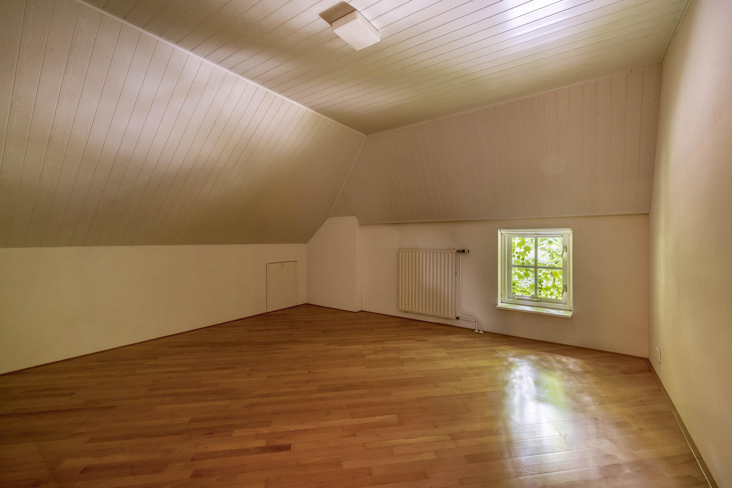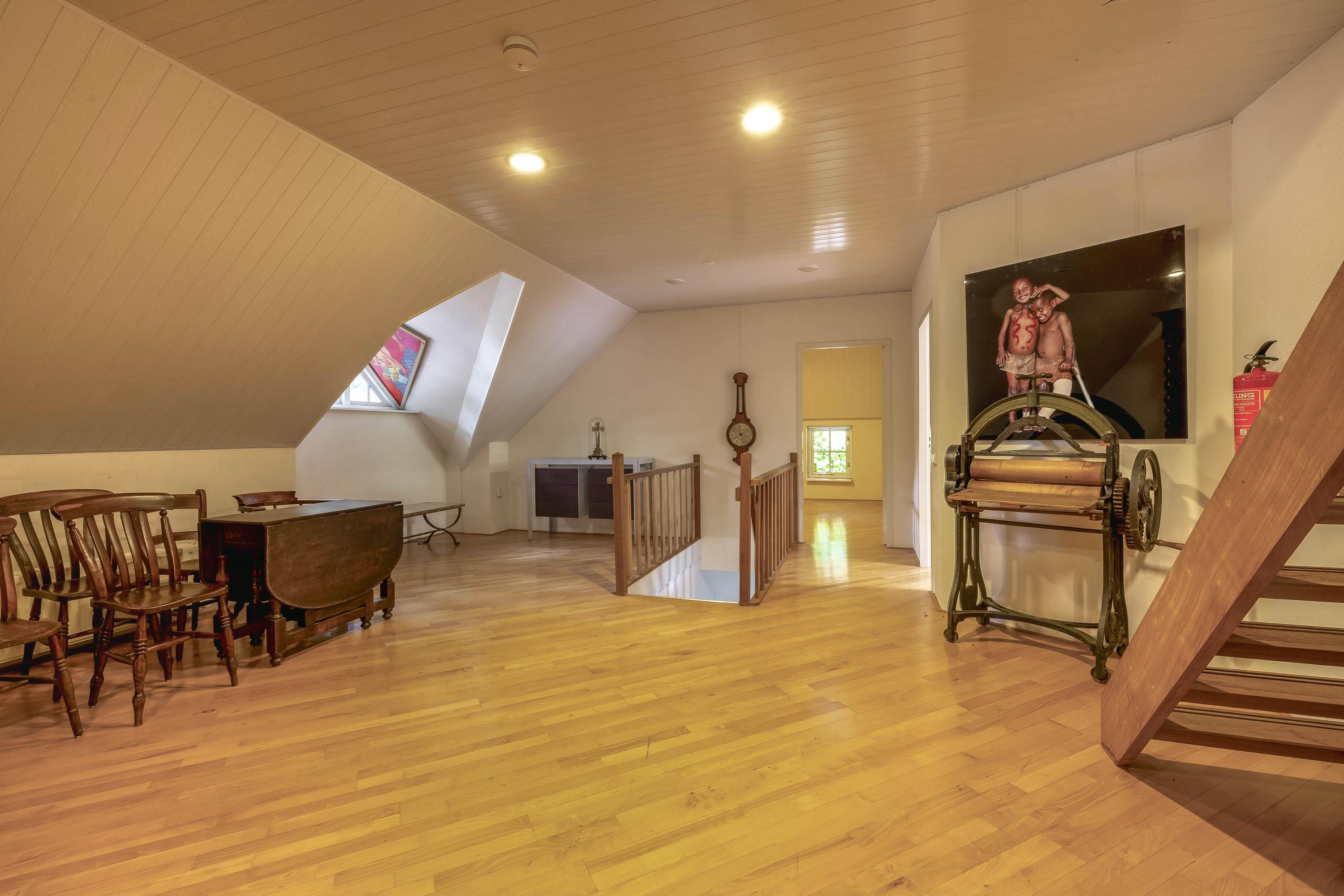 A spiral staircase leads from the living room to the first floor. The landing is finished with a parquet floor, stucco walls and a panelled ceiling. A landing provides access to a spacious room, which offers space for additional (bed)rooms, but due to the current layout can also be converted into a billiard room or chill-out room and, with an internal division of the house, can also serve as a living room.