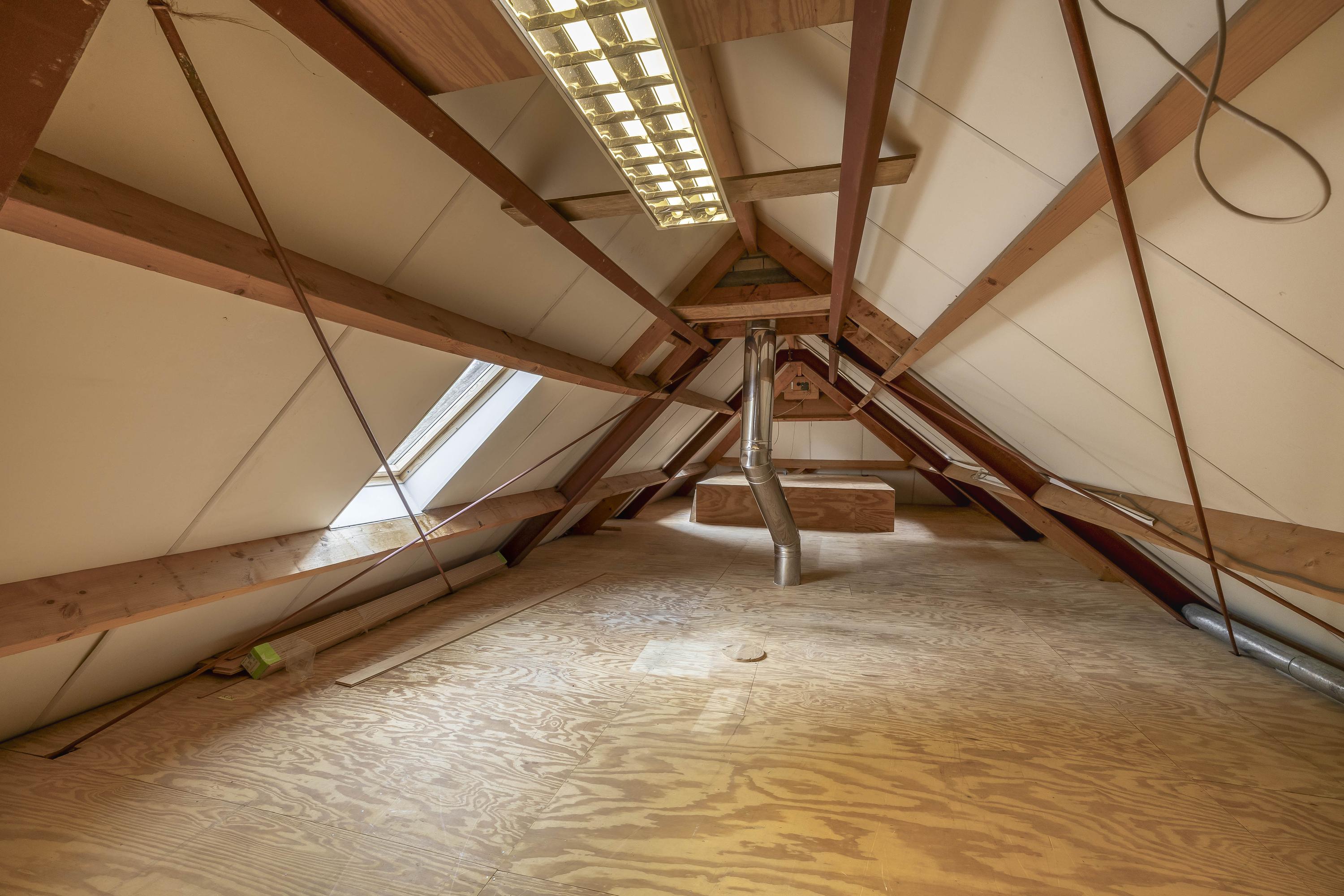 recessed lighting. A dormer window provides natural light and ventilation. A fixed staircase provides access to the attic. The storage room also has parquet flooring, stucco walls and a panelled ceiling. Bedroom II is finished with parquet flooring, stucco walls and a panelled ceiling. A dormer window and a window provide natural light and ventilation. Storage space has been created under the sloping roof. Bedroom III also has parquet flooring, stucco walls and a panelled ceiling. A window provides natural light and ventilation. Here too, storage space has been created under the sloping roof. The attic space has a wooden floor. Five skylights ensure that the space enjoys plenty of natural light. There is also an owl box. From the first floor, a second staircase provides access to the kitchen on the ground floor.
