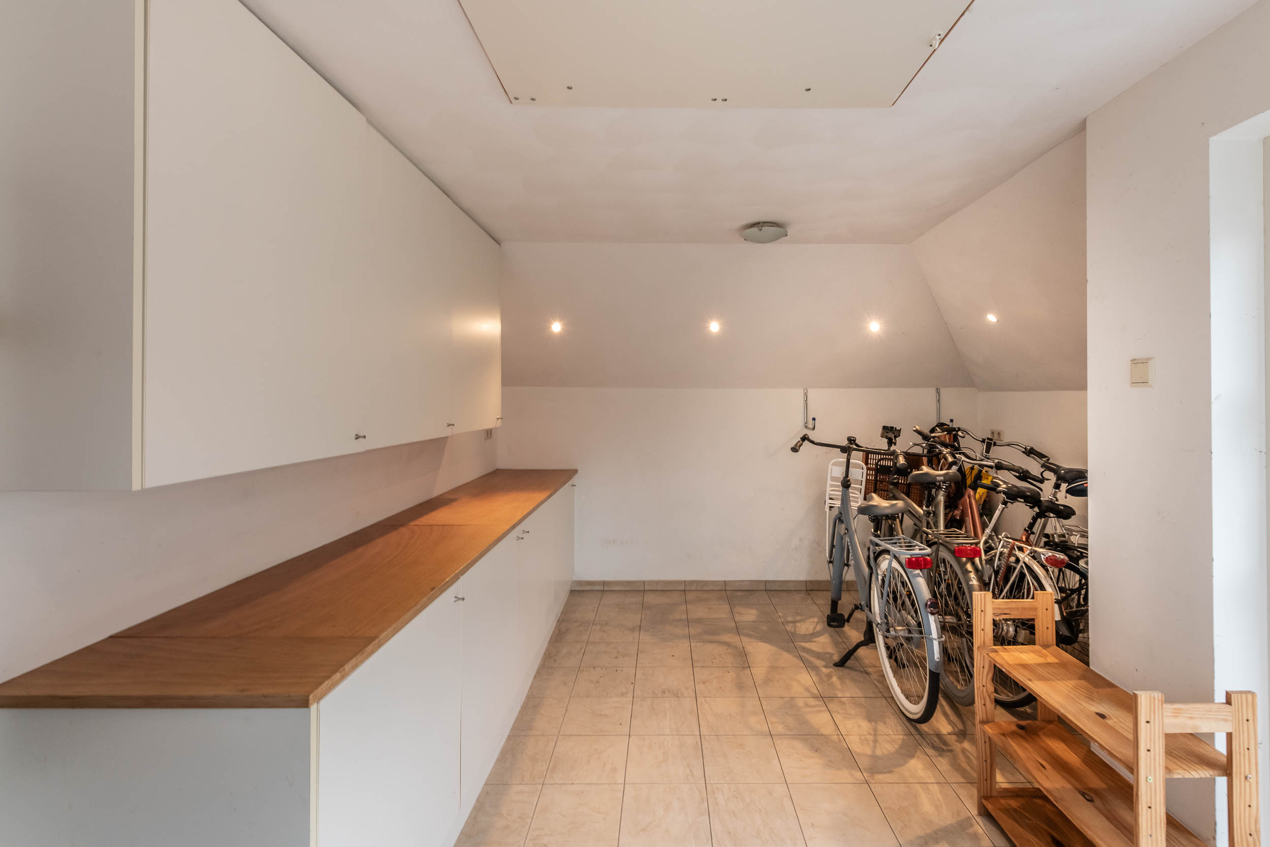 Second floor: The multifunctional attic space, currently serving as a playroom, leads to one bedroom. Both rooms have a dormer window. The bedroom provides access to a storage room.