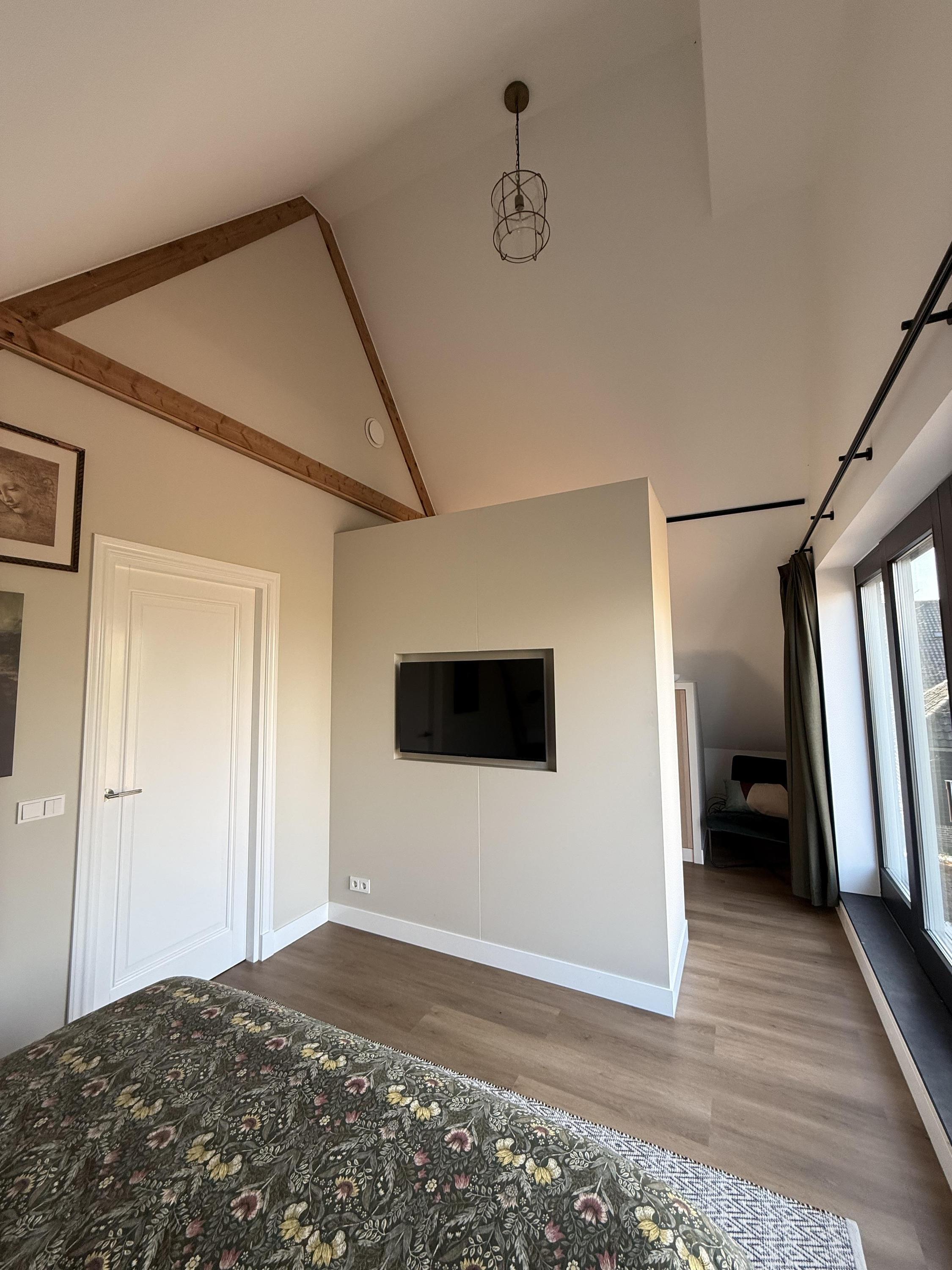 At the rear is the main bedroom, a calm and light-filled space with unobstructed views over the surrounding fields and the dike. Adjacent is the walk-in closet, fitted with custom cabinetry. From here, a black steel door leads into the bathroom. In addition, the bedroom provides access to the sedum-covered flat roof of the kitchen extension, where a terrace has been created — a sheltered spot with open views over the greenery.