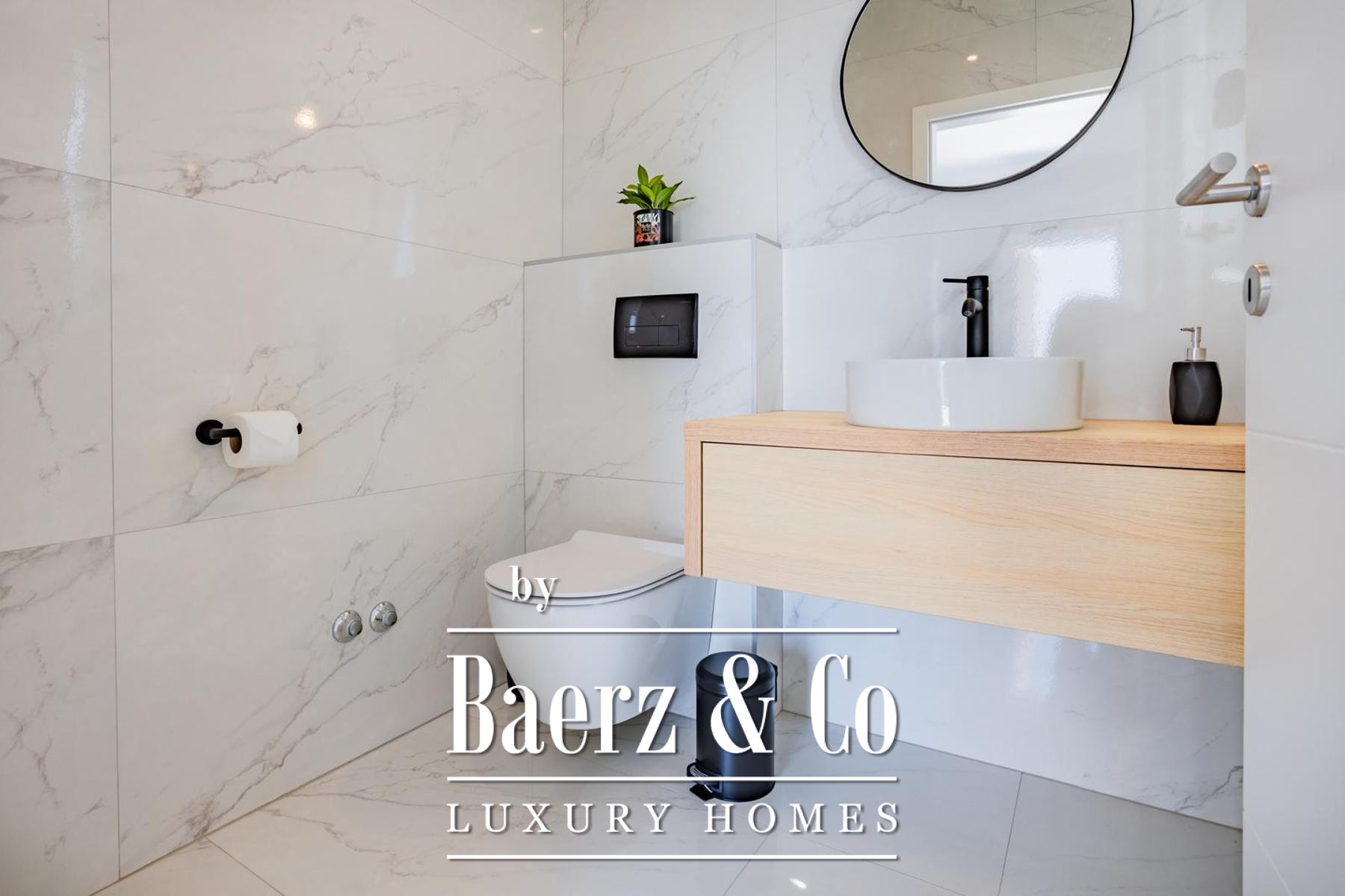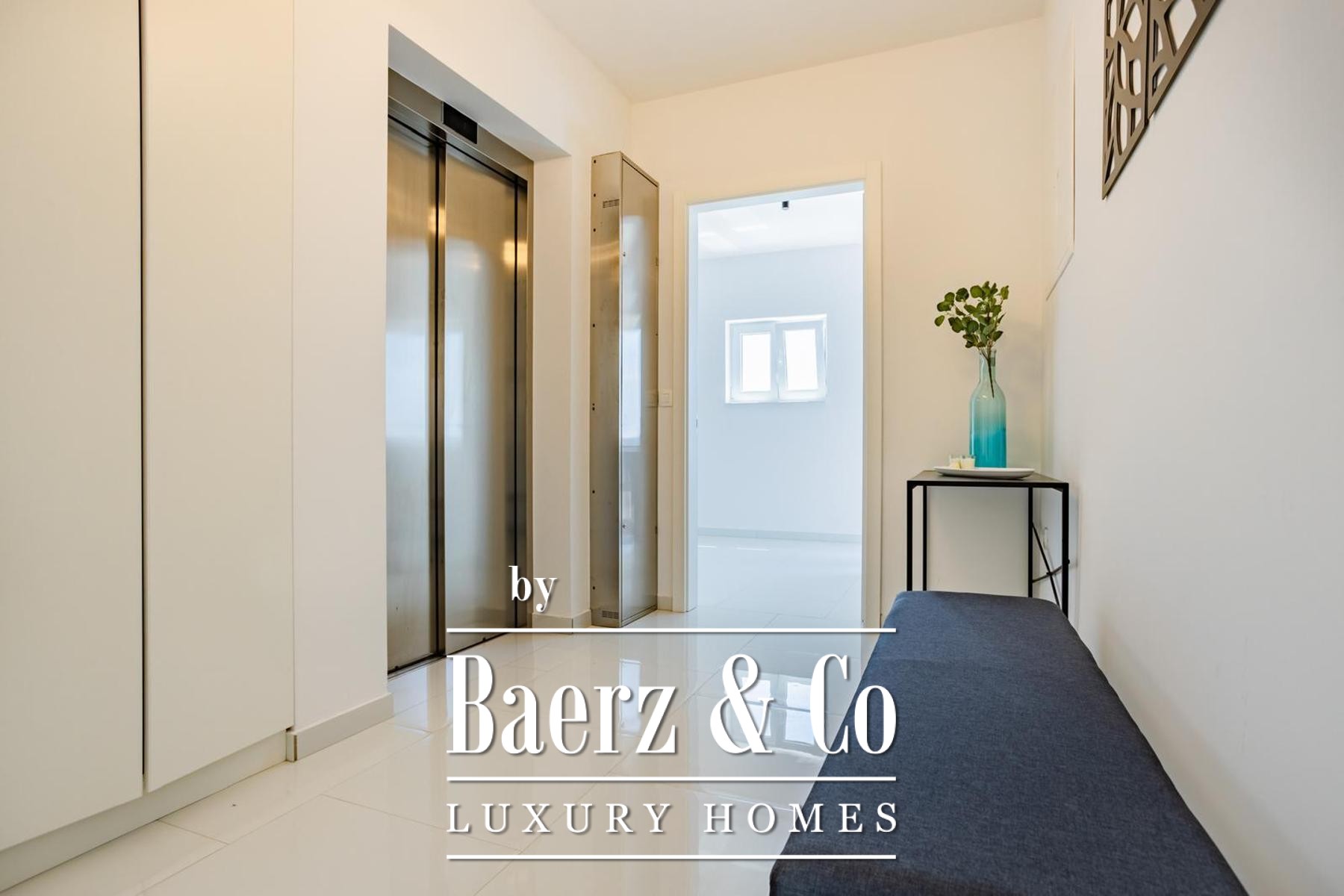 Set on a 531 m² plot, the villa spans three levels connected by an internal staircase and a lift, offering approximately 250 m² of refined living space. The ground floor introduces a children's bedroom, a bathroom, and a master suite with an en suite bathroom, anchored by an open kitchen, dining, and spacious living area. The living room flows onto a landscaped garden terrace crafted for respite and entertainment, featuring a swimming pool, sundeck with deck chairs, a covered lounge, bar, barbecue, and a children's playground.