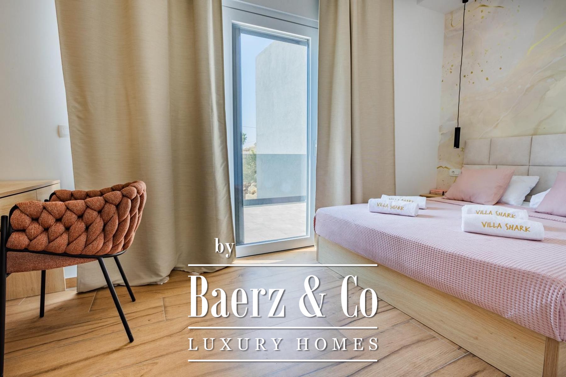 The first floor hosts three serene bedrooms and two bathrooms, each opening onto a terrace that frames sweeping views of the sea, complemented by an outdoor gym for leisure and wellness. The top floor adds flexibility with an additional toilet, a summer kitchen, and access to a large panoramic terrace, affording remarkable sunset vistas over the coastline.
