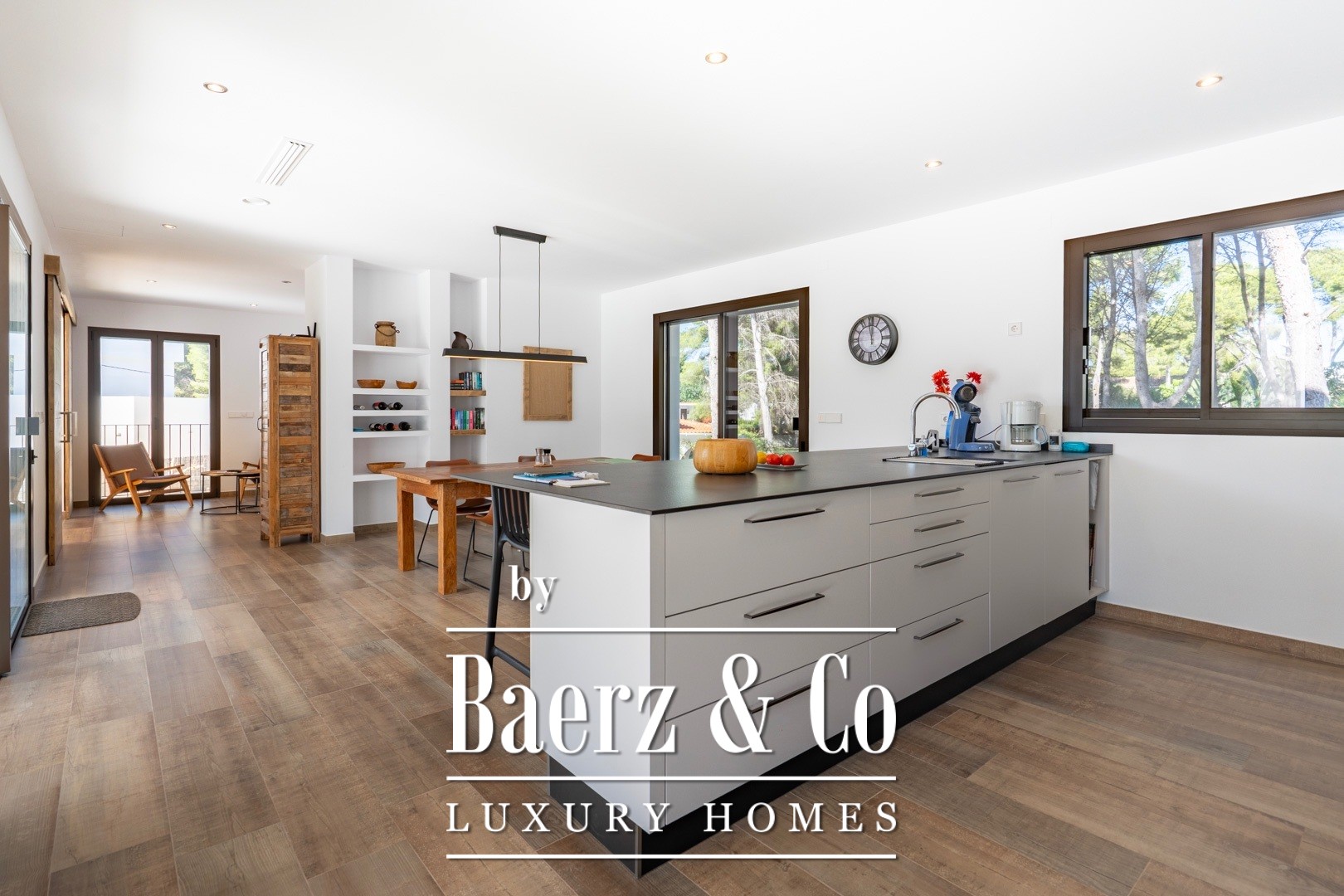 This luxury villa for sale in Jávea connects effortlessly to area amenities. Cala Blanca beach is moments away. The sandy expanse and lively promenade of El Arenal lie within easy reach, lined with restaurants, boutiques, and local services. In the immediate surroundings, you find restaurants, a pharmacy, a tennis club, and a small supermarket—all within walking distance.