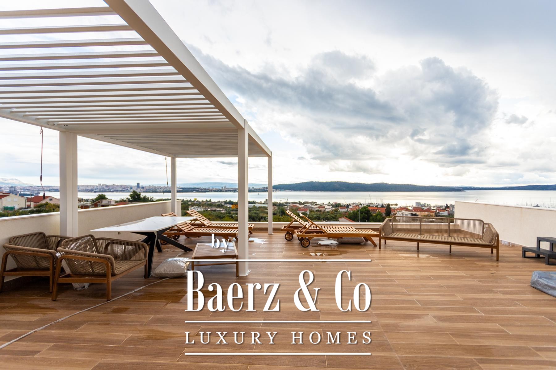 The journey concludes on a roof terrace that offers a jacuzzi, barbecue, and a sheltered relaxation corner for year-round enjoyment. Underfloor heating and individual air conditioning in all rooms ensure comfort in every season. The villa is available for purchase through a company structure, providing exemption from the local 3% property tax. This luxury villa for sale in Kaštela stands as a discreet retreat for those seeking light, calm, and panoramic perspectives above the Adriatic.