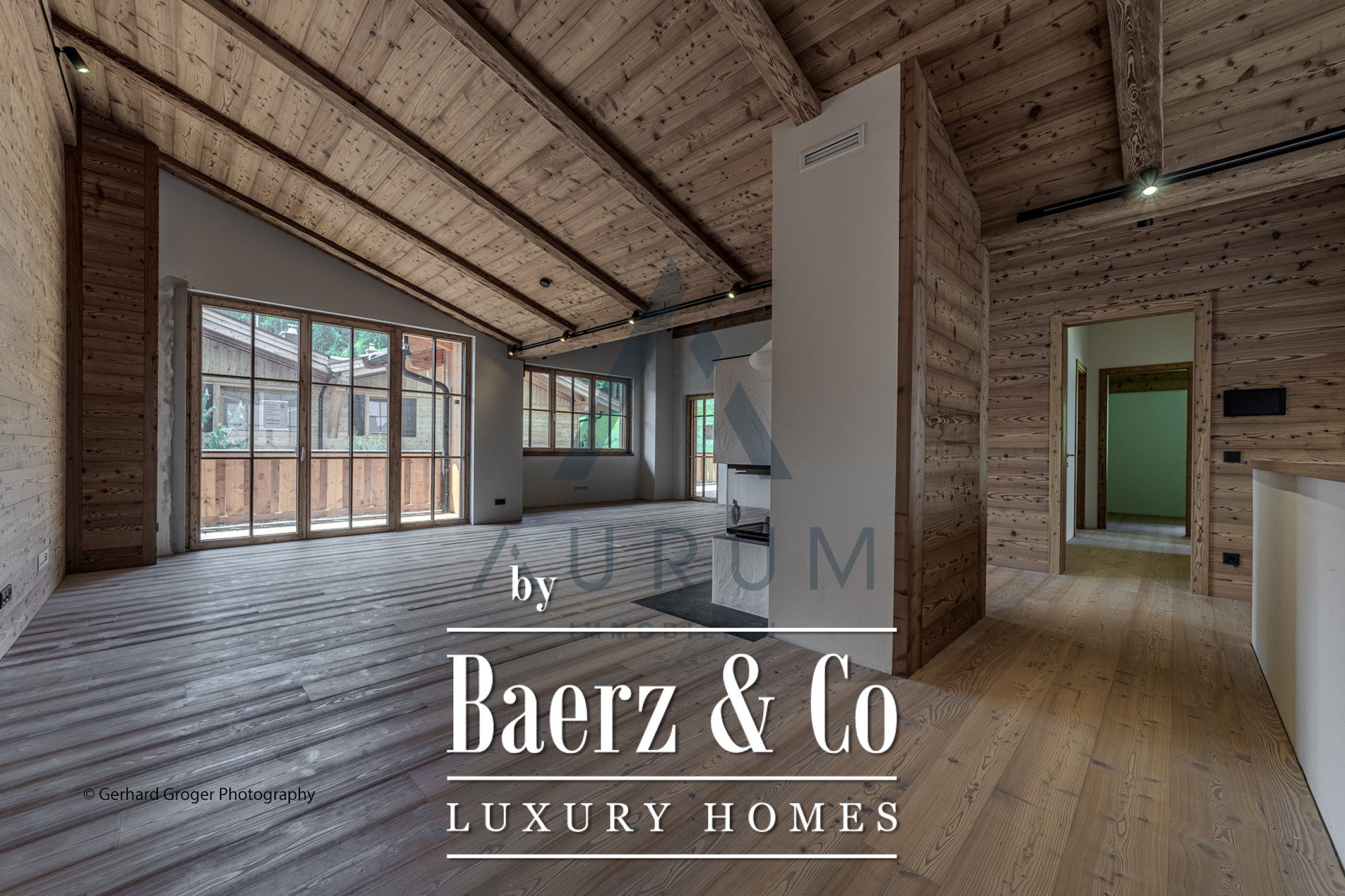 The living and dining areas feel open and luminous, anchored by an open fireplace that invites a quiet pause after days spent on the slopes or in the mountain air. Extensive balconies, measuring up to 61 m², draw in the sweeping mountain scenery and offer a private vantage point with every season. These residences are defined by their thoughtful materials, from fine larch wood floors and ceramic tiles to exposed roof trusses, each detail underscoring the careful attention to both form and function found throughout.