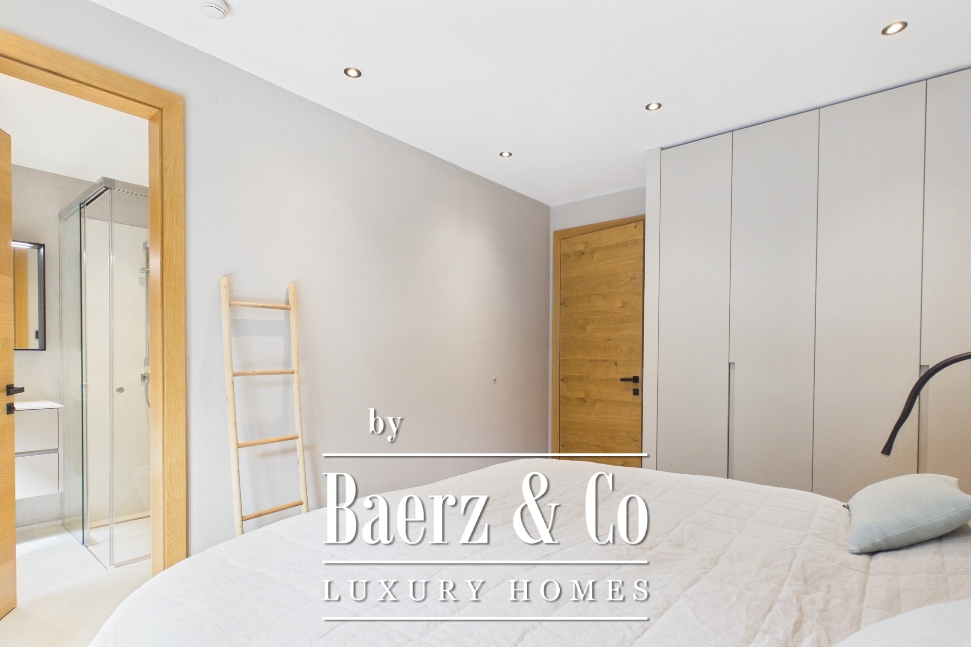 Expansive outdoor spaces are woven into the apartment’s design, including approximately 95 m² of terraces, balcony, and landscaped zones that invite quiet reflection. The living environment is enhanced by thoughtful amenities such as a fireplace, floor heating, smart home system, electric blinds, and an integrated alarm system. Additional offerings include a covered parking space with electric vehicle charging, an outdoor parking bay, and an 8.5 m² storage cellar equipped for winter sports and laundry needs.