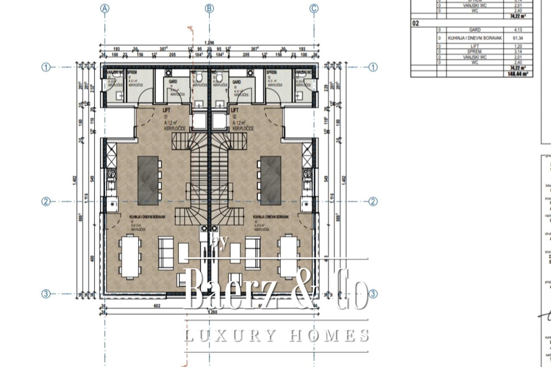 Upstairs, three bedrooms each offer an en-suite bathroom, while the master suite extends to a balcony above the sea. The inclusion of a Daikin heat pump, ceiling air conditioning, and ALU carpentry underscores the property’s commitment to quality and comfort. This semi-detached house in Kostrena will reach completion at the end of 2024, offering an elegant, private base to experience the Adriatic coast.