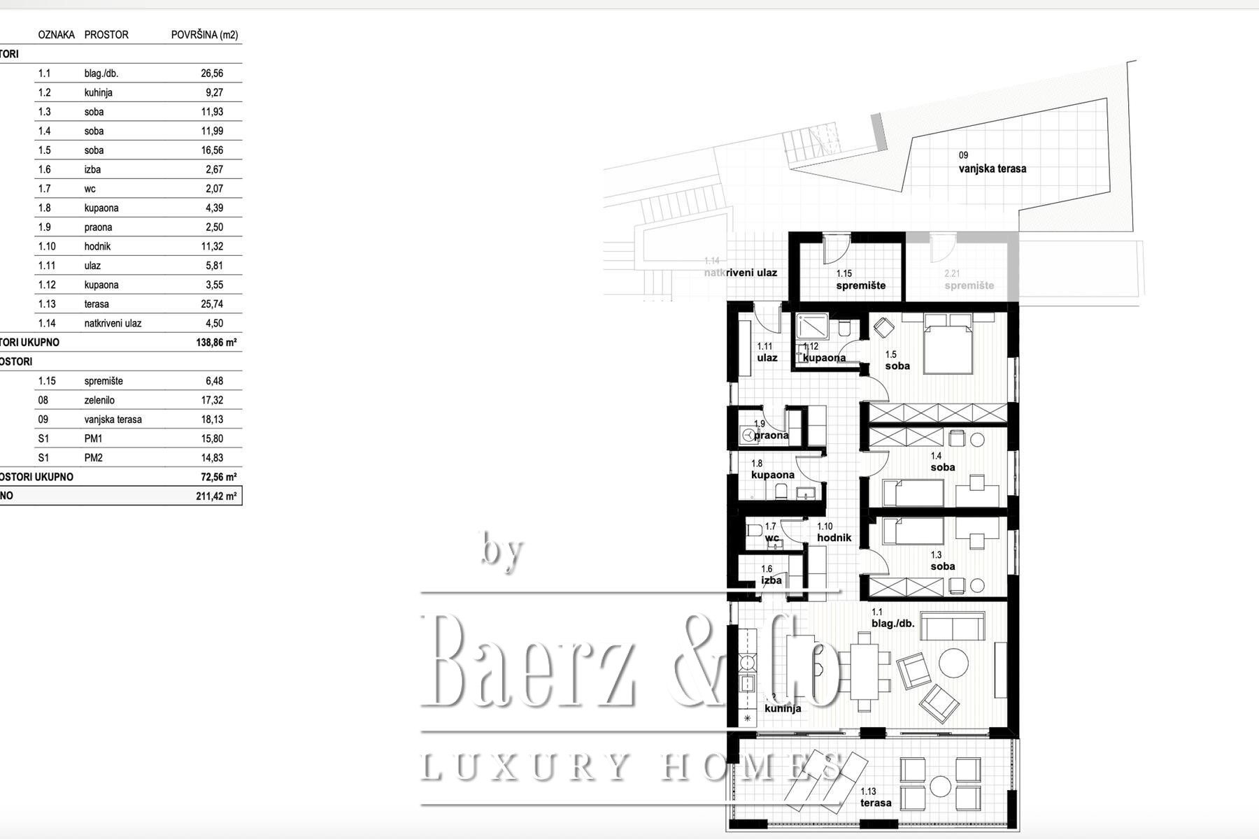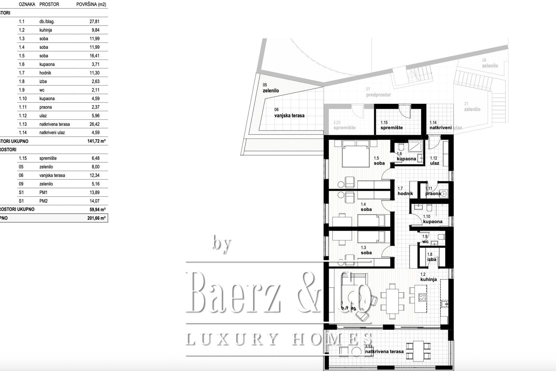 Each of the four bedrooms offers space and balance, with the principal measuring 21.91 m², and three others at 14.20 m² each. Thoughtful details include three elegant bathrooms, a walk-in wardrobe, a laundry room, pantry and storage. A covered 26.14 m² terrace brings the panorama of the Adriatic into daily life, complemented by additional outdoor terraces and a landscaped garden.