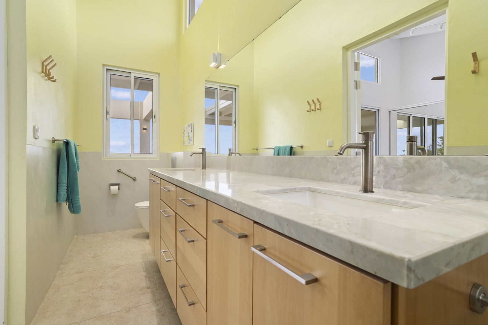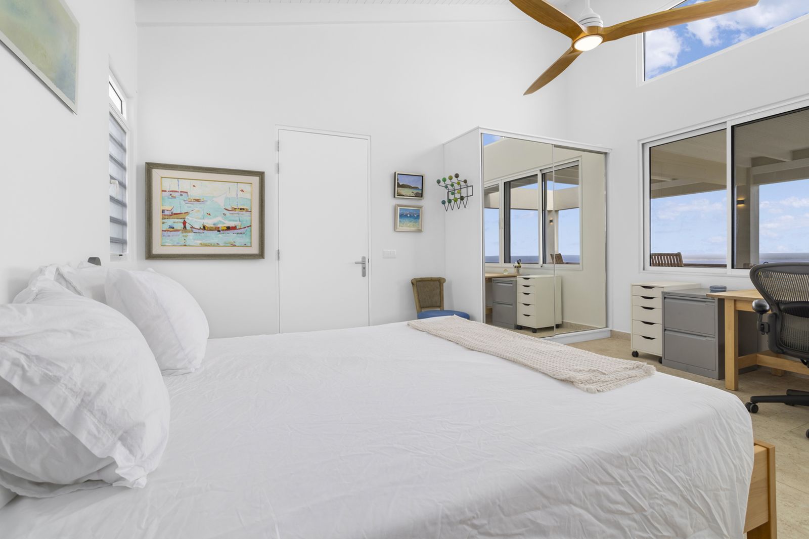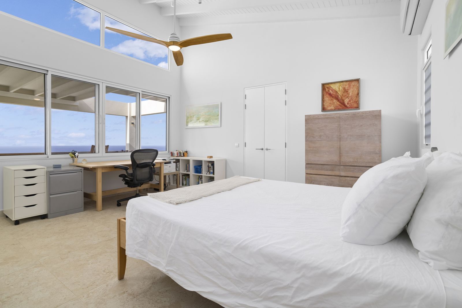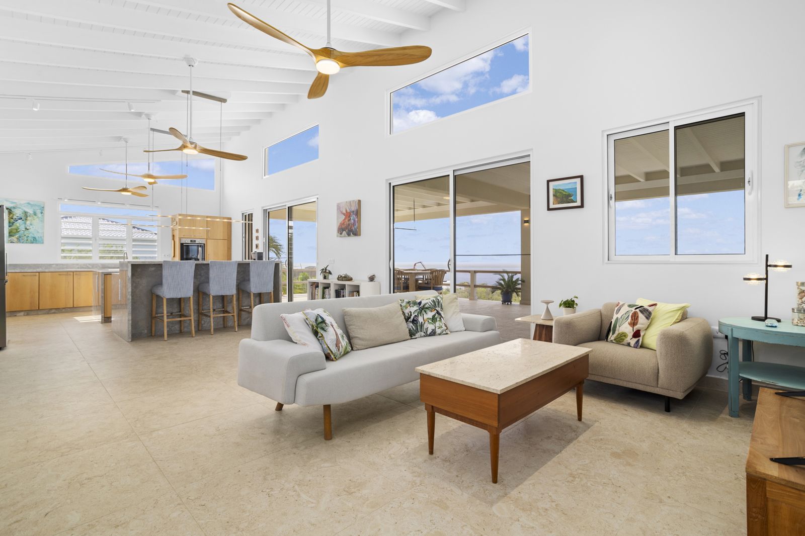 The oversized primary suite enjoys direct ocean views and features a refined en-suite bathroom with double vanity and walk-in shower. The open living areas feel airy, calm, and easy to maintain, making the home ideal for couples seeking privacy and simplicity without sacrificing space.