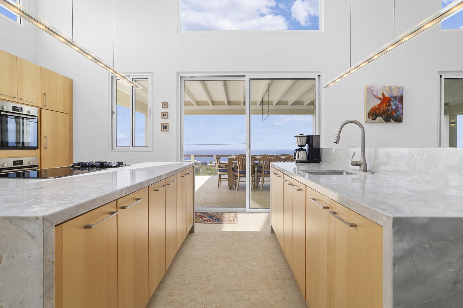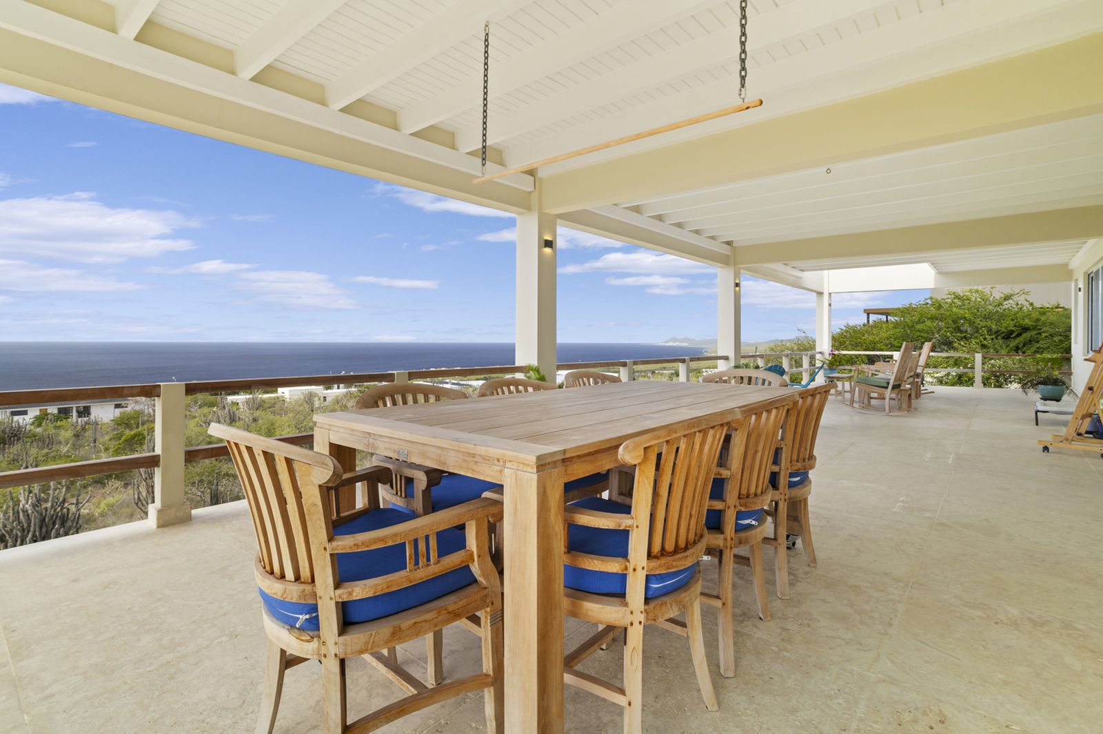 The villa’s clean architectural lines and expansive sliding glass doors create a seamless indoor-outdoor connection. The broad, sea-facing terrace becomes a natural extension of the living space, capturing cooling trade winds and uninterrupted views from sunrise to sunset.