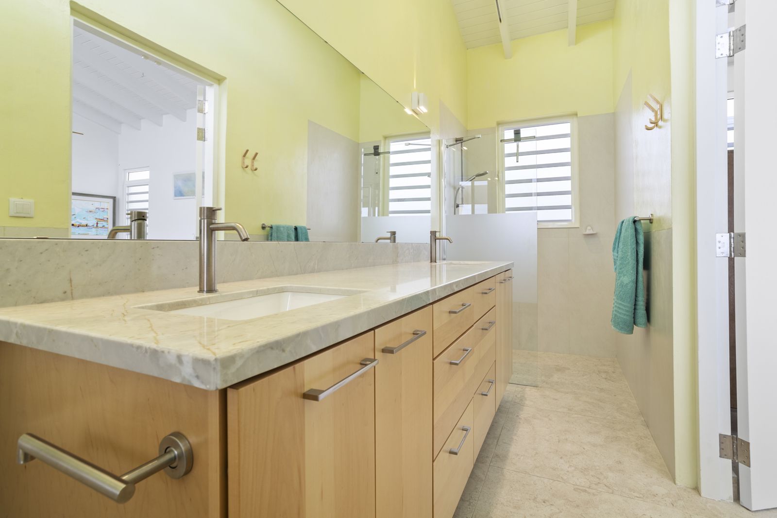 The spacious primary bedroom overlooks the Caribbean Sea and includes a refined en-suite bathroom with double sinks and a walk-in shower. The double-island kitchen is ideal for entertaining, offering ample workspace while allowing the chef to stay connected with guests at the bar and outdoor dining area. The layout is perfectly suited for couples seeking comfort, simplicity, and space, and it even includes a large, secure storage room for water sports equipment, a rare feature on Bonaire.