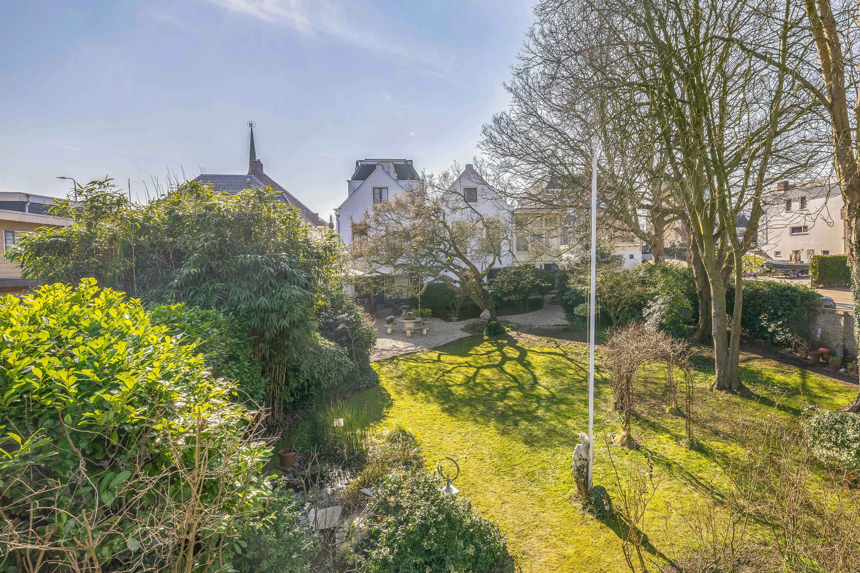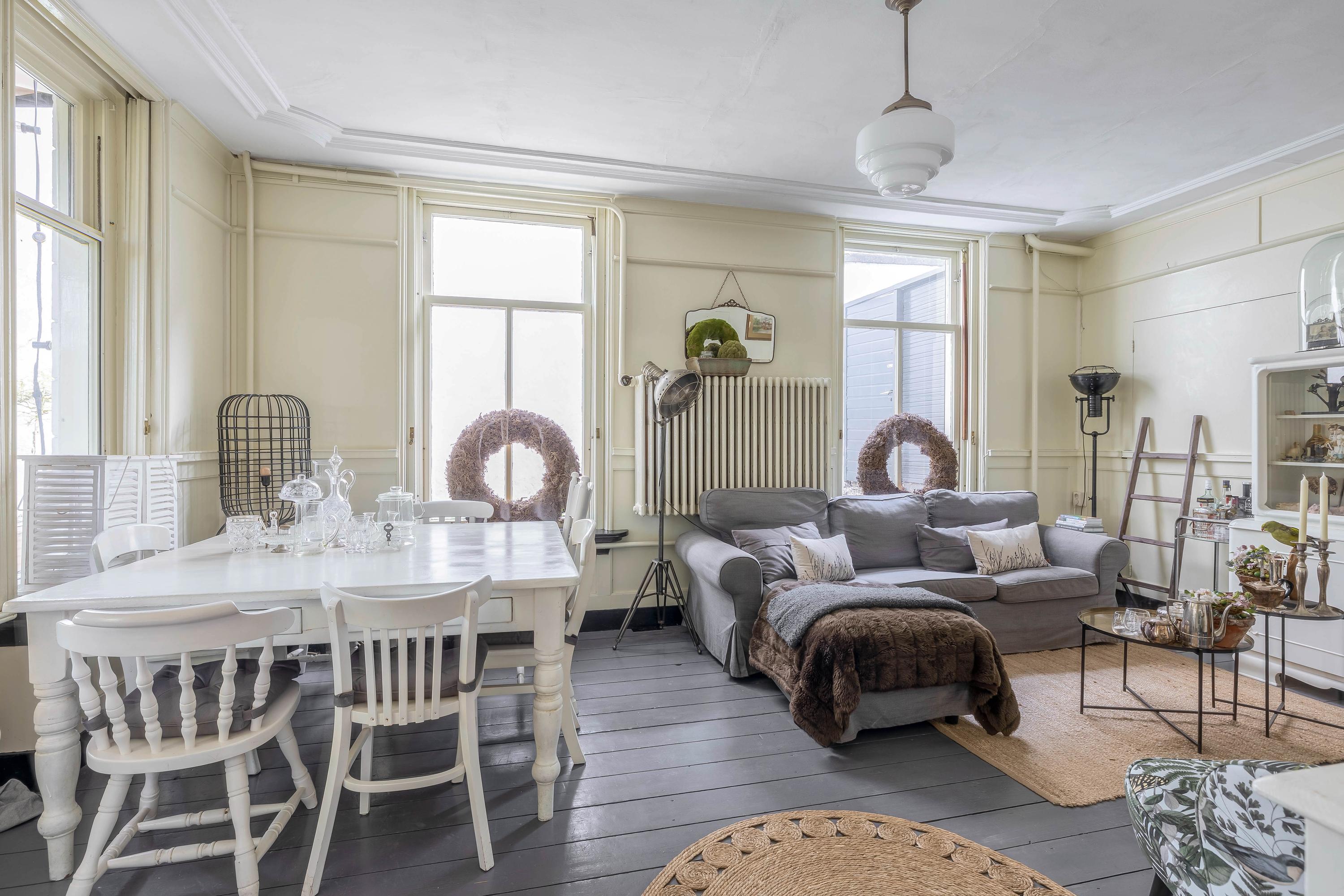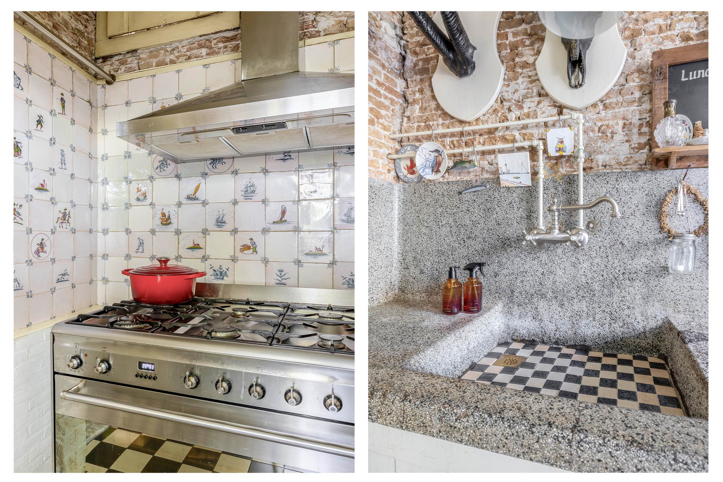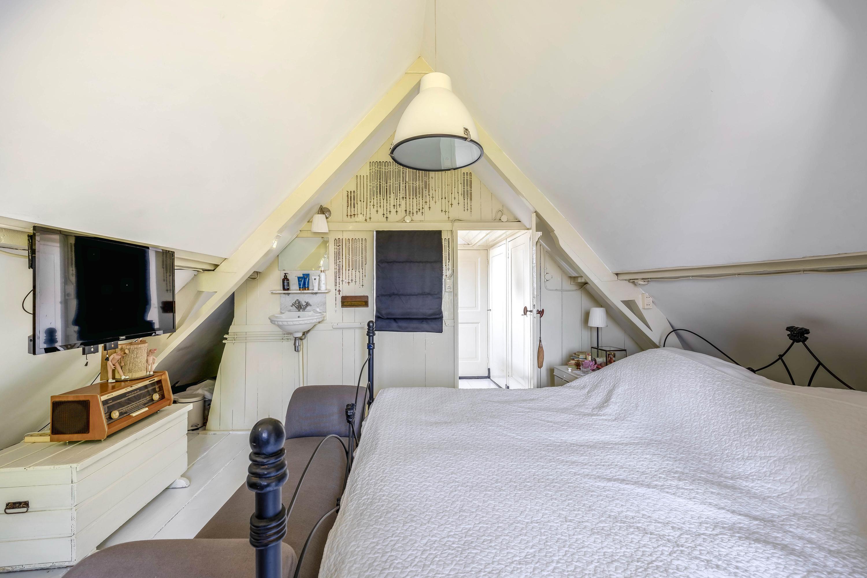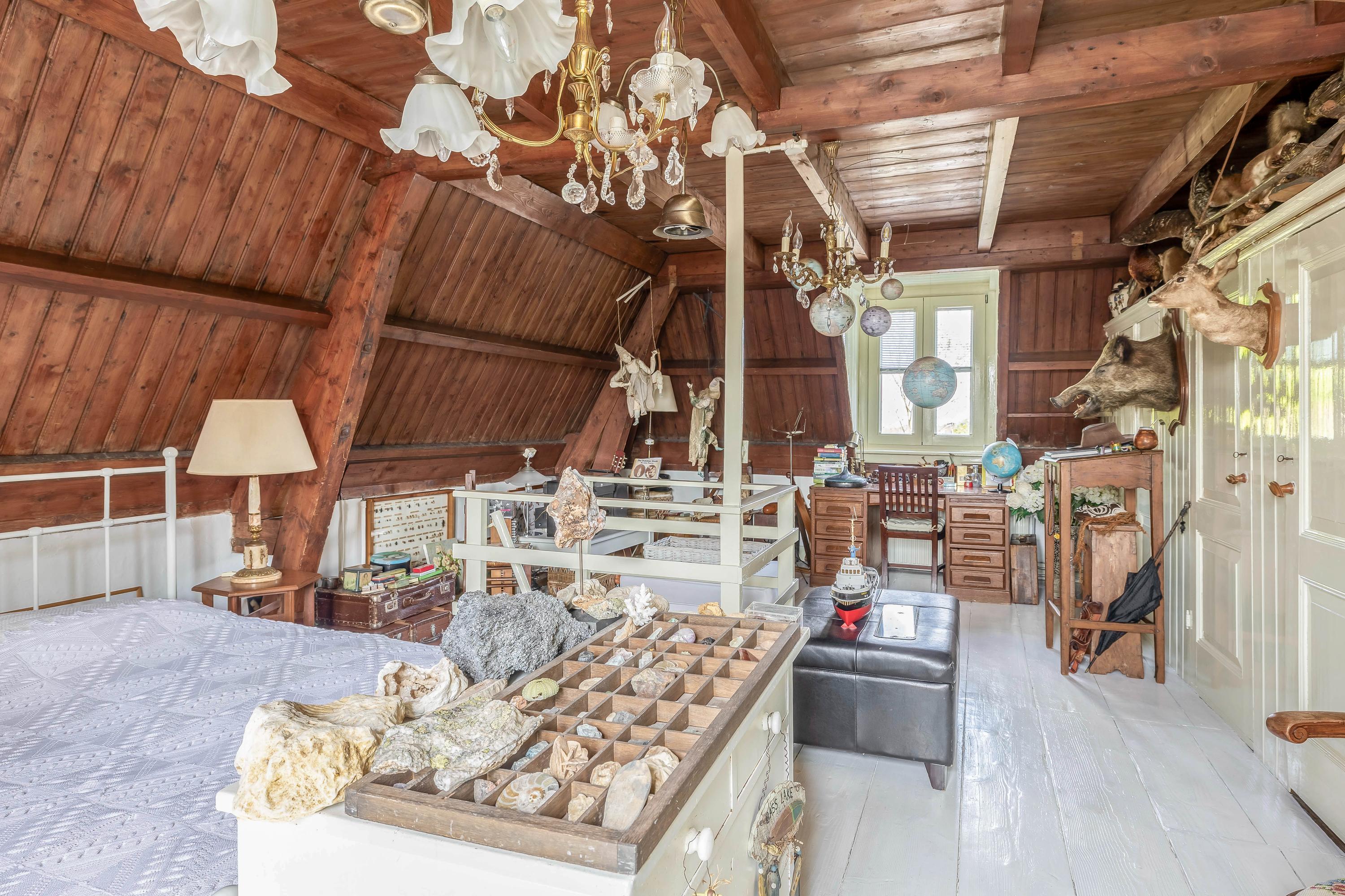 At dike level, you’ll find the charming living room with fireplace and ceiling mural, a dining room connected to the stunning conservatory via sliding doors, a bedroom, and a bathroom with an antique bathtub.
