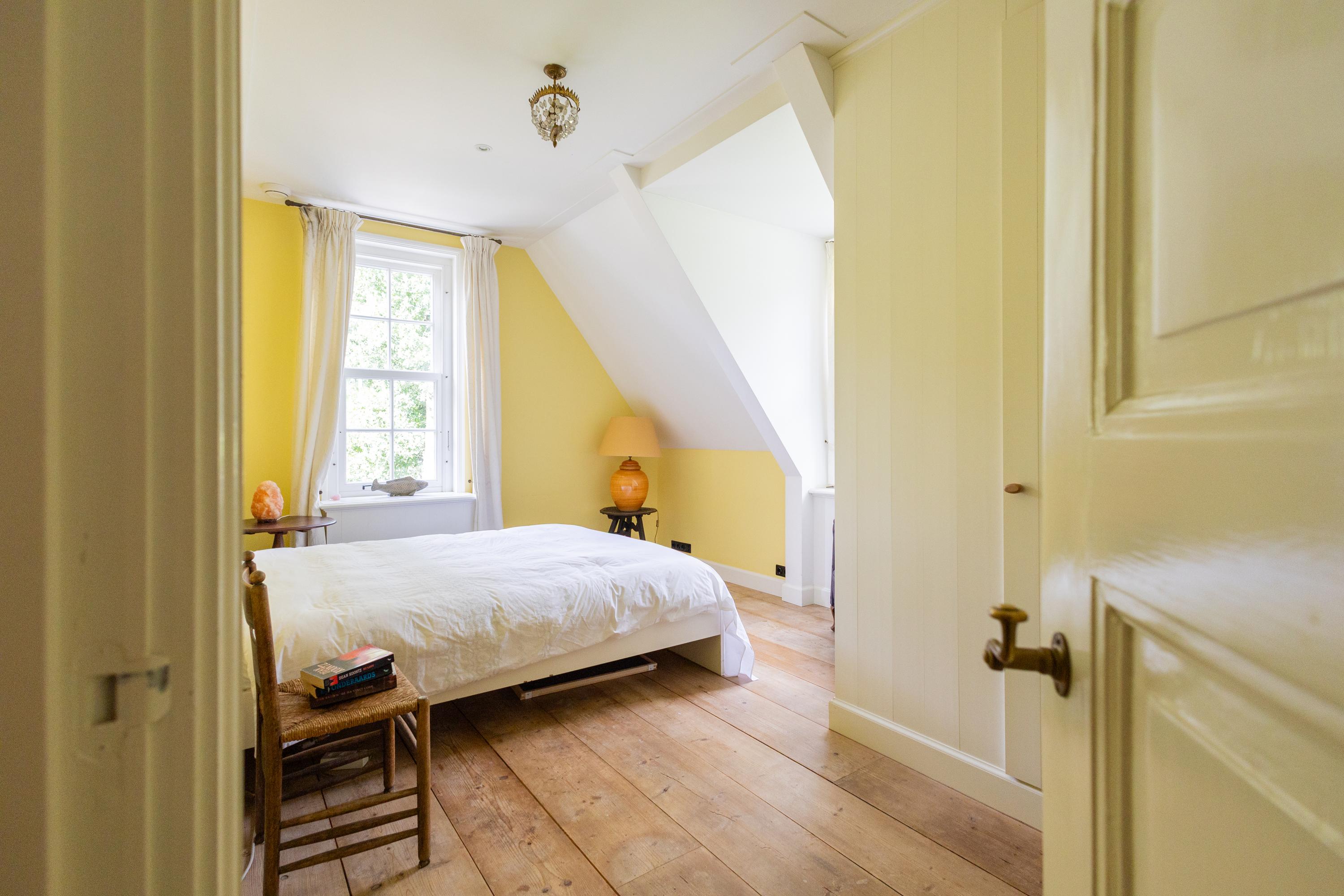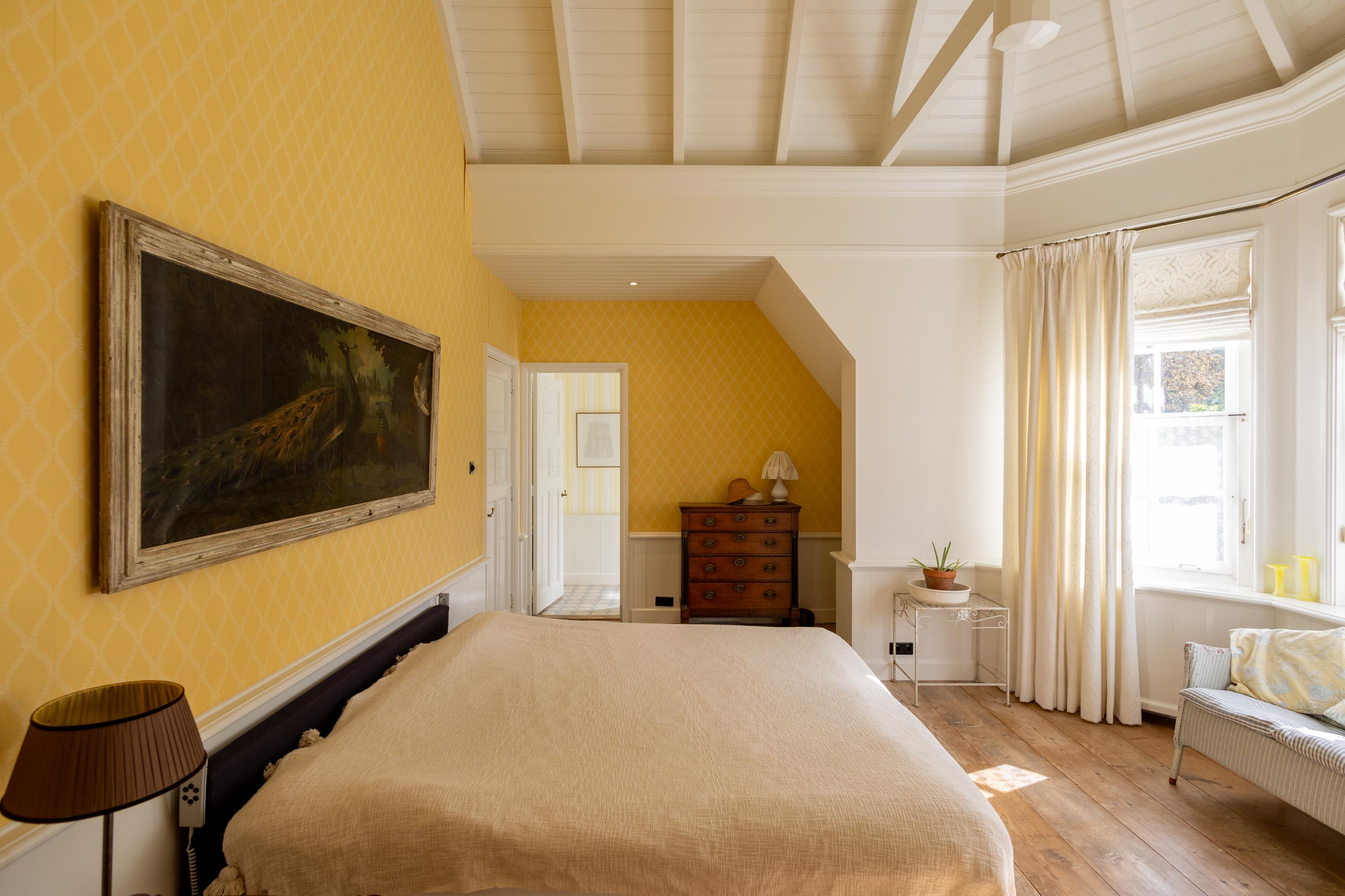 Continuing up the staircase, the second floor reveals a charming attic room, also with a private bathroom.