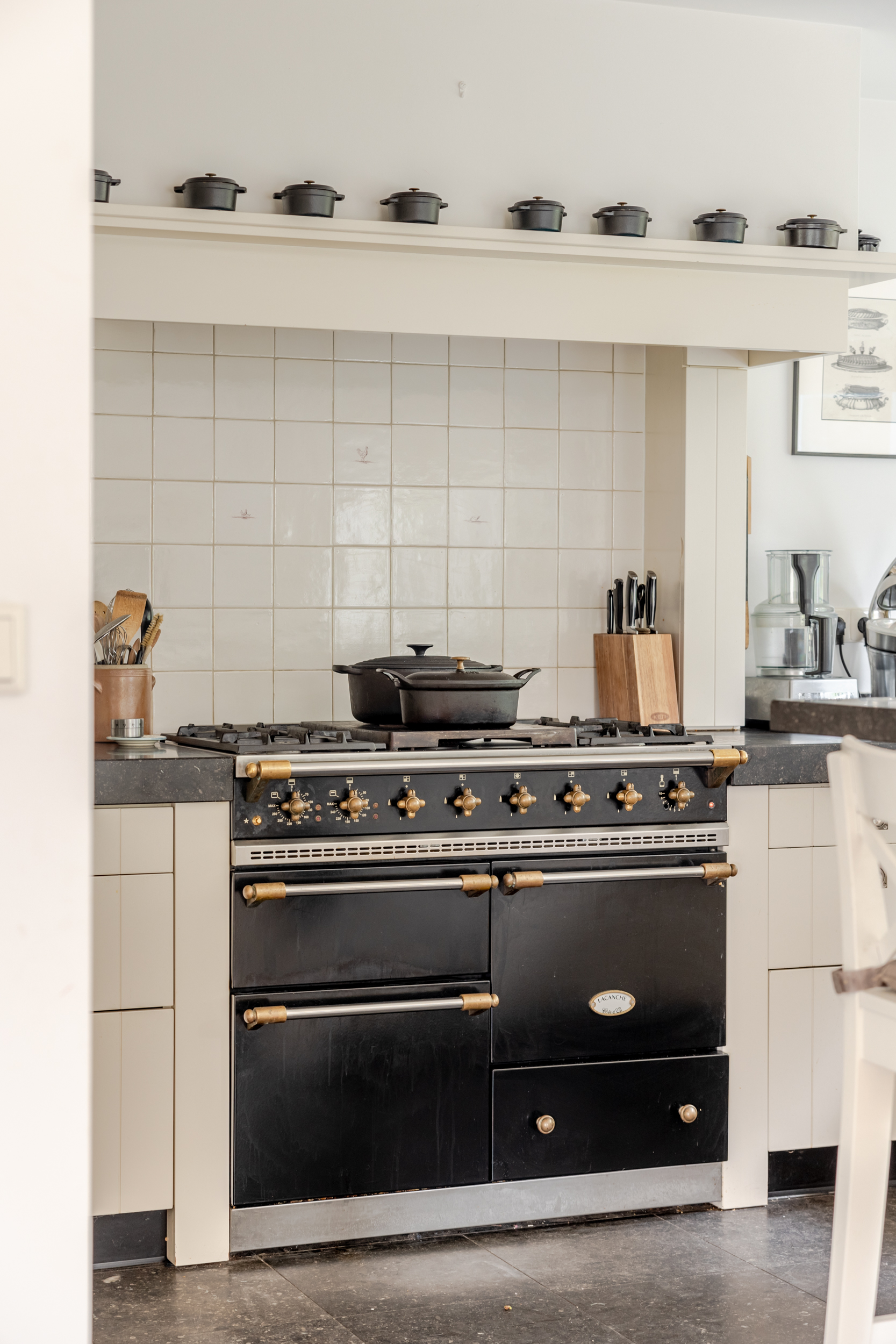 Kitchen and dining area (approx. 6.30 x 4.05 m) with a luxurious U-shaped layout. It includes a hardstone countertop with sink, a 90 cm wide “Lacanche” gas range (5-burner with multiple oven compartments), refrigerator, freezer, microwave, dishwasher, and various upper and lower cabinets.