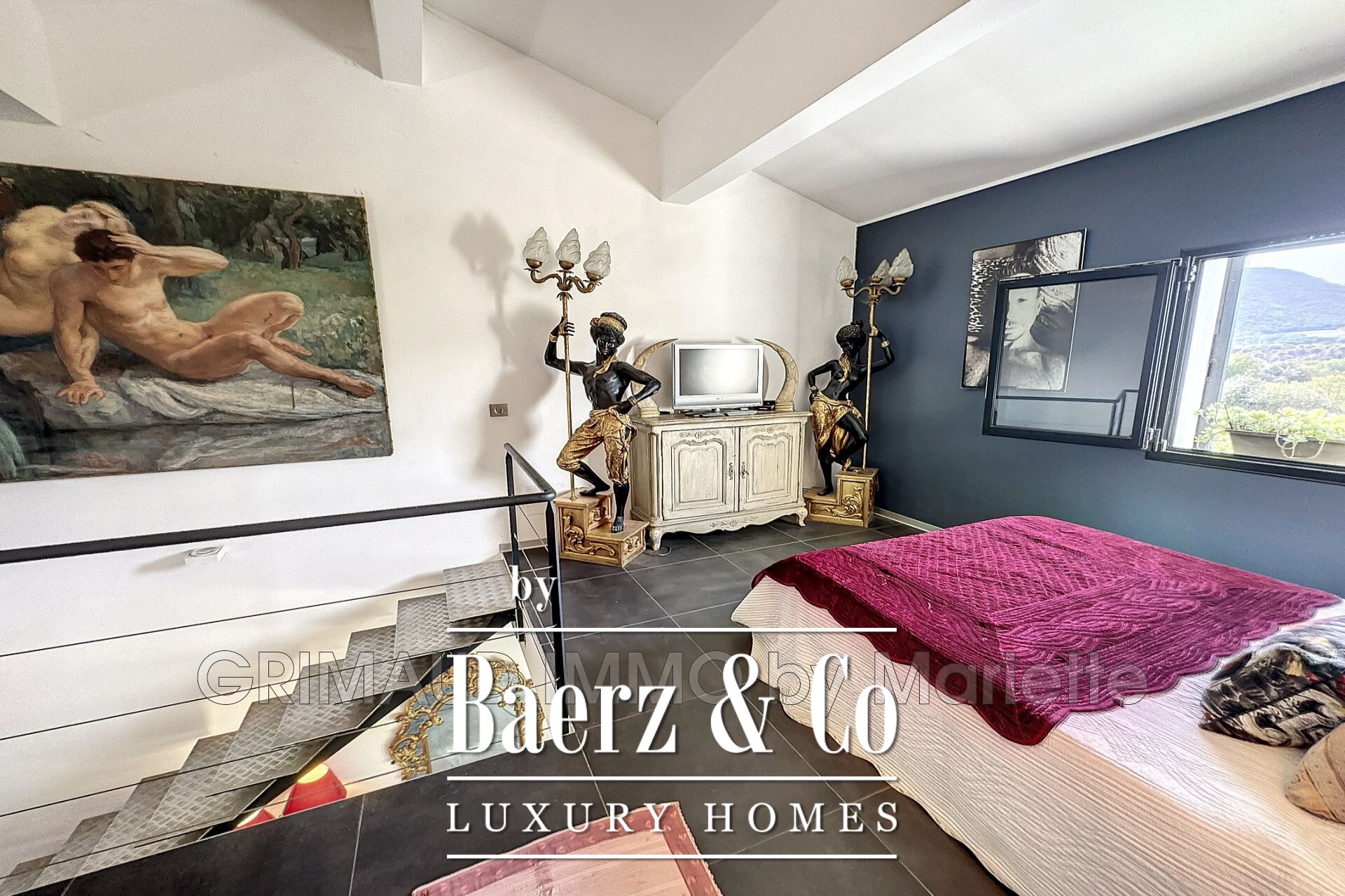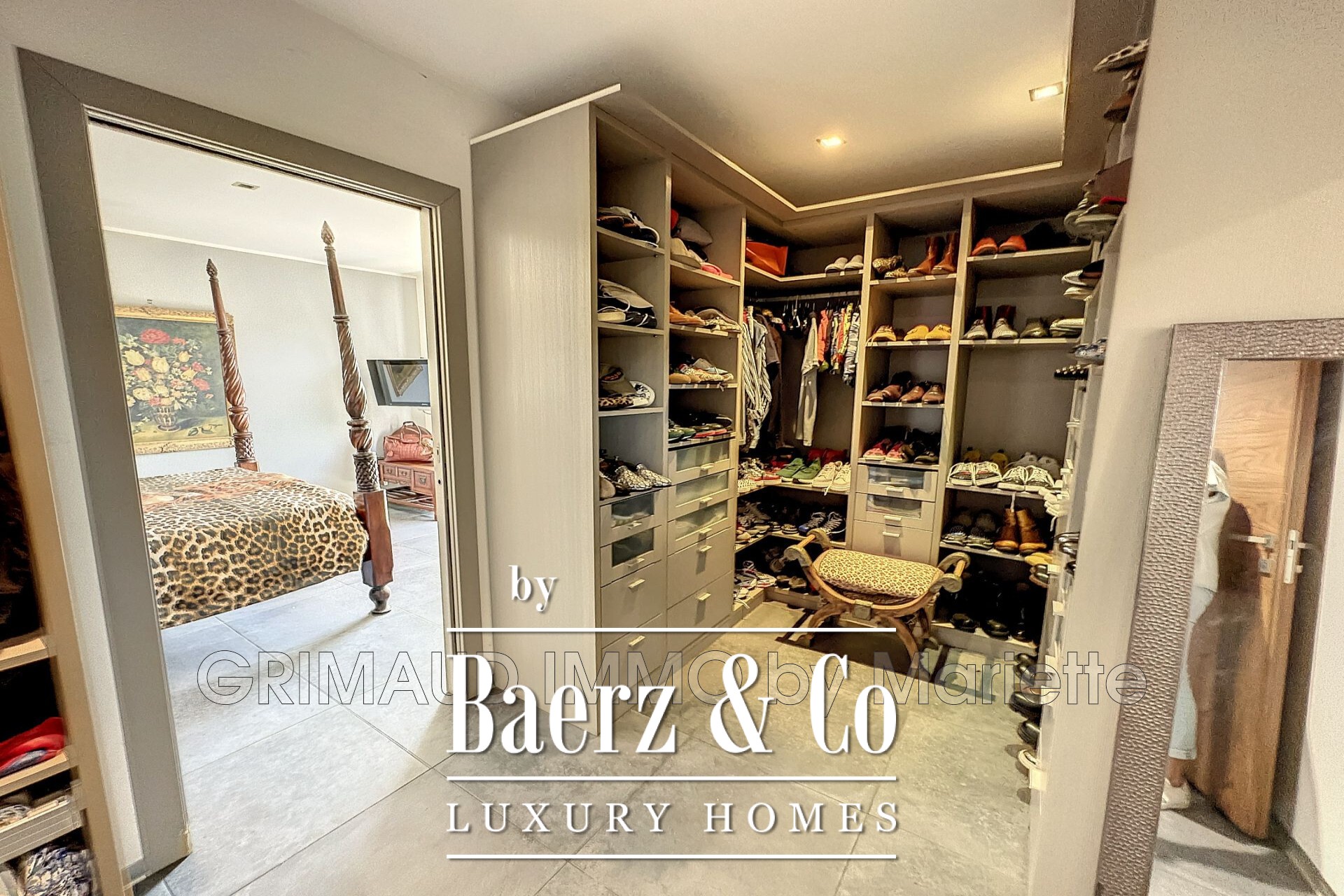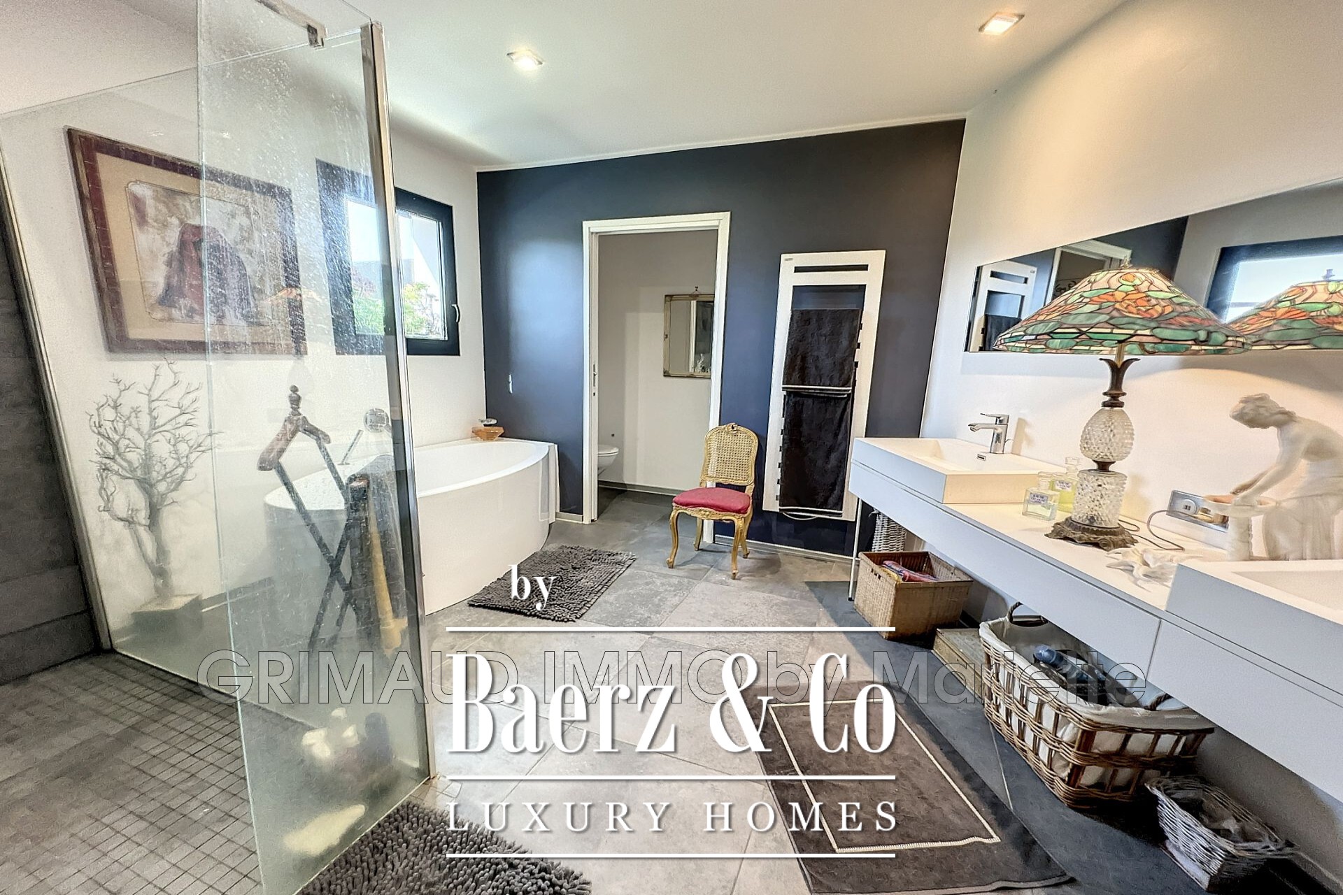 as well as a shower room with a toilet. The master suite includes its own bathroom with a toilet and a walk-in closet. Another bedroom with a mezzanine also benefits from its own shower room with a toilet. Outside, a magnificent 14-meter swimming pool awaits you, along with ample parking, a garage, and a laundry room. For more properties, visit our website: www.grimaudimmo.com