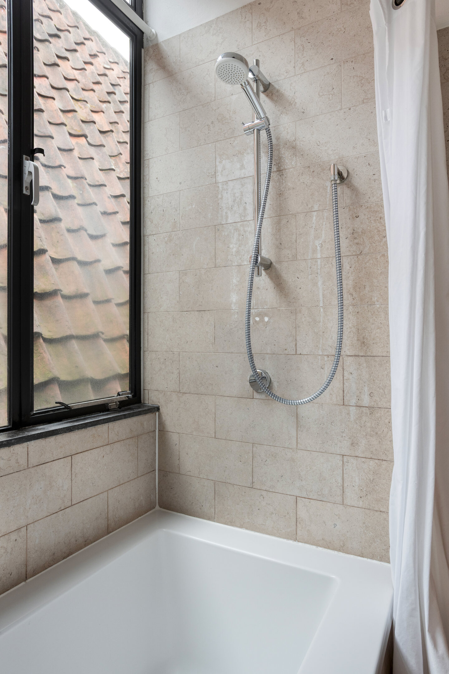 Overloop. Ruime slaapkamers met hoge balkenplafonds aan voor- en achterzijde. Moderne badkamer met douche, wc en wastafel.