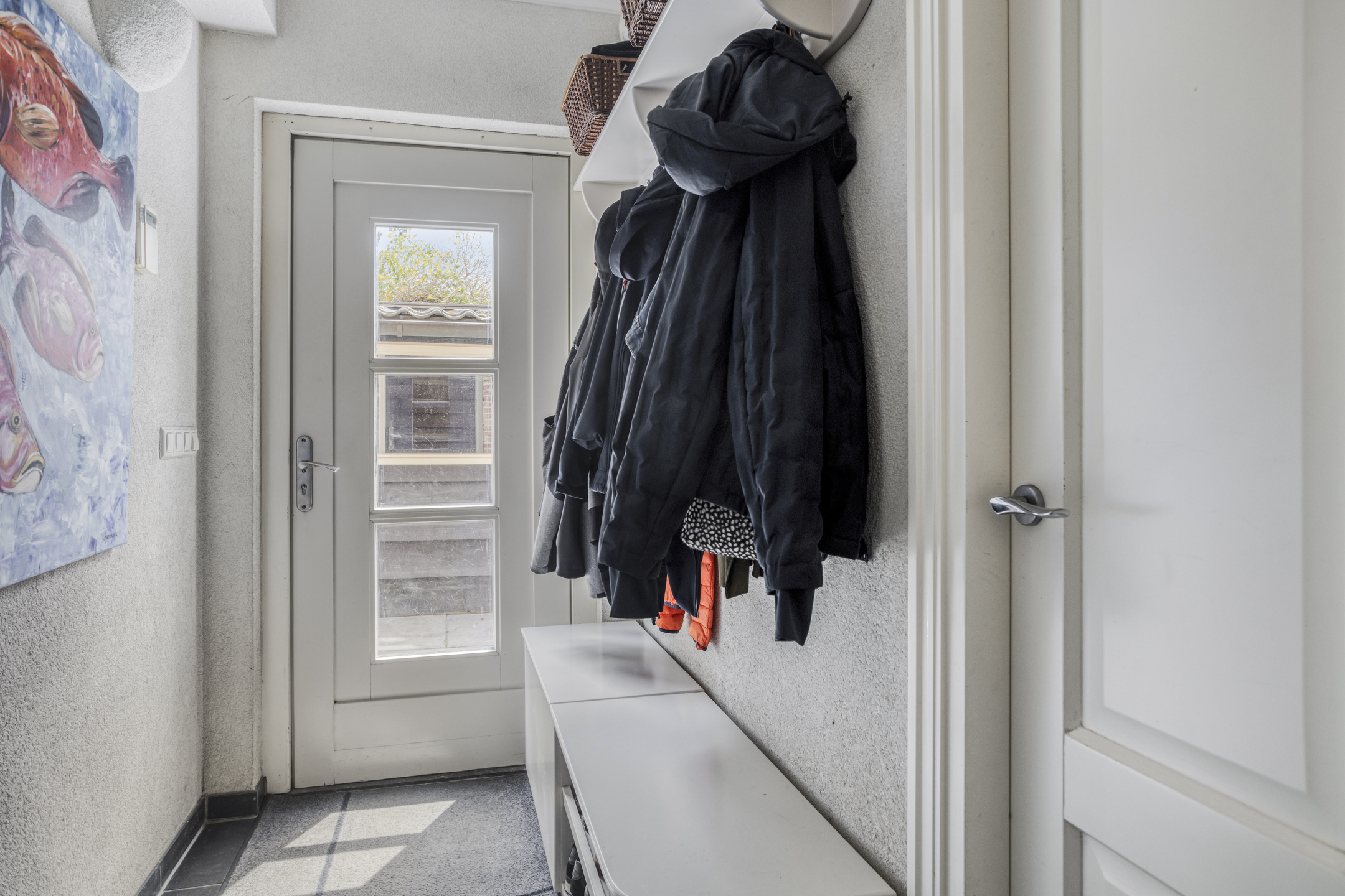 Hal/entree, wandafwerking sierpleister, natuurstenen vloer, schuurwerk plafond vv. inbouwspots;