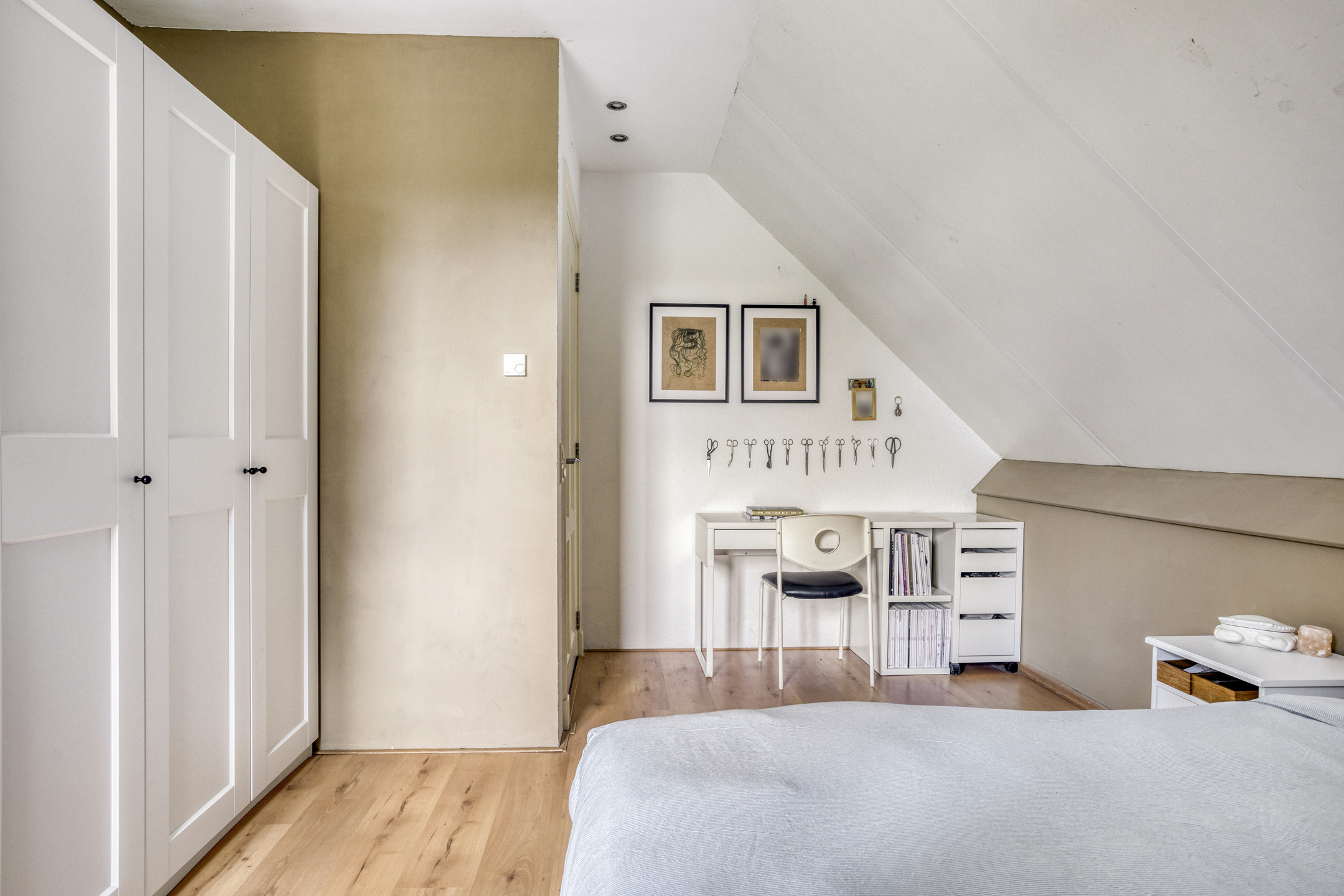 slaapkamer links voor (ca. 16 m²) met airco-installatie, wandafwerking sierpleister en stucwerk, vloer afgewerkt met laminaat, schuurwerk plafond;