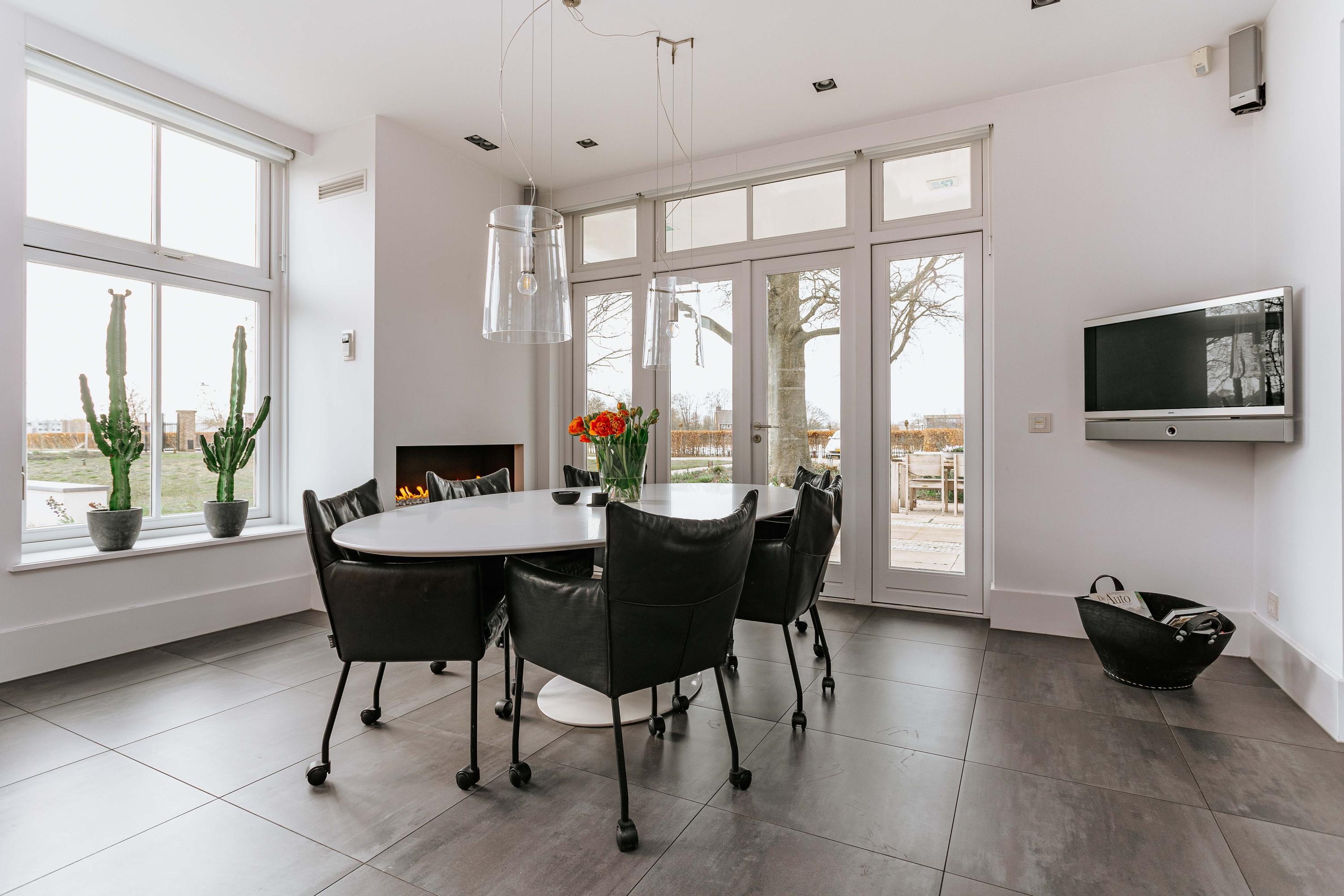 At the front of the house is the large luxury kitchen, equipped with a sink island and luxury built-in appliances, a gas fireplace, and French doors to the terrace. The large, cozy living room also has a gas fireplace, French doors to the terrace, and access to the kitchen and the spacious, cozy dining room through steel revolving doors. Hidden behind a door in the hall is the luxurious trio of bedroom, dressing room, and bathroom. This spacious master bedroom with gas fireplace overlooks and has access to the garden. There is also a separate toilet.