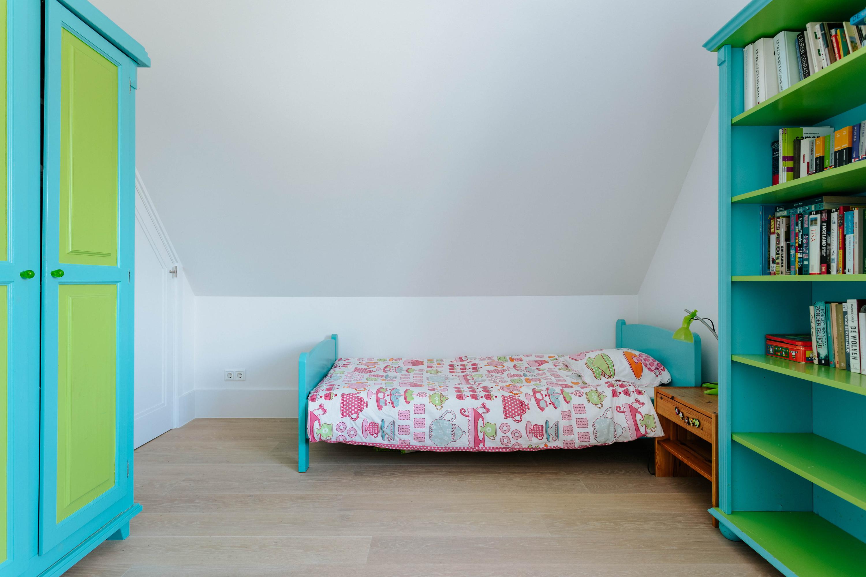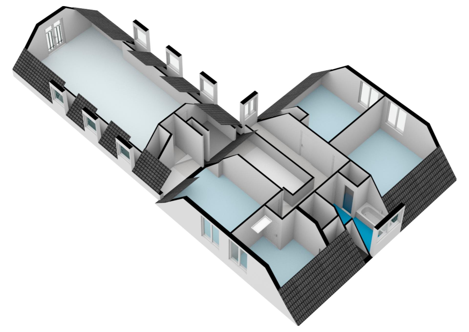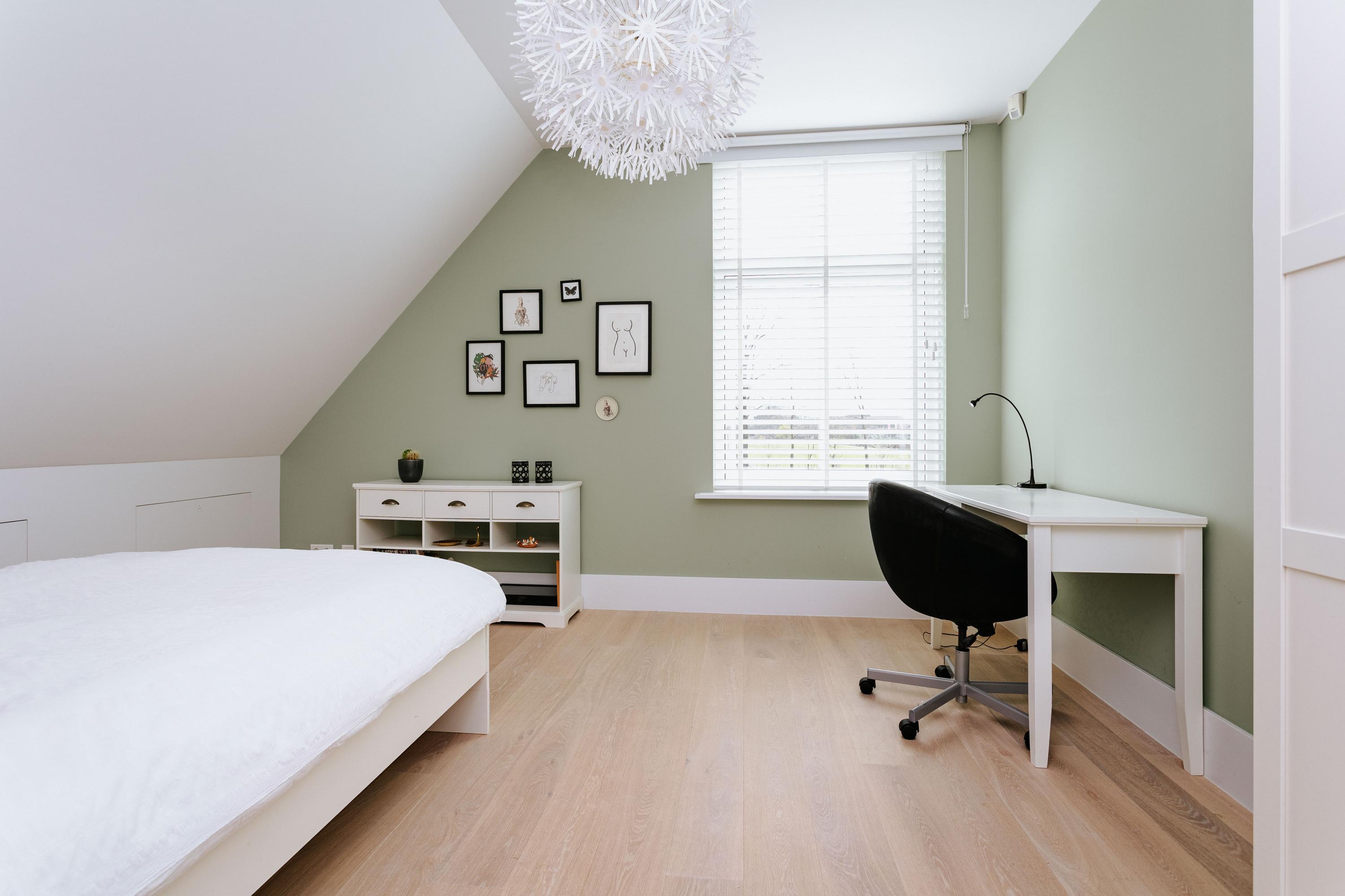 The illuminated, centrally located staircase leads us to the sleeping area, where there are four spacious bedrooms with beautiful views, a second luxurious bathroom, and a separate toilet. The staircase at the rear of the house leads to a very large room with built-in cupboards and six dormer windows, which is currently used as a study. Here, too, we can enjoy beautiful views.