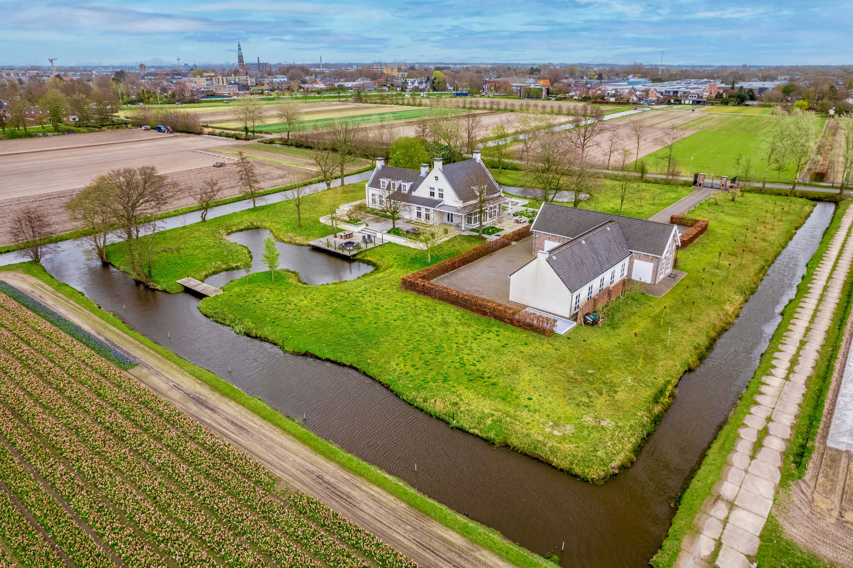 The plot is surrounded by water and enclosed by an electric decorative fence with anti-intrusion bollards. The spacious garden has several terraces, verandas, 2 ponds, beautiful trees, hedges, and flower beds. Here you can enjoy the scents and colors of the bulb fields.
