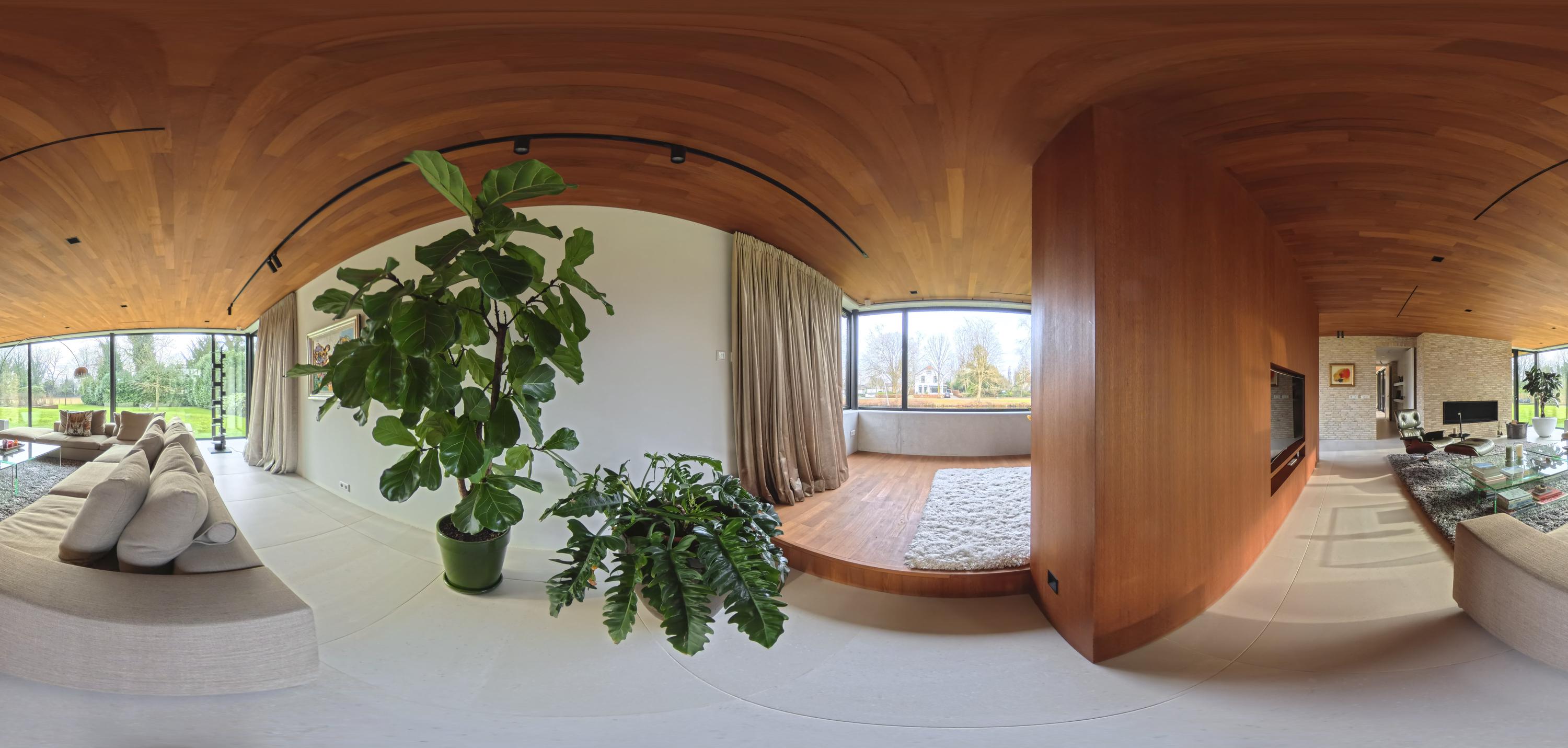The living room (74 m²) is spacious and divided into two seating areas by a room divider with an integrated television and bookcase. At the rear, floor-to-ceiling windows offer views of the garden, while at the front, the ponds come into view, with sufficient privacy thanks to the half-height parapet. A wide Metalfire fireplace and a raised teak floor area at the front give the room extra character. The sophisticated lighting plan ensures that art and architectural lines are shown to their best advantage.
