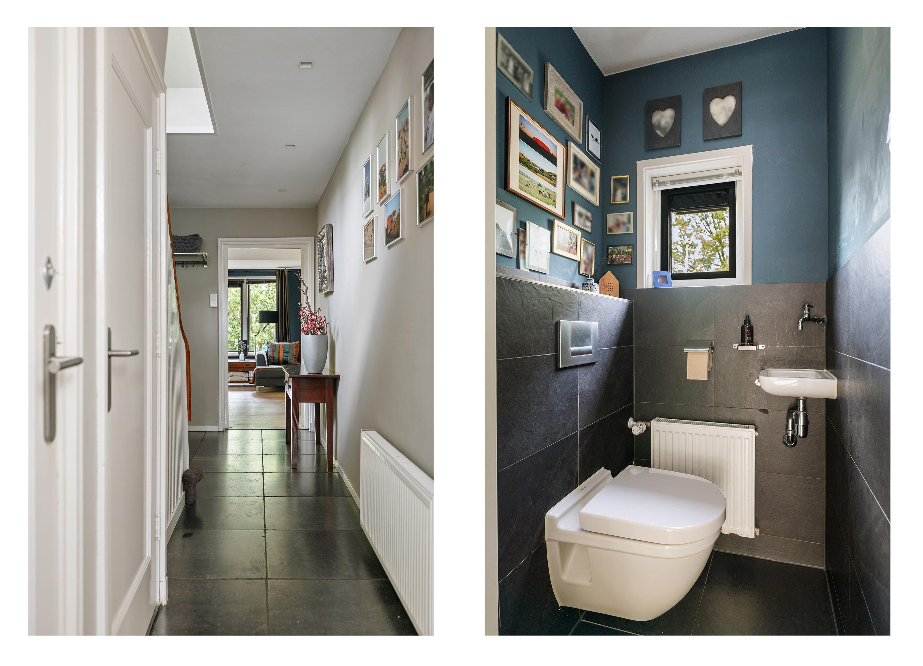 The sunny kitchen-diner (by Hans Croes Keukens en Interieurwerken) is located in the recent extension, designed by architect Ed Bergers (BVAB Architecten). Sleek, contemporary and filled with natural light, the kitchen features classic natural stone floor tiles with underfloor heating, creating a chic contrast with the oak cabinetry and light-coloured walls. The kitchen includes a central island with an anthracite composite worktop, a boiling-water tap, dishwasher and ample storage. Two bar stools make it an inviting place for a drink while cooking. The appliance wall contains a steam-assisted oven and combi microwave (both Miele), a large fridge and freezer, along with extensive cupboard space. Behind the kitchen is the second entrance, the so-called “back entrance”, with a hallway and four tall built-in cupboards.