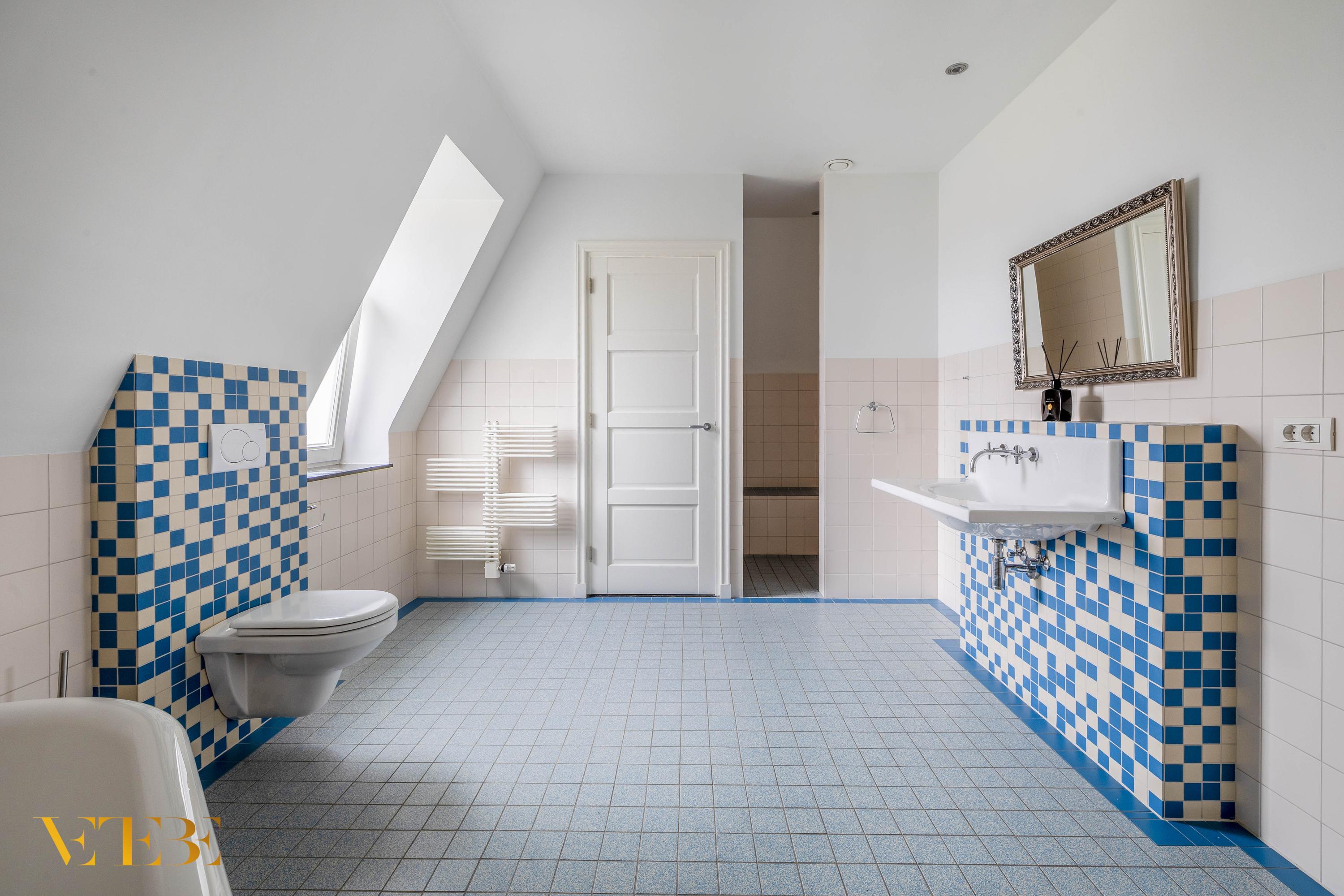 The bathroom (approx. 15 m²) features a tiled floor with underfloor heating, bathtub, walk-in shower, washbasin, toilet, and designer radiator. It is a spacious bathroom with a dormer window providing plenty of natural daylight.