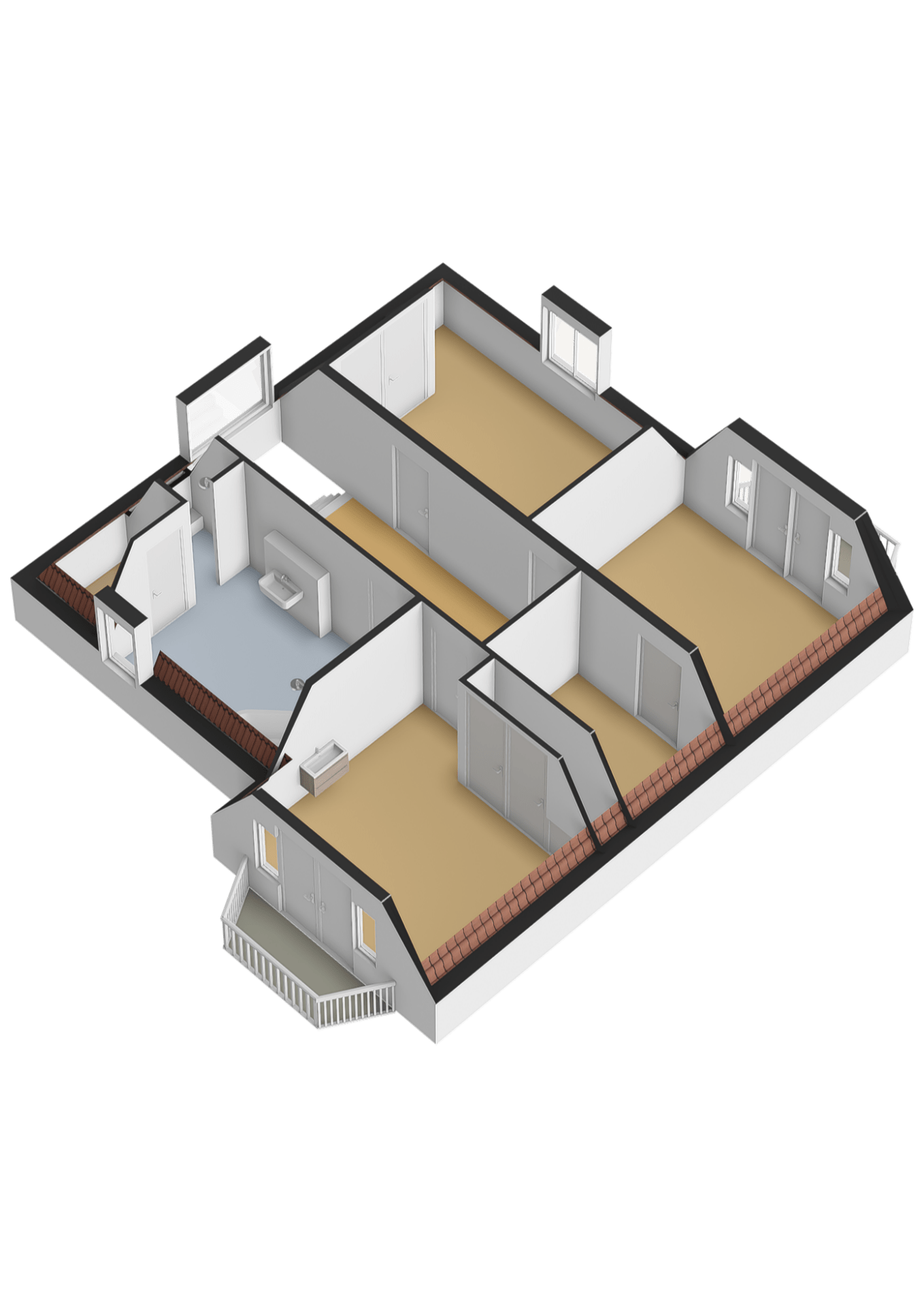 The spacious and bright landing features a tiled floor, dormer window, and laundry chute. From here, you can access the three bedrooms, bathroom, and storage room.