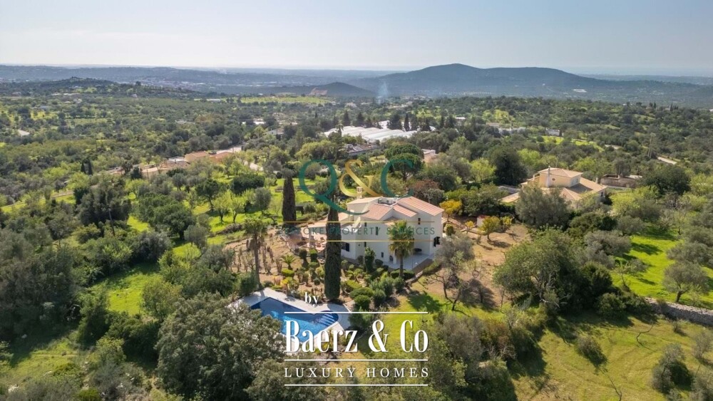 Villa Loulé presents a rare sense of calm just five minutes from the vibrant market town of Loule, with captivating sea and countryside views. This villa rests on a 6,720 m² plot, embraced by established gardens and a distinct rhythm of space and light. The 440 m² residence welcomes you with an open plan living and dining area, anchored by a fireplace and direct access to a broad terrace. The kitchen is well-proportioned and equipped for daily living. On the main floor, the master ensuite offers a generous walk-in dressing room, complemented by a family bathroom.
