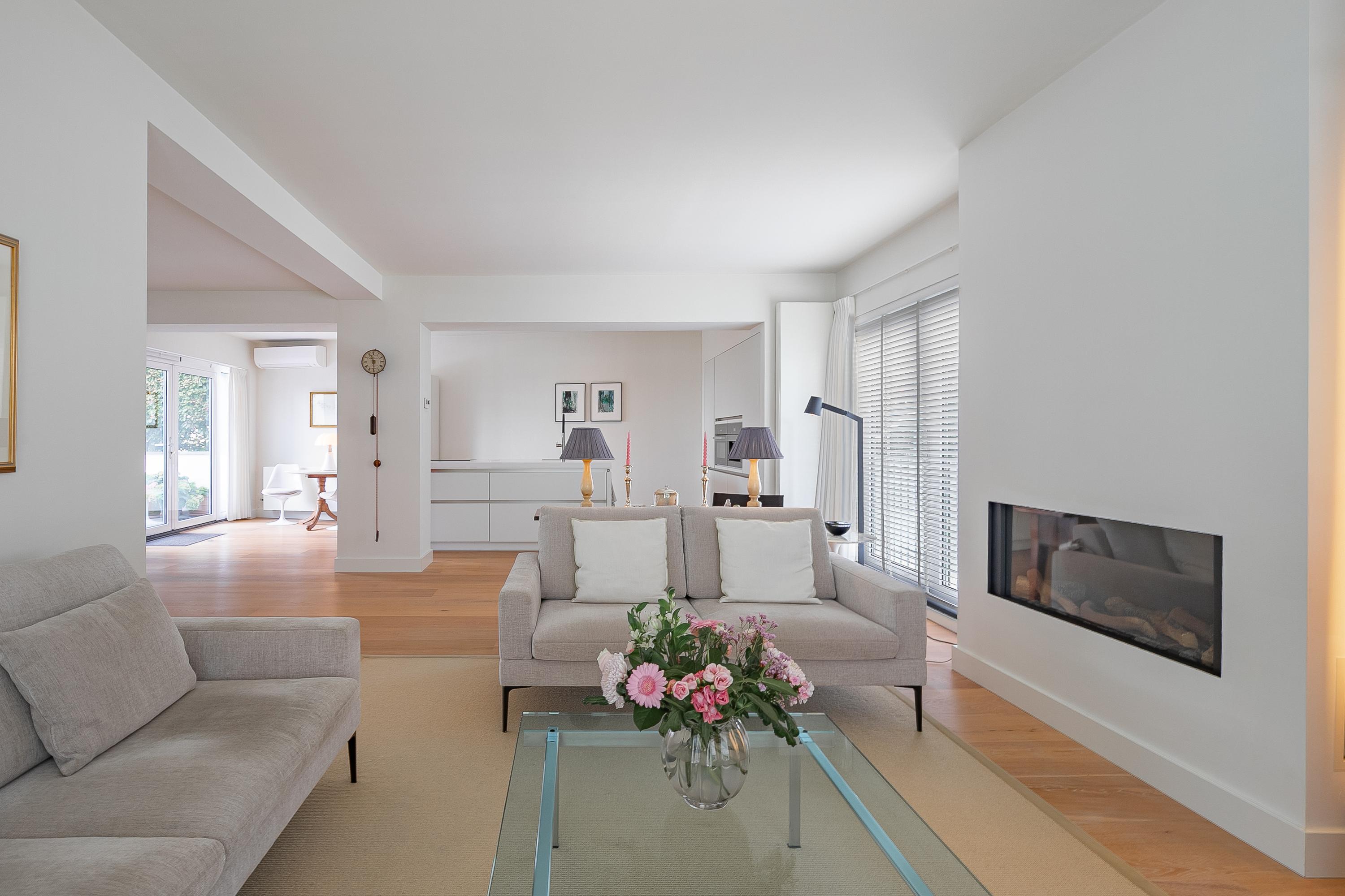 Through the representative entrance with a stylish wardrobe, open loft and access to the guest toilet with wall-mounted toilet and washbasin, the meter cupboard and the bright, spacious living room (approx. 68m²). The living room has an attractive Faber gas fireplace that is serviced annually and provides extra warmth and atmosphere on cold days. The designer radiators and beautiful parquet flooring add extra style to the room.