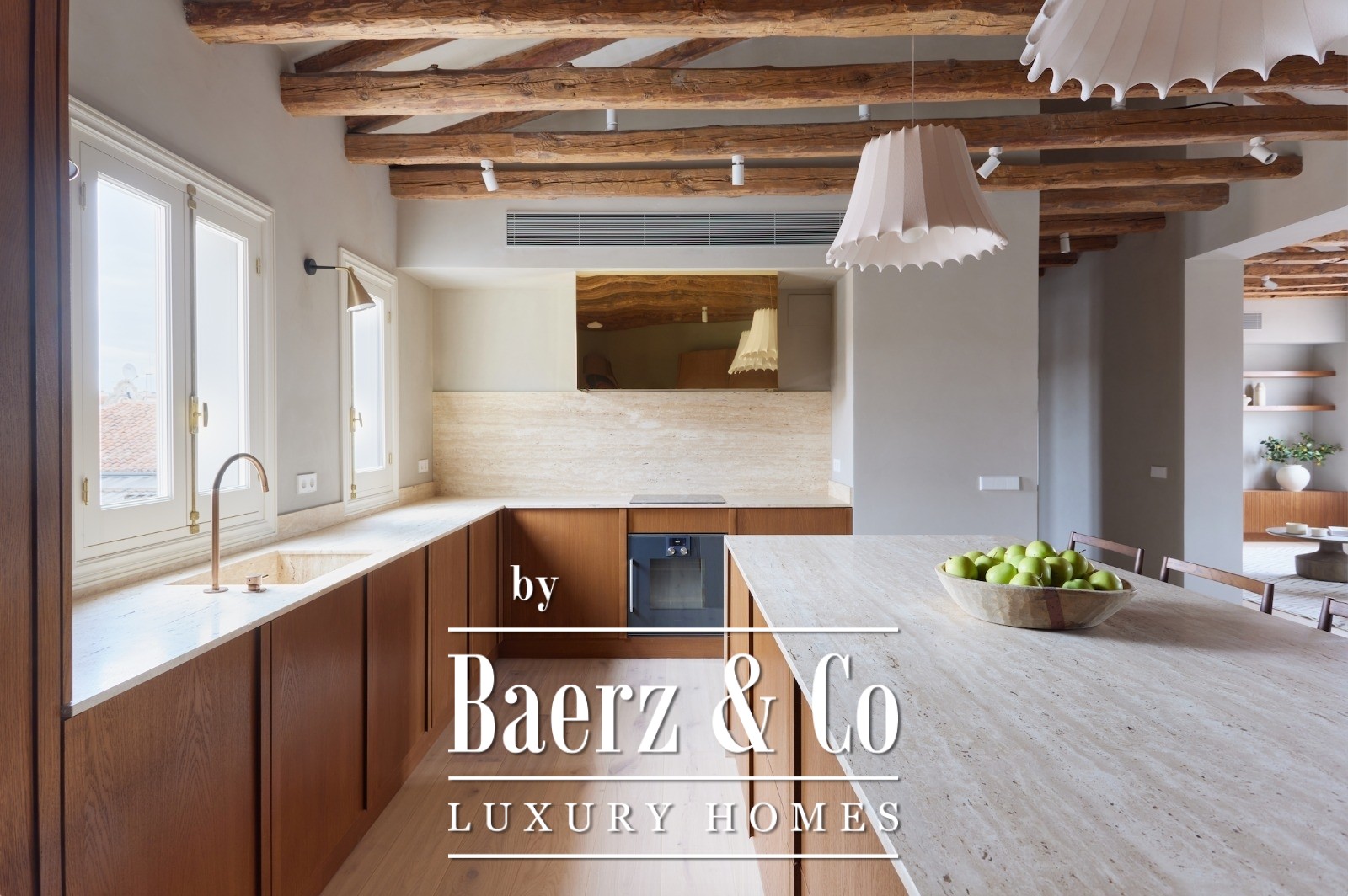 The layout is considered and open. Three large en-suite bedrooms ensure privacy and comfort, complemented by a guest toilet. The open-plan living and dining area invites connection and relaxation, while the kitchen, furnished with Gaggenau appliances, sets an uncompromising standard for culinary ease.