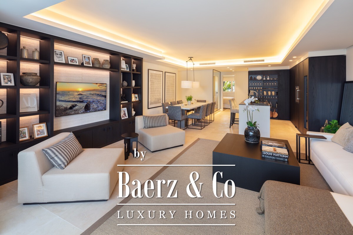 Apartment Marbella is presented at the heart of the five star Puente Romano resort, distinguished by a meticulous renovation that elevates everyday living. The living area spans 138 m², designed with an open plan arrangement that channels natural light throughout the south facing interior. A custom kitchen, crafted with oak cabinetry and Gaggenau appliances, merges seamlessly with the lounge, flowing onto a private terrace set against curated communal gardens.