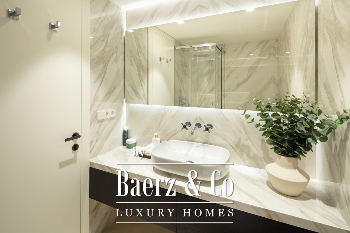 The residence accommodates three bedrooms and three bathrooms, including a master suite that grants direct access to the main terrace. Materials and finishes are restraint and tactile, reflecting an understated sophistication. Further comforts include A/C, underfloor heating, a fireplace, private parking, and a storage room.