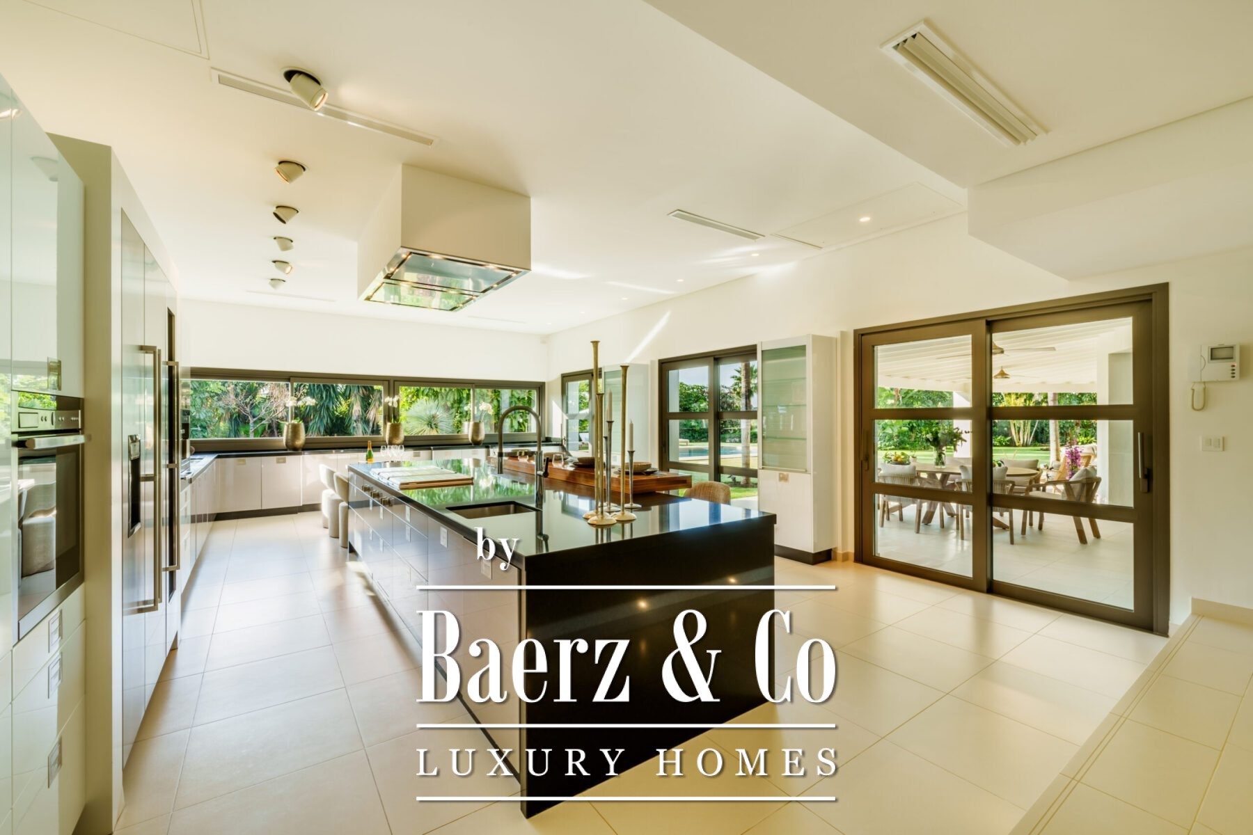Stepping inside, the rhythm of the house is established as light and landscape intertwine. All five bedrooms, each serene, open directly onto the mature gardens; generous living spaces include two voluminous lounges, an open-plan professional Danespan kitchen with a central island, and a tranquil library and office. The villa offers five bathrooms, including two en-suite bedrooms with private garden access, as well as wraparound covered terraces crafted for year-round enjoyment.