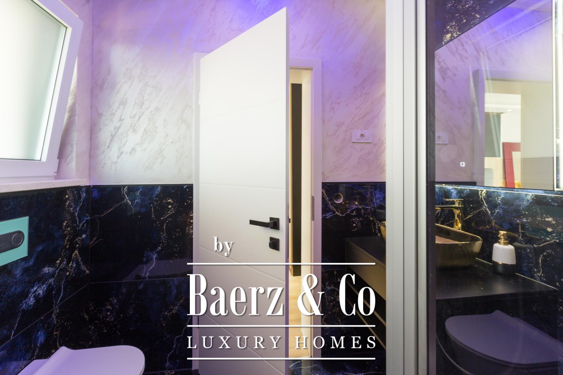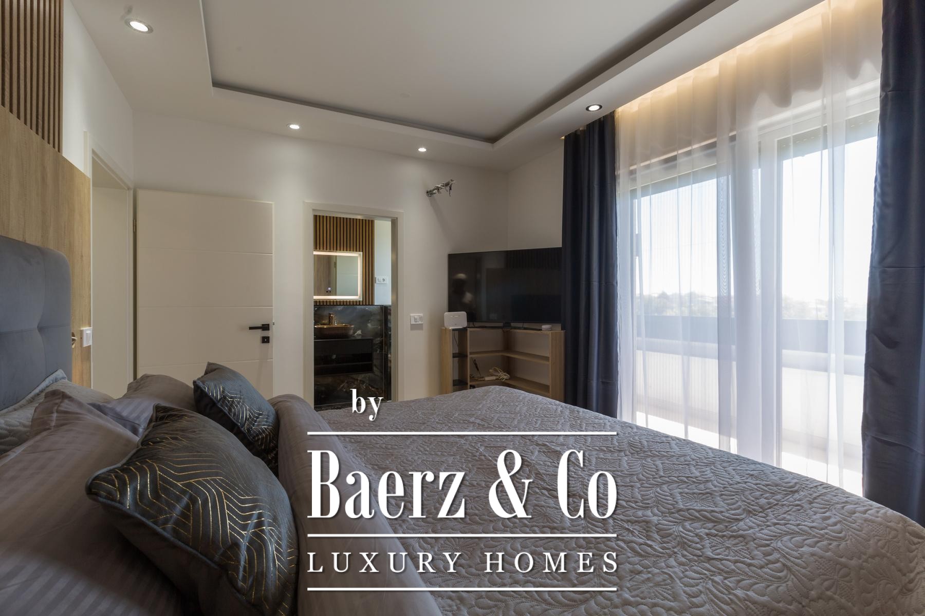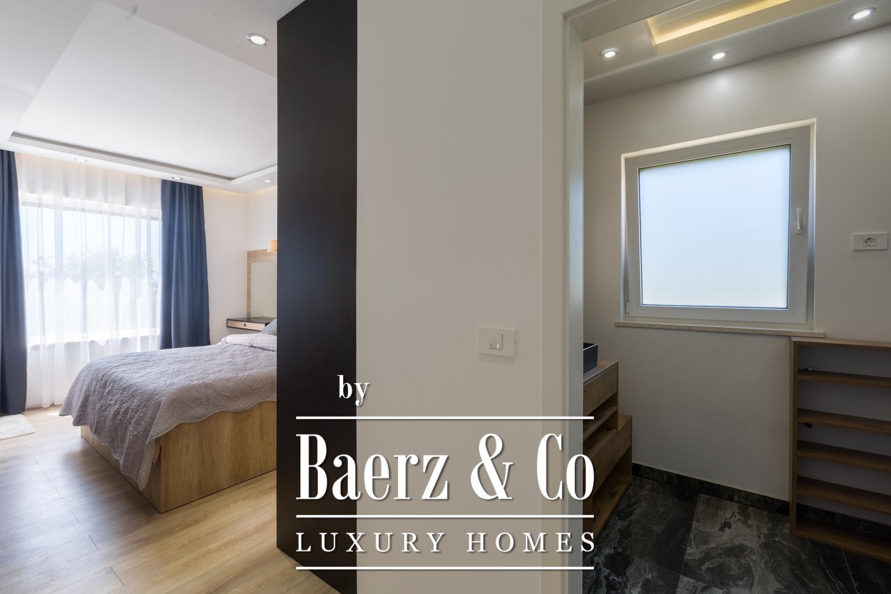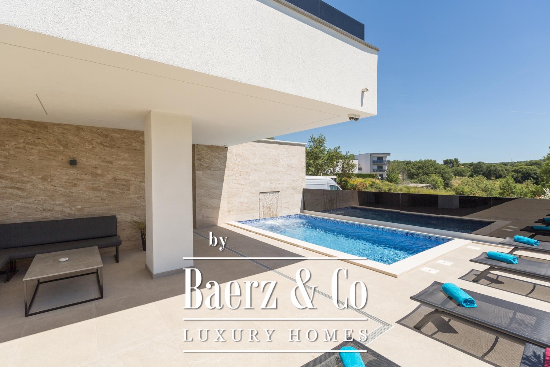 Ascending a sculptural staircase reveals three serene bedrooms, each with en suite bathrooms appointed in premium finishes. The master suite distinguishes itself with additional space, and all bedrooms access a covered terrace overlooking the garden. The villa’s smart home system orchestrates lighting, climate, and security with efficiency and discretion. Additional amenities include a fireplace, a dedicated storage room, and parking for three vehicles subtly set below the main entrance level. Delivered fully furnished with contemporary design, this luxury villa for sale in Medulin balances quiet modernity with Mediterranean warmth, placing nature, culture, and refined coastal living within reach.