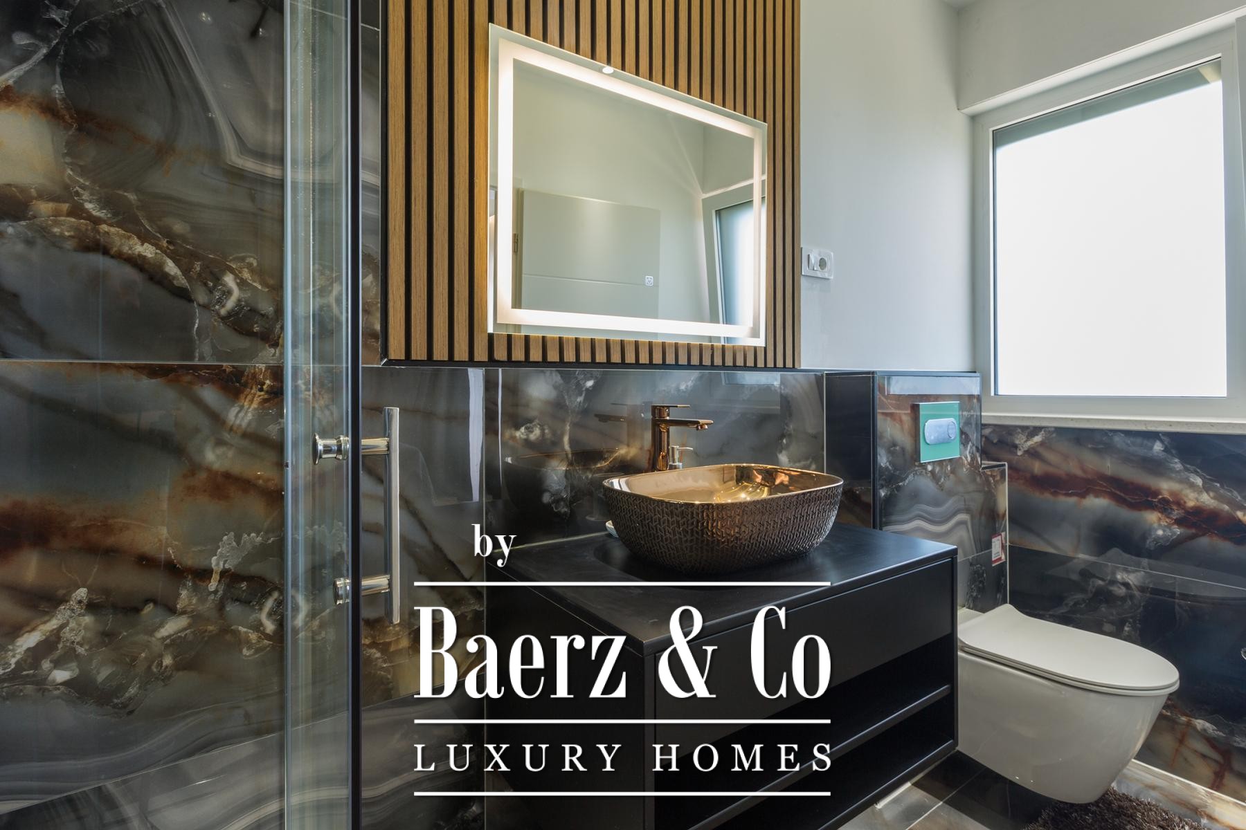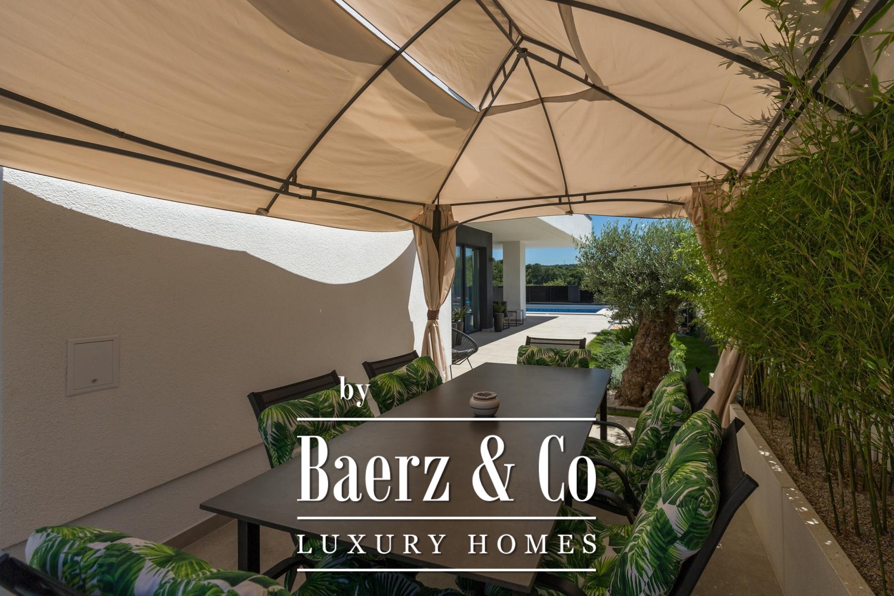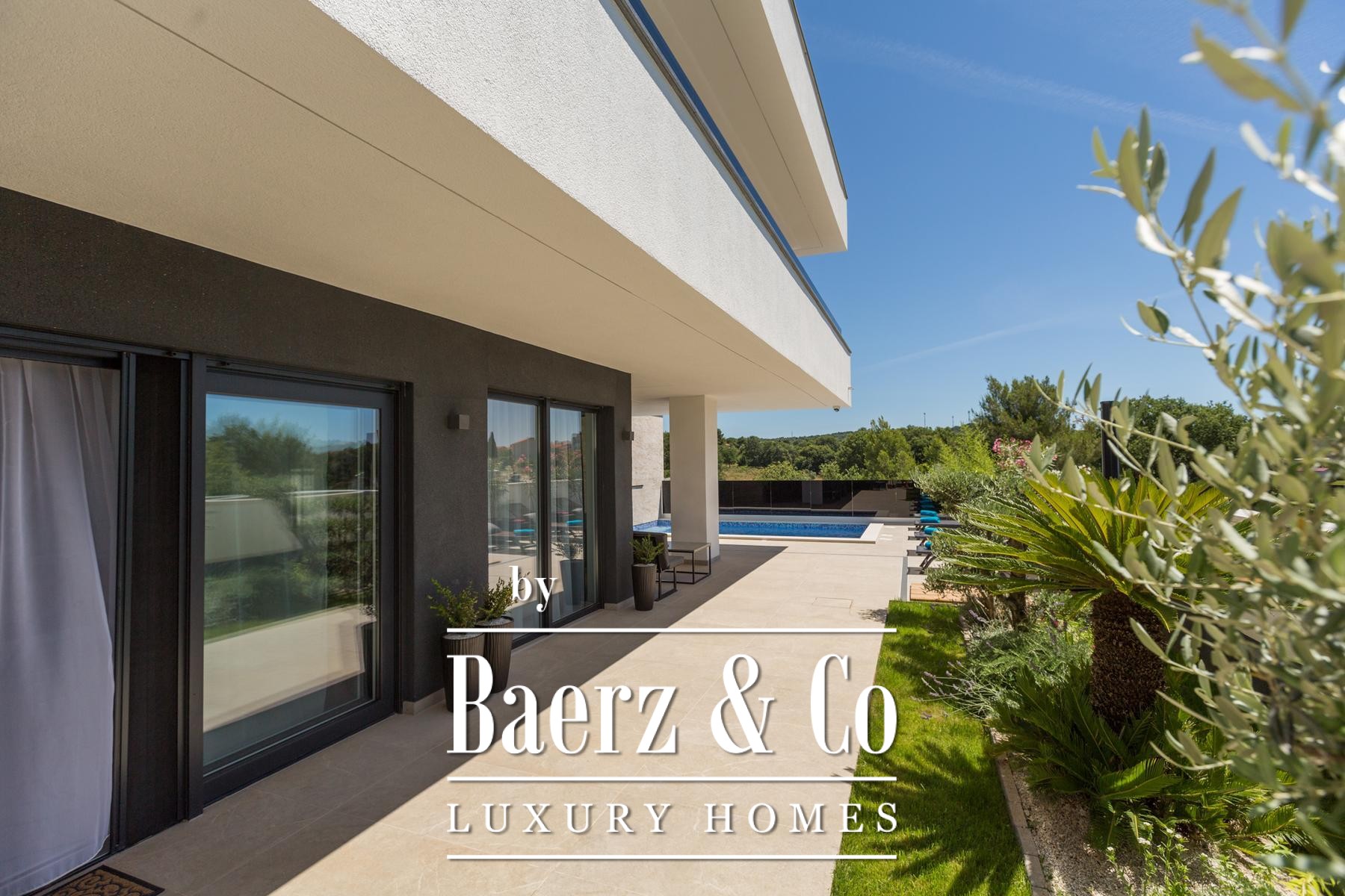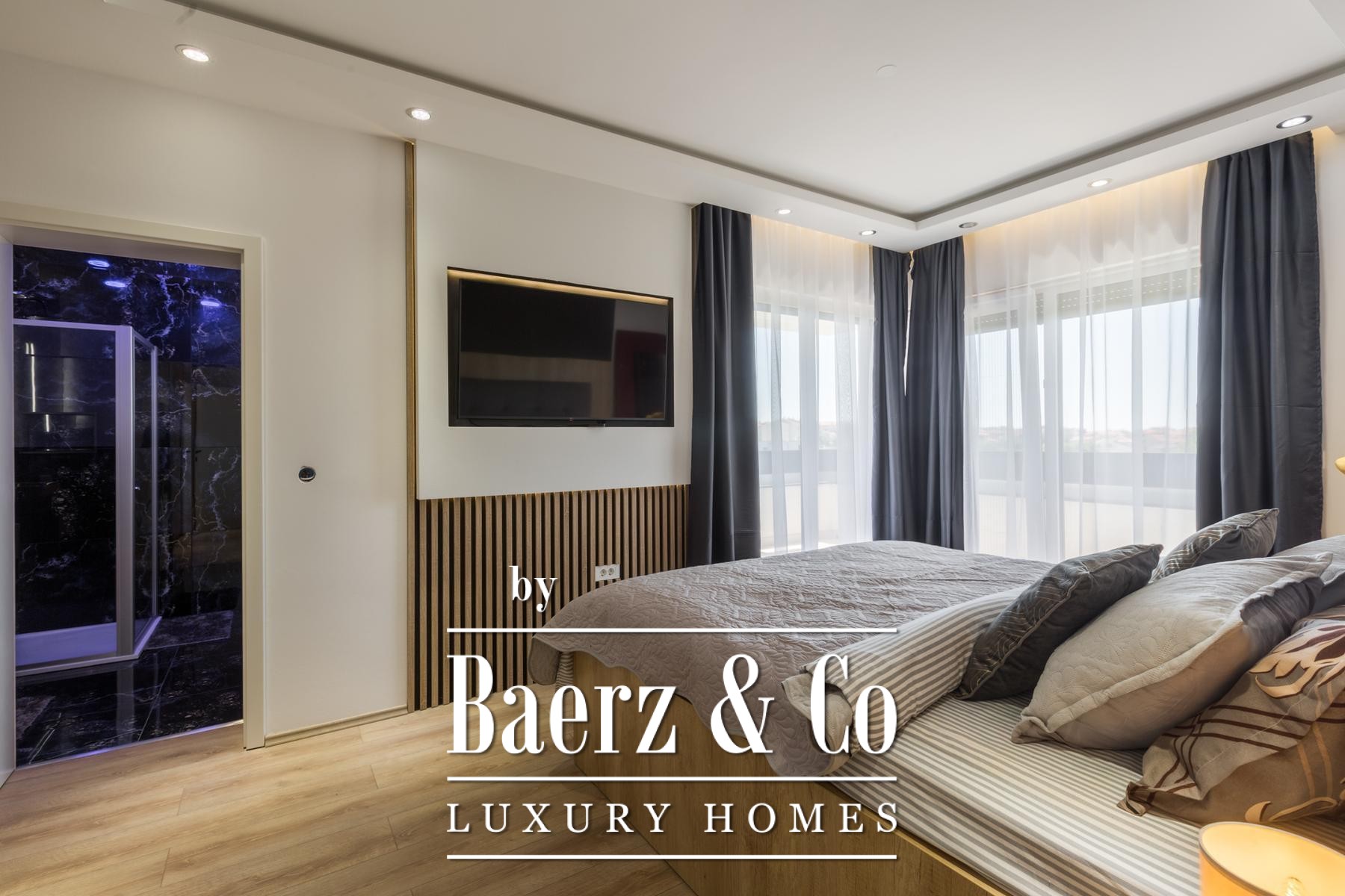Ascending a sculptural staircase reveals three serene bedrooms, each with en suite bathrooms appointed in premium finishes. The master suite distinguishes itself with additional space, and all bedrooms access a covered terrace overlooking the garden. The villa’s smart home system orchestrates lighting, climate, and security with efficiency and discretion. Additional amenities include a fireplace, a dedicated storage room, and parking for three vehicles subtly set below the main entrance level. Delivered fully furnished with contemporary design, this luxury villa for sale in Medulin balances quiet modernity with Mediterranean warmth, placing nature, culture, and refined coastal living within reach.