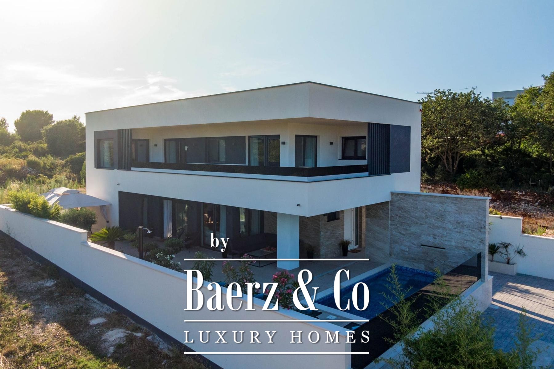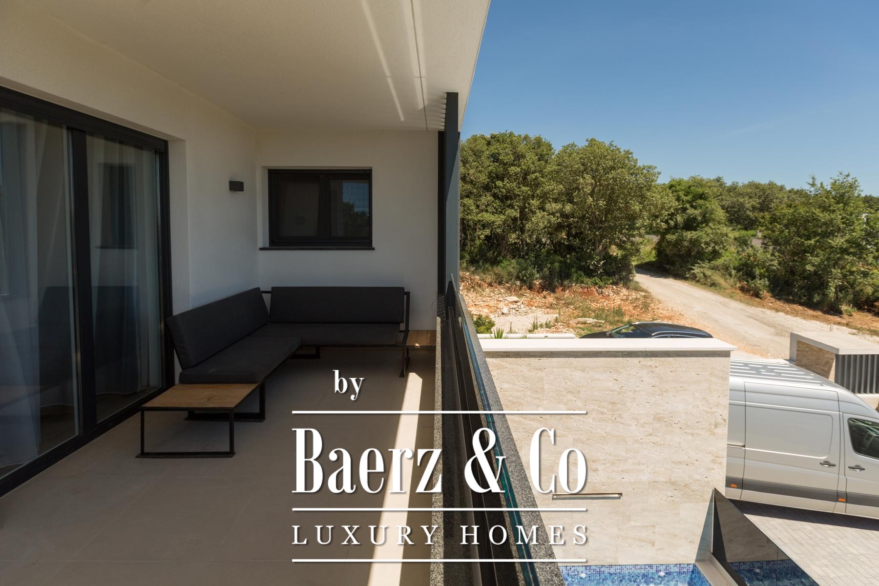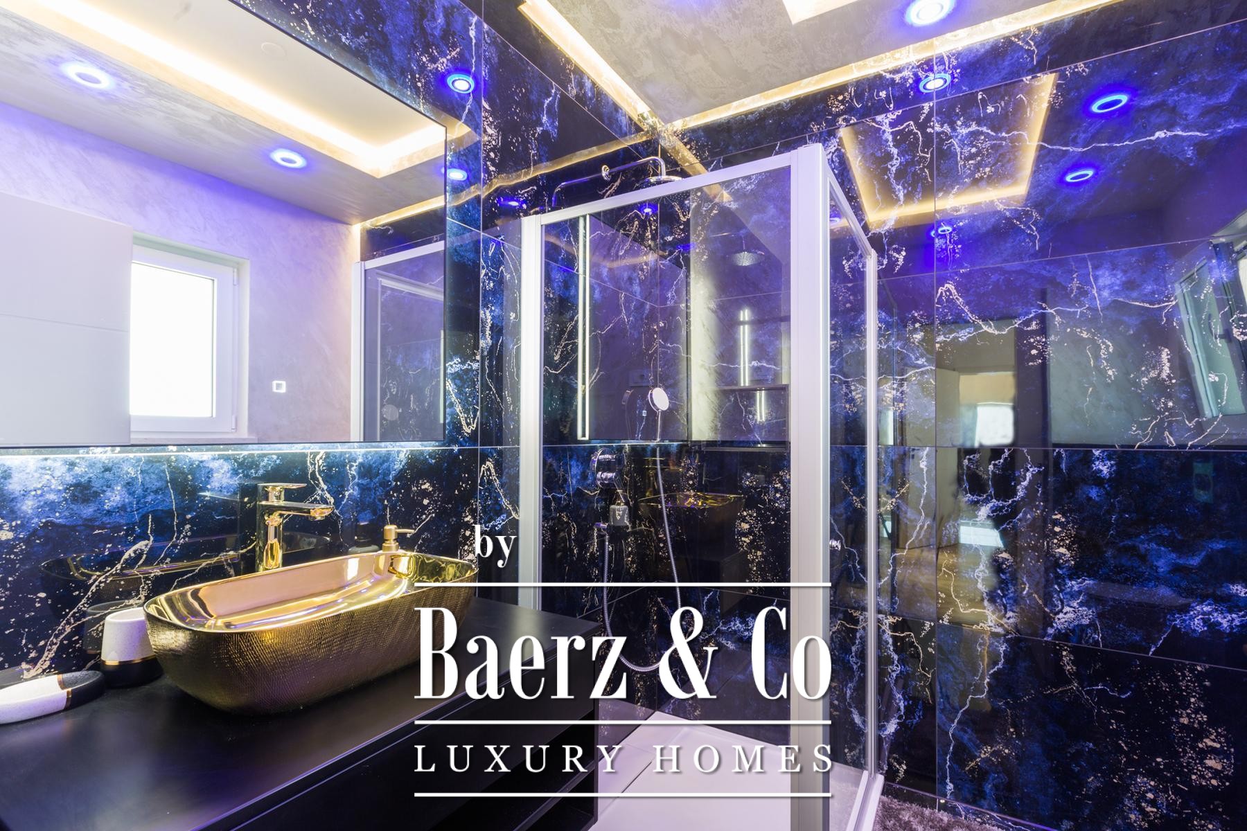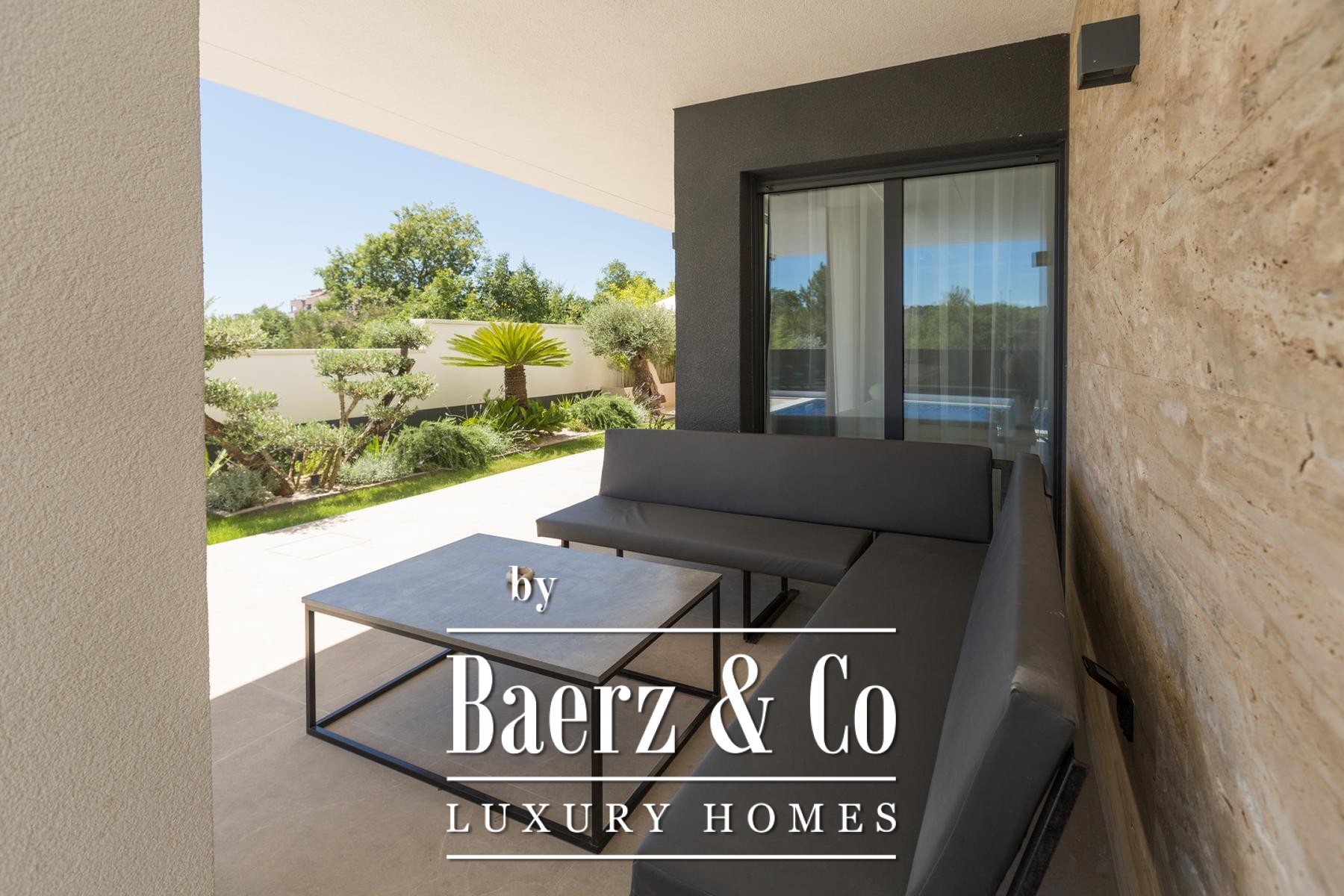 Ascending a sculptural staircase reveals three serene bedrooms, each with en suite bathrooms appointed in premium finishes. The master suite distinguishes itself with additional space, and all bedrooms access a covered terrace overlooking the garden. The villa’s smart home system orchestrates lighting, climate, and security with efficiency and discretion. Additional amenities include a fireplace, a dedicated storage room, and parking for three vehicles subtly set below the main entrance level. Delivered fully furnished with contemporary design, this luxury villa for sale in Medulin balances quiet modernity with Mediterranean warmth, placing nature, culture, and refined coastal living within reach.