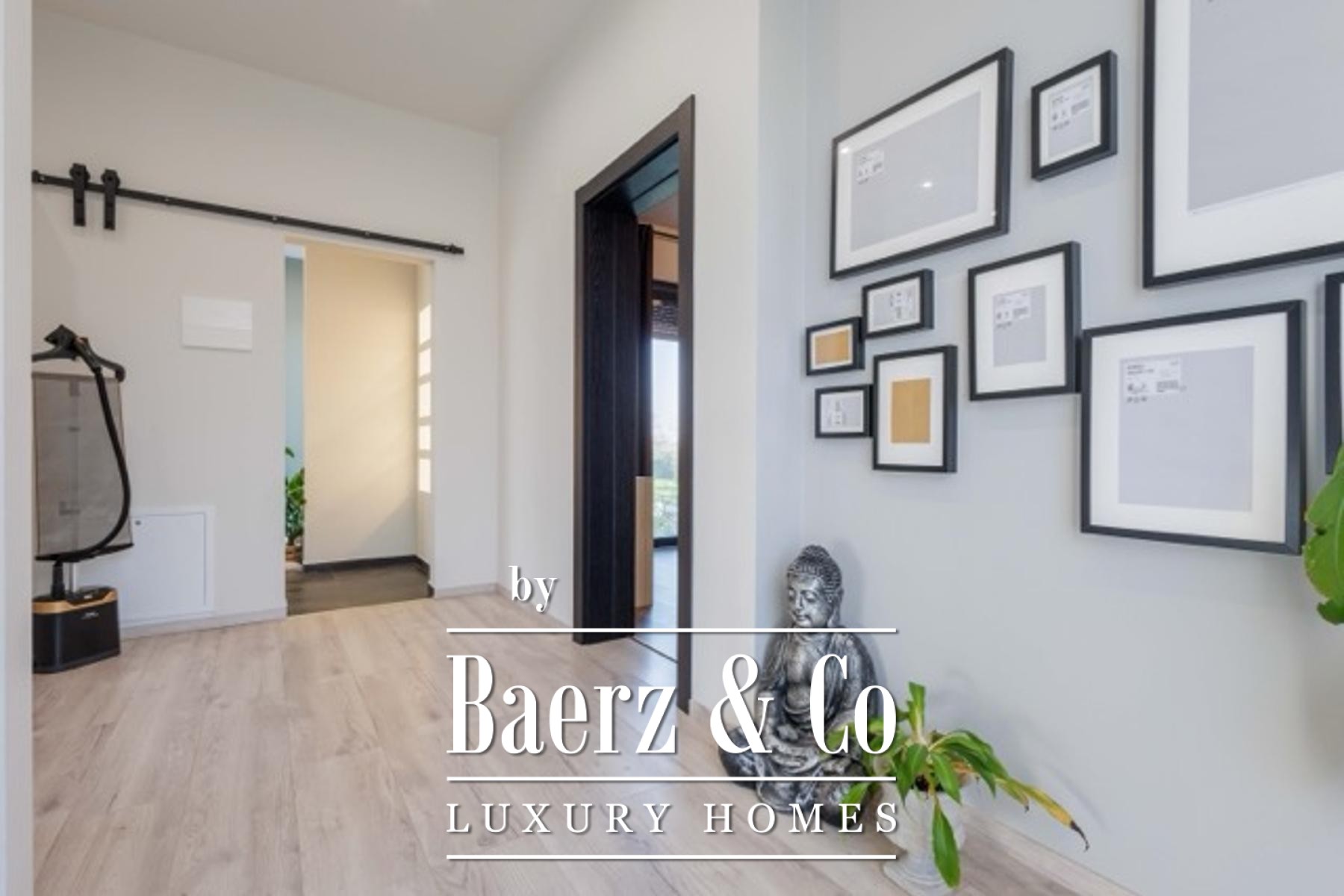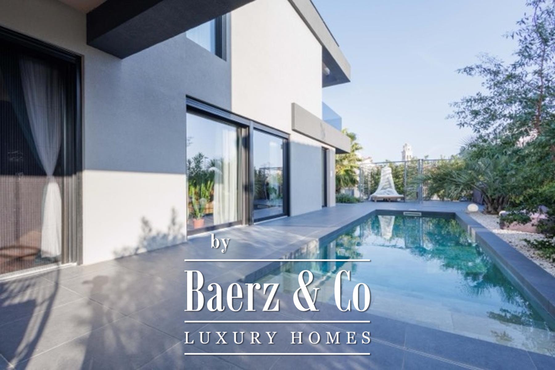 On the ground floor, an expansive living room anchors the home, featuring bespoke furnishings sourced from Germany, Italy, and the Czech Republic. The interplay of soft color palettes, a statement fireplace, and generous glazing blurs indoor and outdoor life, opening to the private pool and surrounding terrace. Adjoining rooms include a thoughtfully equipped kitchen, a guest bedroom, a toilet, additional service spaces, and direct garden access.